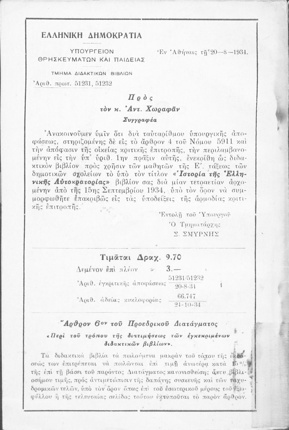 Υπουργική απόφαση / Σύμβαση: 51231,51232, 20-8-1934