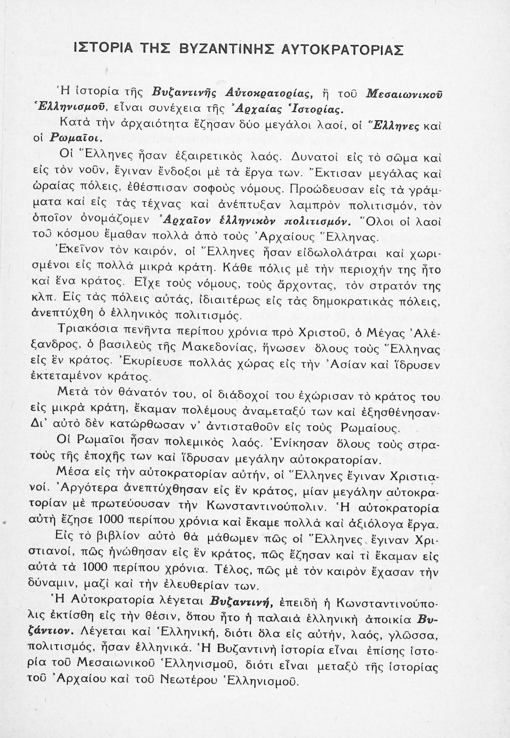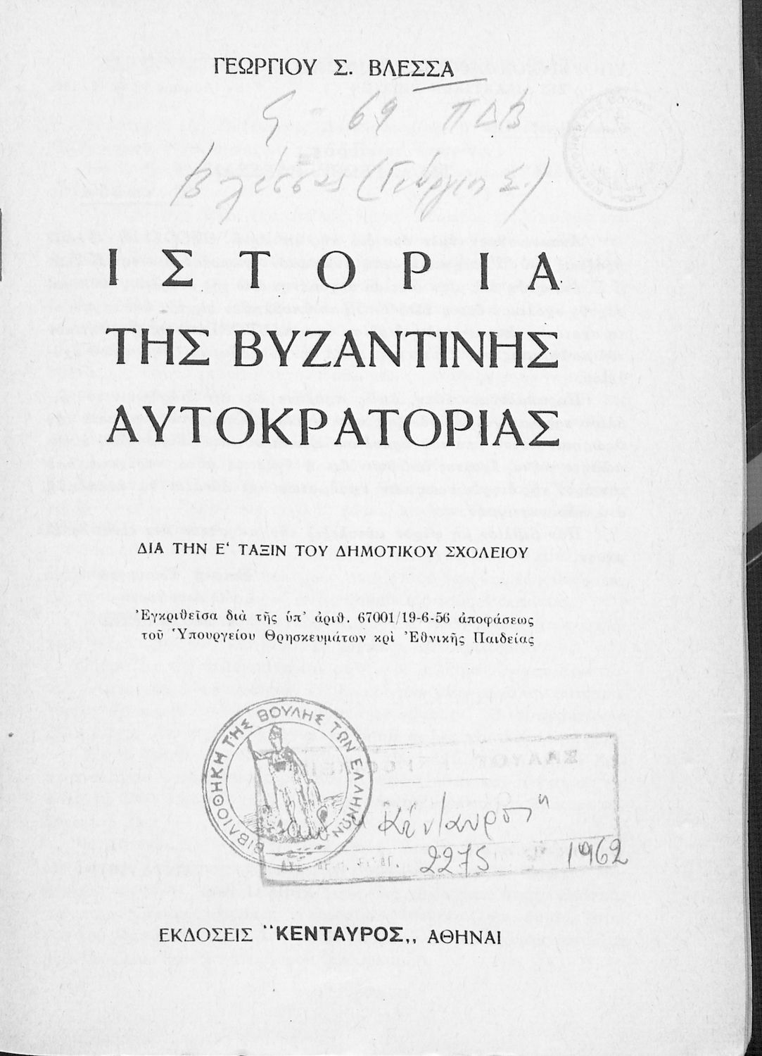 Κωδικός αναγνώρισης: 03-20561175 Τίτλος: Ιστορία της Βυζαντινής Αυτοκρατορίας. Δια την Ε' Τάξιν του Δημοτικού Σχολείου Συγγραφέας: Γεωρ. Σ. Βλέσσας Εικονογράφος: Ρένα Τζολάκη (εξώφυλλο), Μαρία Κωστάκου (εσωτερική εικονογράφηση) Μέγεθος και υπόστρωμα: Μαθητικό βοήθημα, μαλακό εξώφυλλο, 96 σελίδες. Σκίτσα, εικόνες (ασπρόμαυρα). |