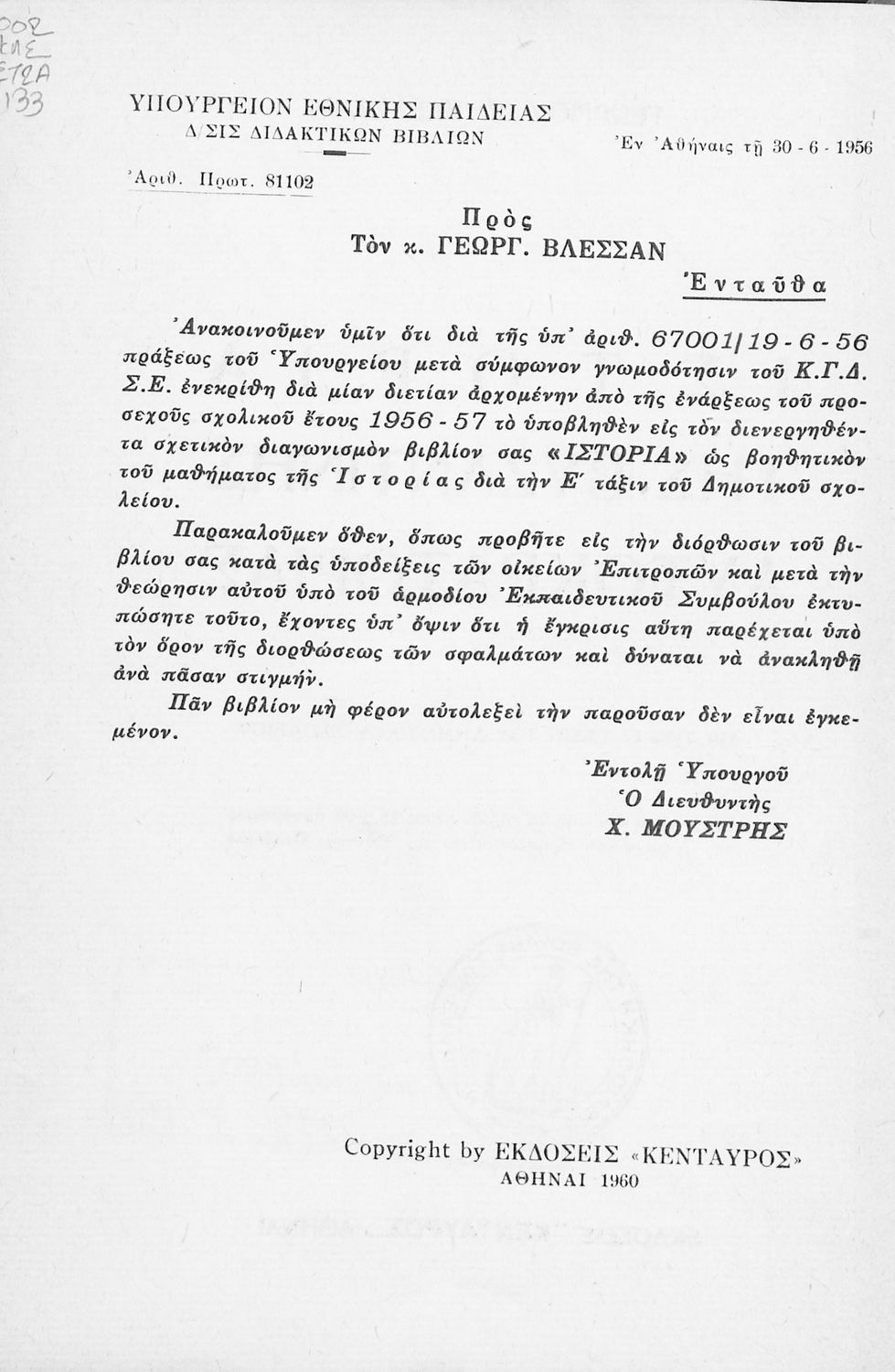 Εκδότης: Κένταυρος Έτος έκδοσης: 1962 Τόπος έκδοσης: Αθήνα Υπουργική απόφαση / Σύμβαση: 81102/30-6-1956 Έτος έγκρισης: 1956 |