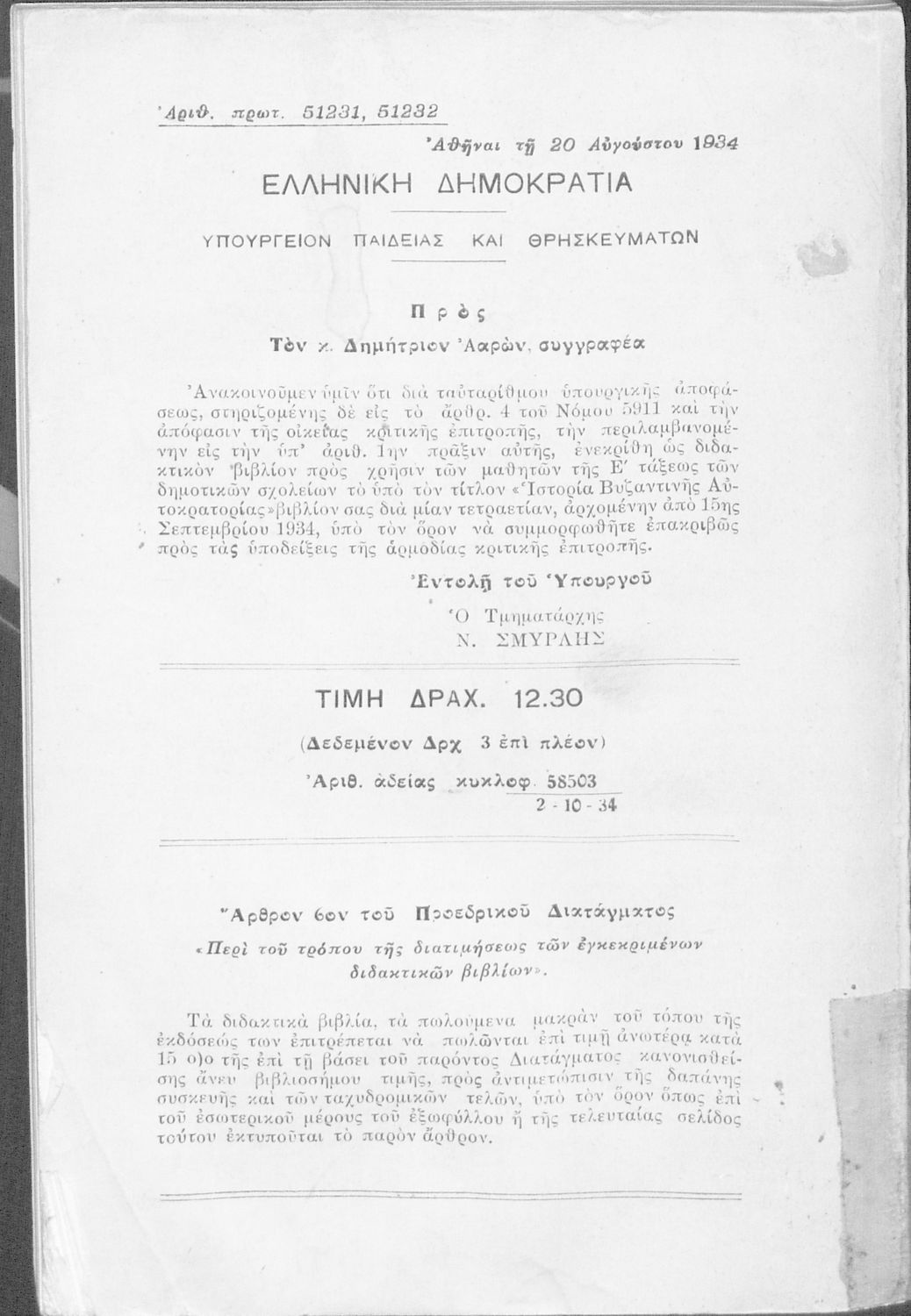 Υπουργική απόφαση / Σύμβαση: 51231, 51232/ 20-8-1934