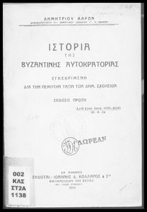 Βαθμίδα εκπαίδευσης: Πρωτοβάθμια Τάξη: Ε' Δημοτικού Μάθημα: Ιστορία Γλώσσα: Καθαρεύουσα Παρουσίαση περιεχομένου: Σχολικό εγχειρίδιο Ιστορίας Ε΄ Γυμνασίου που καλύπτει την περίοδο από την άνοδο του Μ. Κωνσταντίνου στο θρόνο ως την άλωση της Κωνσταντινούπολης. |
