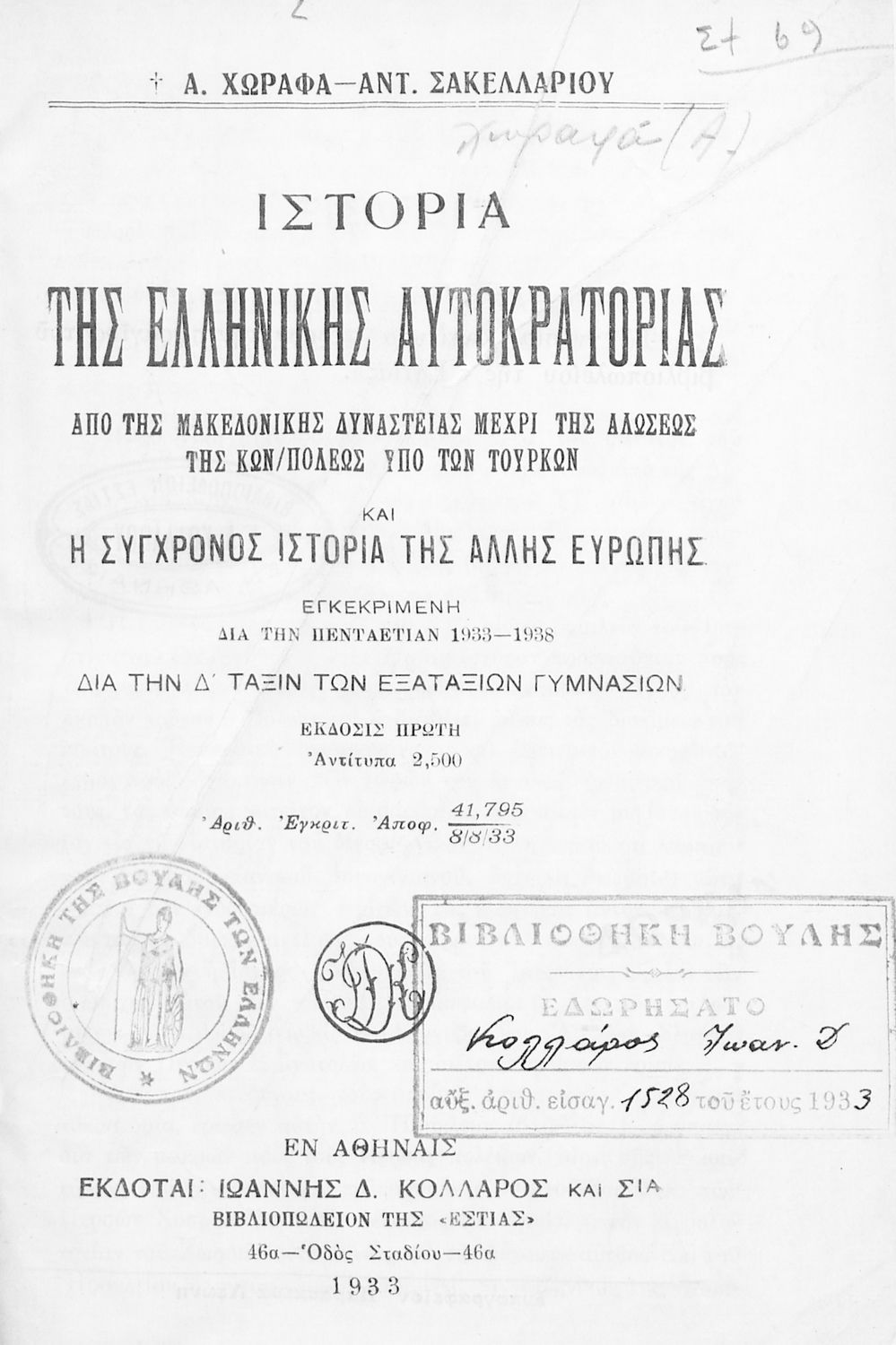 Κωδικός αναγνώρισης: 03-20561181 Τίτλος: Ιστορία της Ελληνικής Αυτοκρατορίας. Από της Μακεδονικής Ηγεμονίας μέχρι της αλώσεως της Κωνσταντινουπόλεως υπό των Τούρκων. Και η σύγχρονος Ιστορία της Ευρώπης. Δια την Δ΄ τάξιν των Εξατάξιων Γυμνασίων Συγγραφέας: Αντ. Ν. Χωραφάς, Αντ. Β. Σακελλάριος Μέγεθος και υπόστρωμα: Σχολικό εγχειρίδιο, σκληρό εξώφυλλο, 36 σελίδες. Σκίτσα, εικόνες, χάρτες (ασπρόμαυρα). |