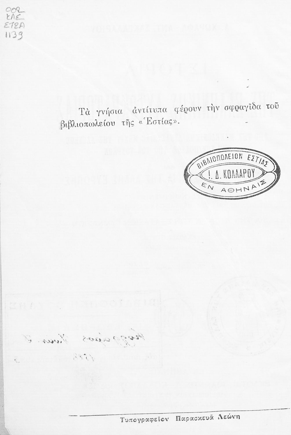 Εκδότης: Ιωάννης Δ. Κολλάρος και ΣΙΑ, Βιβλιοπωλείο της "Εστίας" Έτος έκδοσης: 1933 Τόπος έκδοσης: Αθήνα Έκδοση: 1η Υπουργική απόφαση / Σύμβαση: 41795/8-8-1933 Έτος έγκρισης: 1933 |