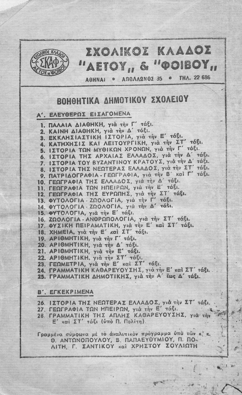 Εκδότης: Σχολικός κλάδος "Αετός" και "Φοίβος" Έτος έκδοσης: 1950 Τόπος έκδοσης: Αθήνα Υπουργική απόφαση / Σύμβαση: 50709/2-6-1950 Έτος έγκρισης: 1950 |