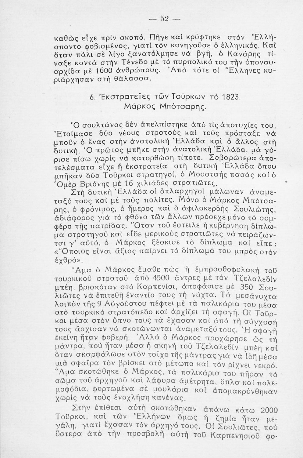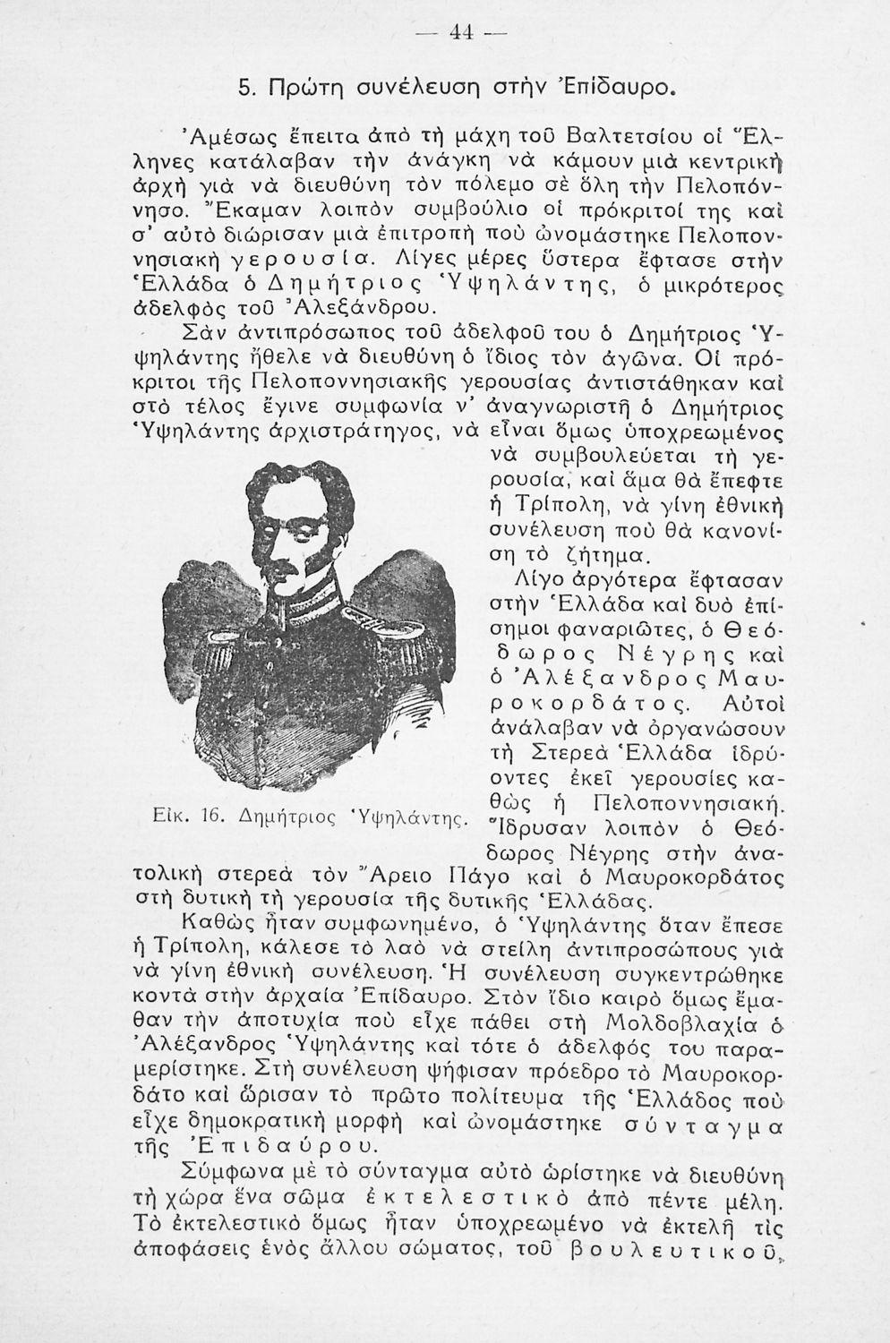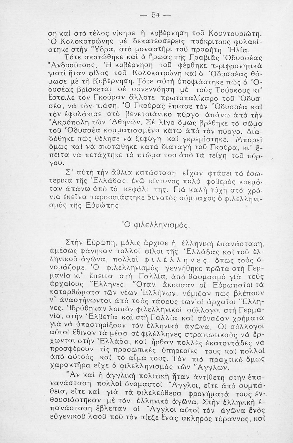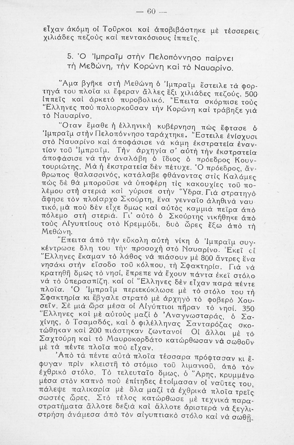 Βαθμίδα εκπαίδευσης: Πρωτοβάθμια Τάξη: ΣΤ' Δημοτικού Μάθημα: Ιστορία Γλώσσα: Απλή καθαρεύουσα Παρουσίαση περιεχομένου: Το σύγγραμμα ήταν σχολικό εγχειρίδιο για μάθημα της Ιστορίας στο Δημοτικό. Αναφέρεται στα ιστορικά γεγονότα από την περίοδο της Οθωμανικής Αυτοκρατορίας και τη διοίκηση των ελληνικών κοινοτήτων, την οργάνωση της Ελληνικής Επανάστασης και μετά αναφέρεται διεξοδικά στα γεγονότα της Επανάστασης του 1821. Έπειτα στα χρόνια του ανεξάρτητου ελληνικού κράτους και την ανάπτυξη και τις πολιτικές της Μ. Ιδέας και του Αλυτρωτισμού. |