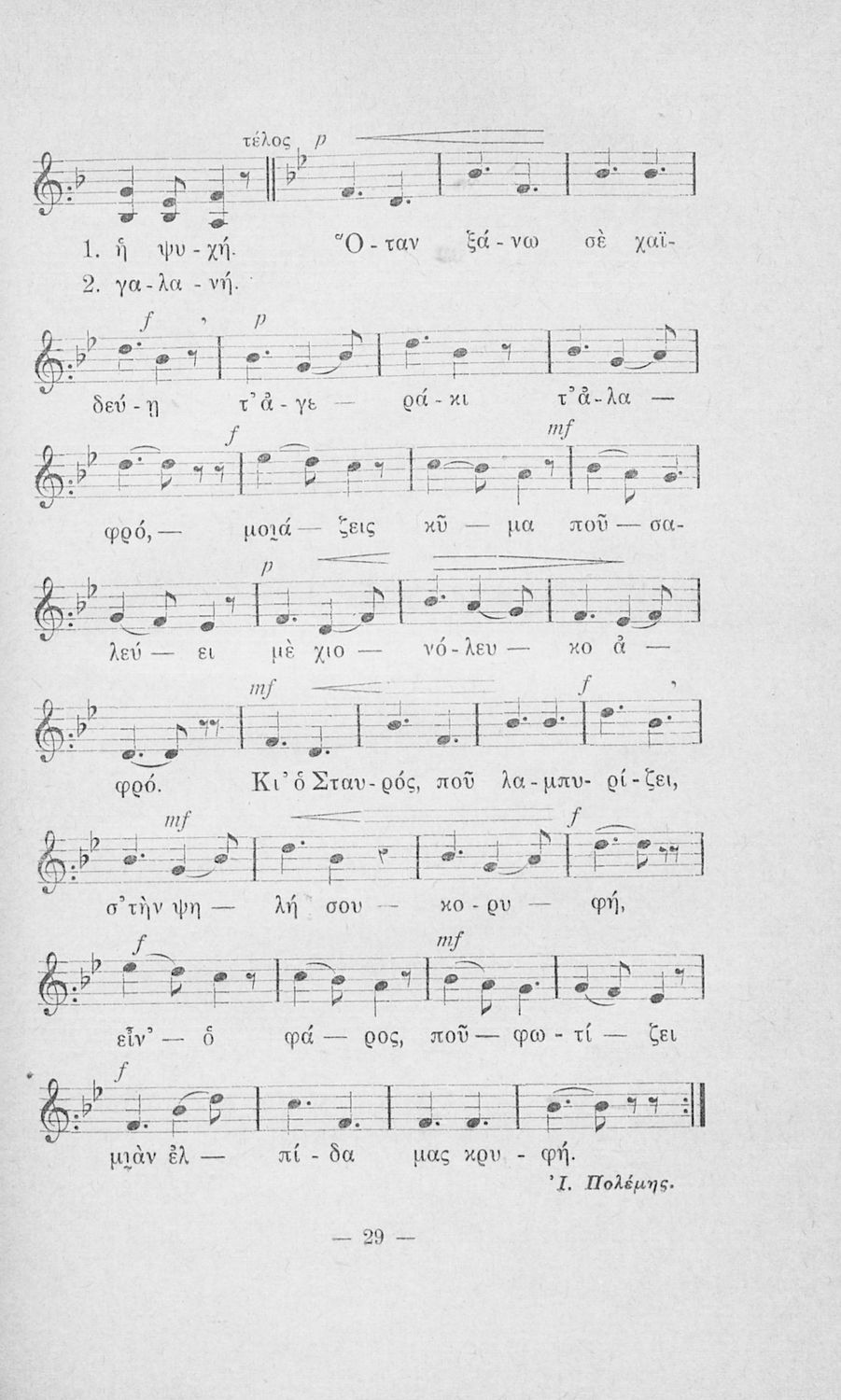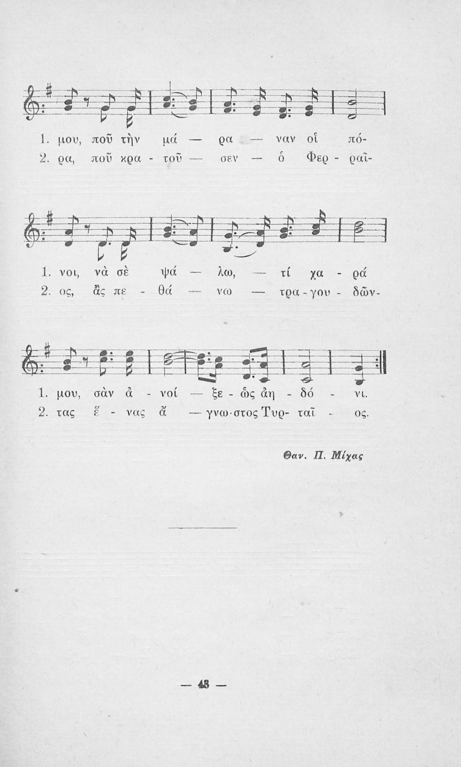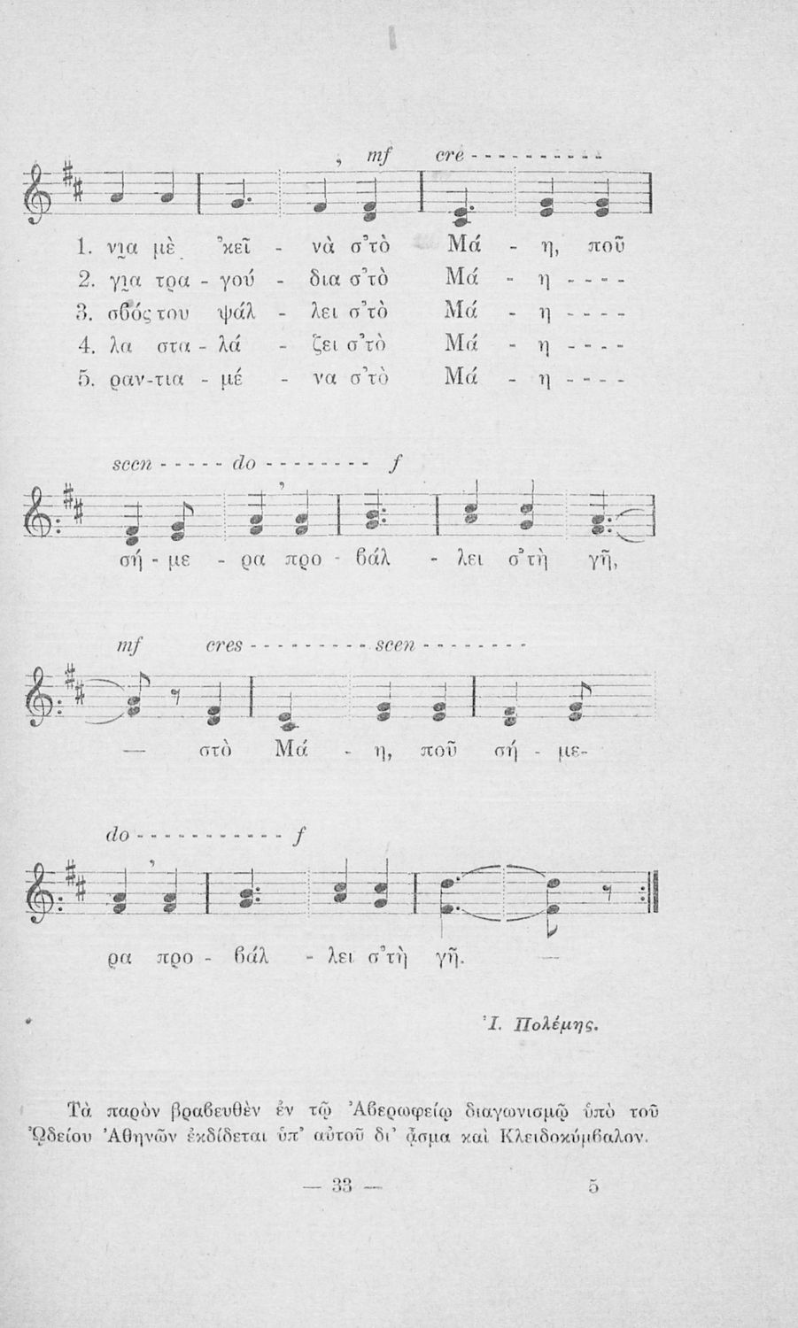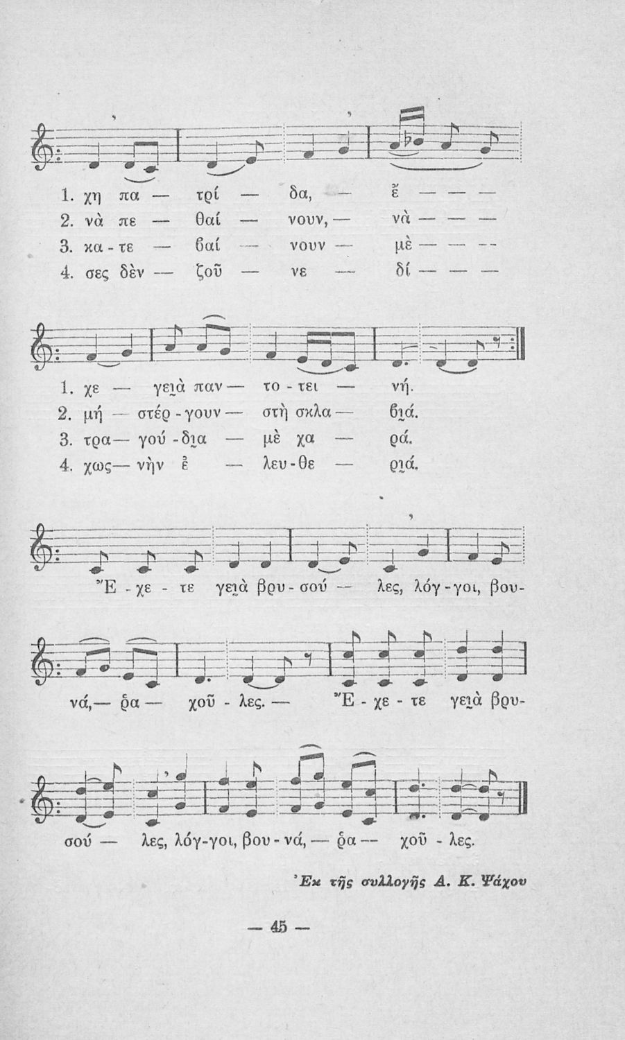 Σχολικό εγχειρίδιο του Δημοτικού για το μάθημα της Μουσικής. Περιέχει συλλογή τραγουδιών με παρτιτούρες. Μερικά από τα τραγούδια είναι μελοποιημένα ποιήματα.