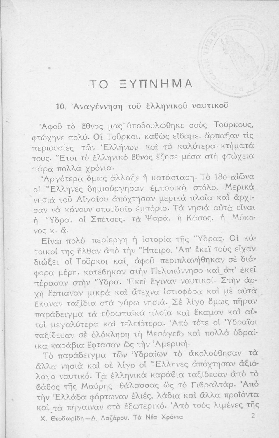 Σχολικό εγχειρίδιο για την ΣΤ΄ Τάξη Δημοτικού για το μάθημα της Ιστορίας. Περιλαμβάνει τα ιστορικά γεγονότα από την προεπαναστατική περίοδο και μετά αναλύει διεξοδικά τα χρόνια της Επανάστασης του 1821. Κλείνει με την συνοπτική αναφορά στη διοίκηση του ελληνικού κράτους κατά τα χρόνια του Όθωνα, του Γεωργίου Α΄, Κωνσταντίνου και Γεωργίου Β΄ . Αναφέρεται ακόμα πιο συνοπτικά στο Β΄ Παγκόσμιο Πόλεμο, την Κατοχή μέχρι και την αποχώρηση των Γερμανών.