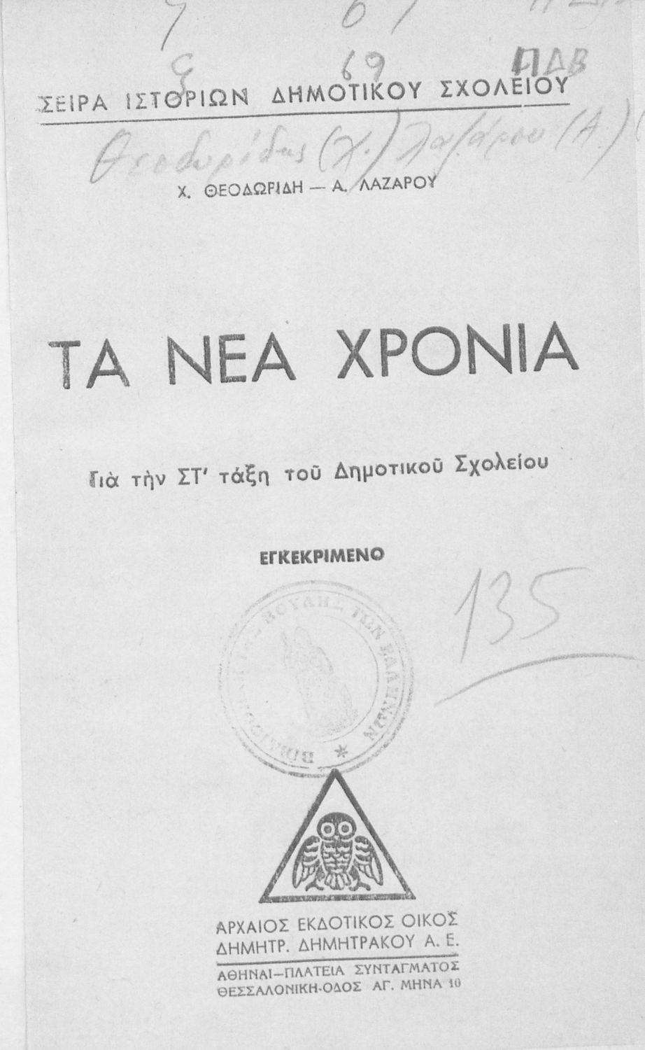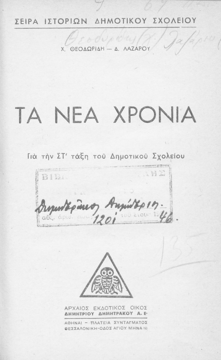 Κωδικός αναγνώρισης: 03-20561205 Τίτλος: Τα Νέα Χρόνια. Για την ΣΤ΄ του Δημοτικού Σχολείου Συγγραφέας: Χ. Θεοδωρίδης, Α. Λαζάρου Μέγεθος και υπόστρωμα: Σχολικό εγχειρίδιο, σκληρό εξώφυλλο, 119 σελίδες. Σκίτσα, εικόνες, χάρτες (ασπρόμαυρα). |