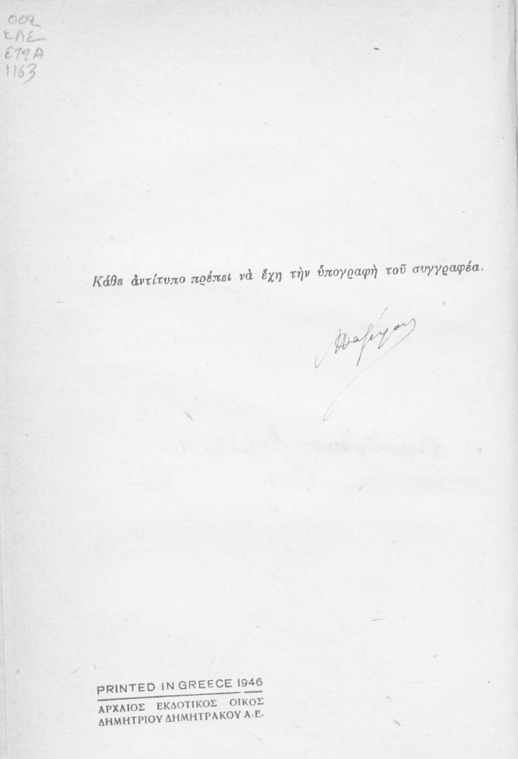 Εκδότης: Δημ. Δημητράκος Α. Ε Έτος έκδοσης: 1946 Τόπος έκδοσης: Αθήνα |