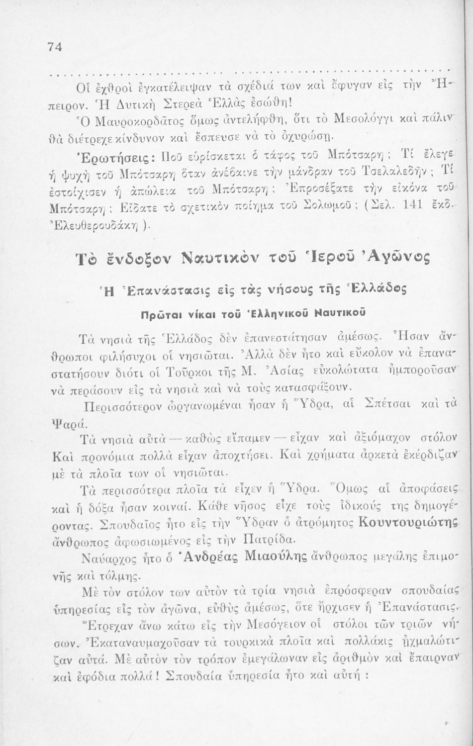 LDR 01713 2200205 4500 035 ## _a03-20561210 040 ## _aΒιβλιοθήκη της Βουλής των Ελλήνων 041 ## _ael 100 ## _aΧ. Δημητρακόπουλος 110 ## _a20561210 245 0# _aΟι απελευθερωτικοί αγώνες του έθνους. Ιστορία ΣΤ΄ Δημοτικού 260 ## _aΑθήνα _bΝ. Αλικιώτης _c1950 300 ## _a152 _bΣκίτσα, εικόνες, χάρτες (ασπρόμαυρα) 520 ## _aΣχολικό εγχειρίδιο για την ΣΤ΄ Τάξη Δημοτικού για το μάθημα της Ιστορίας. Περιλαμβάνει τα ιστορικά γεγονότα από την προεπαναστατική περίοδο και μετά αναλύει διεξοδικά τα χρόνια της Επανάστασης του 1821. Κλείνει με την συνοπτική αναφορά στη διοίκηση του ελληνικού κράτους κατά τα χρόνια του Όθωνα, του Γεωργίου Α΄, Κωνσταντίνου και Γεωργίου Β΄ . Αναφέρεται ακόμα πιο συνοπτικά στο Β΄ Παγκόσμιο Πόλεμο, την Κατοχή μέχρι και την αποχώρηση των Γερμανών. 521 ## _aΣΤ' Δημοτικού 522 ## _aΕλλάδα 546 ## _aΑπλή καθαρεύουσα 563 ## _aΜαλακό Εξώφυλλο 583 ## _a51702/15-6-1950 _c1950 650 #4 _aΒ΄ Παγκόσμιος _aΕλλάδα _aΕπανάσταση 1821 _aΙστορία _aΚαποδίστριας _aΚατοχή _aΜεγάλη Ιδέα _aΌθωνας