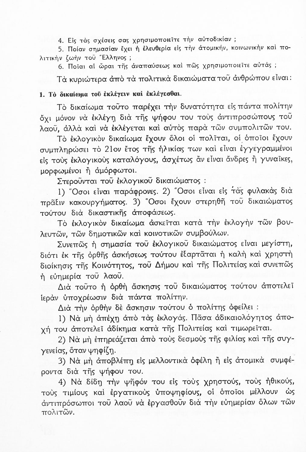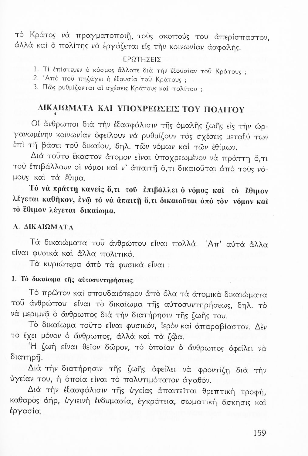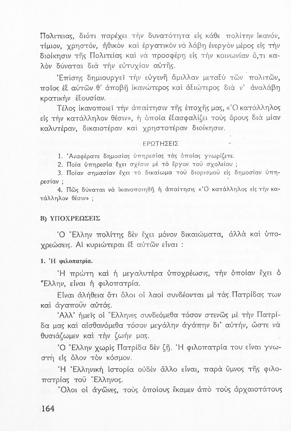 Σχολικό εγχειρίδιο Αγωγής του Πολίτη για τη ΣΤ΄ Δημοτικού που αναλύει τους εθνικούς και διεθνείς οικονομικούς, πολιτικούς και πολιτειακούς θεσμούς. Το βιβλίο εξαίρει τη δικτατορία των συνταγματαρχών και υιοθετεί τον εθνικιστικό και αντικομμουνιστικό της λόγο.