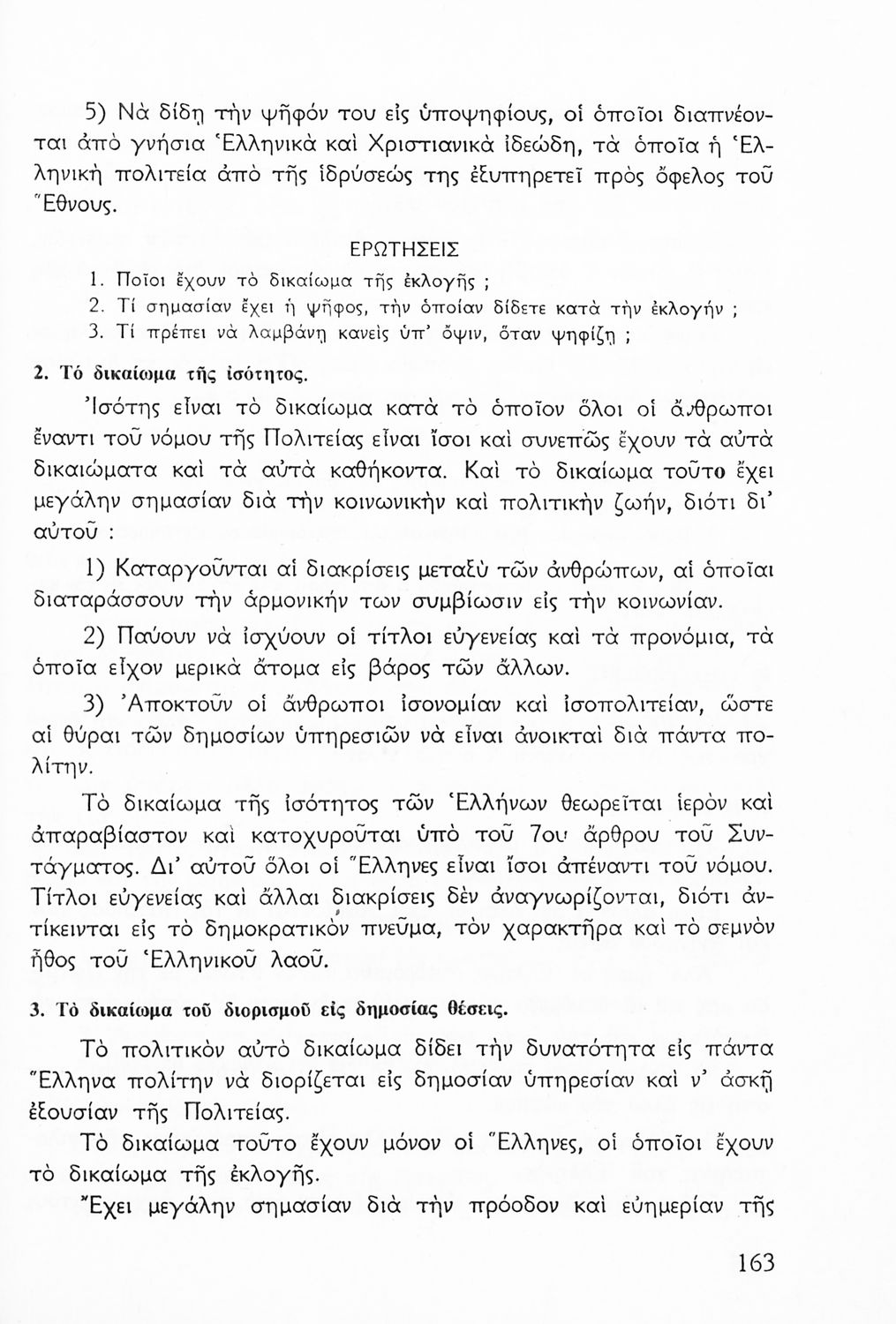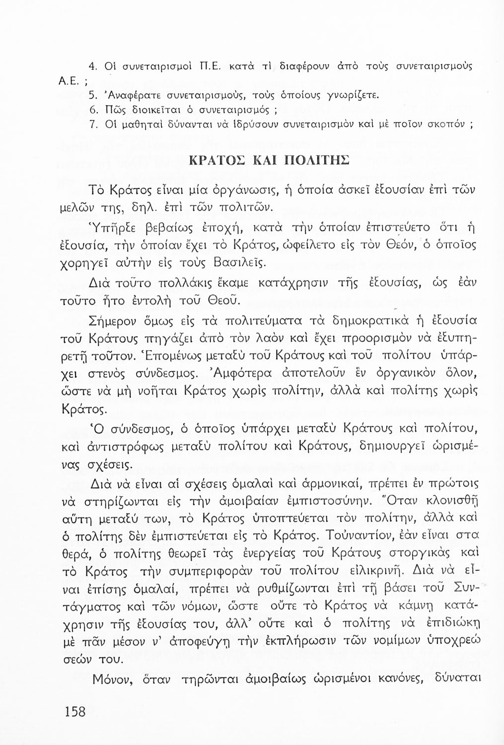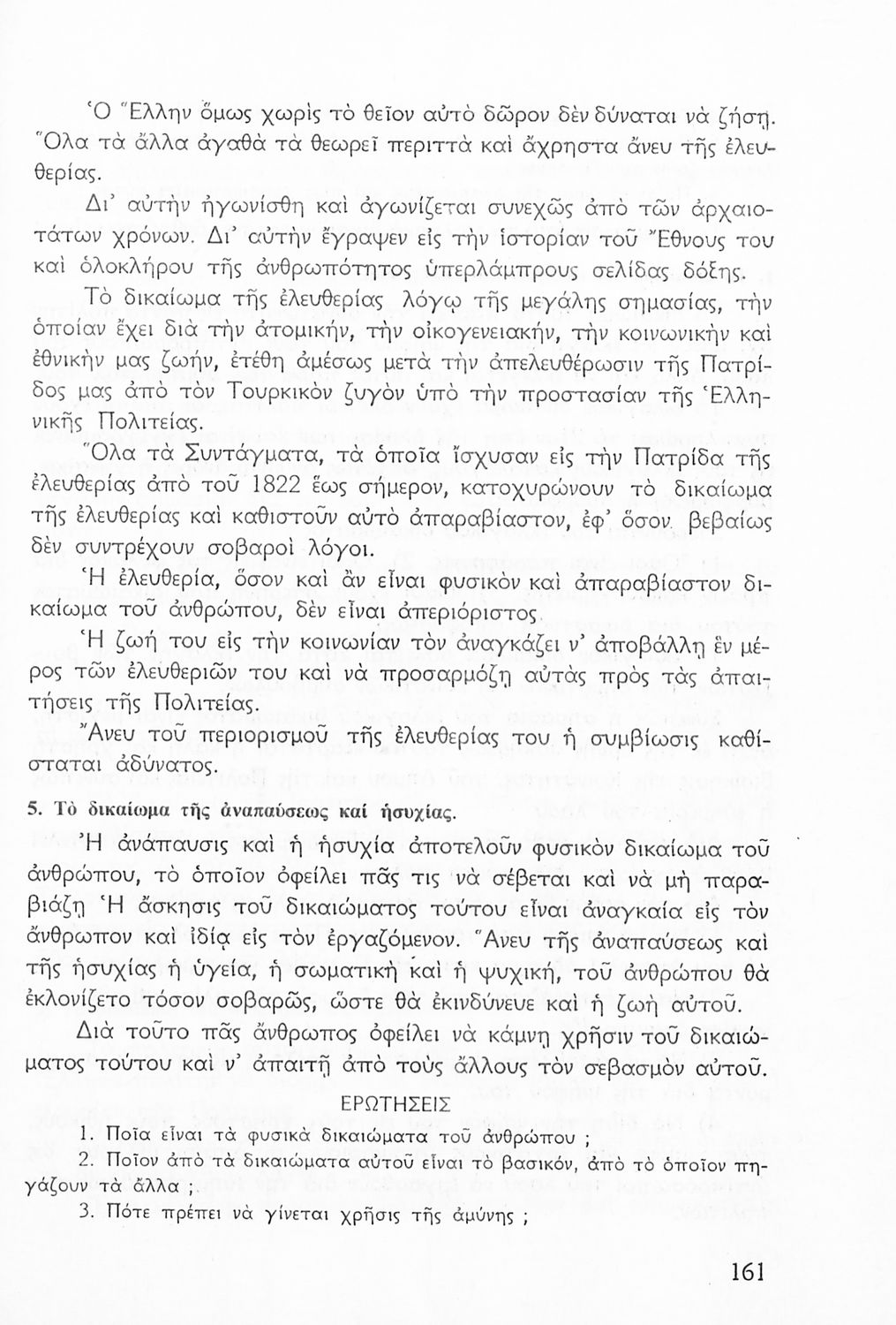 Σχολικό εγχειρίδιο Αγωγής του Πολίτη για τη ΣΤ΄ Δημοτικού που αναλύει τους εθνικούς και διεθνείς οικονομικούς, πολιτικούς και πολιτειακούς θεσμούς. Το βιβλίο εξαίρει τη δικτατορία των συνταγματαρχών και υιοθετεί τον εθνικιστικό και αντικομμουνιστικό της λόγο.