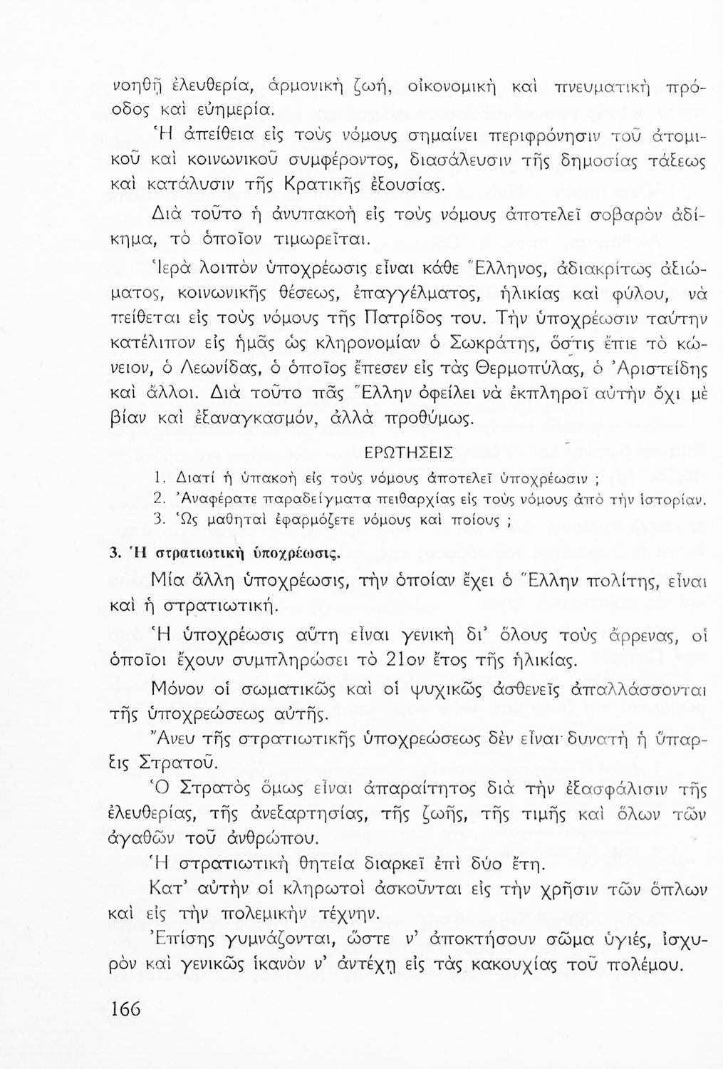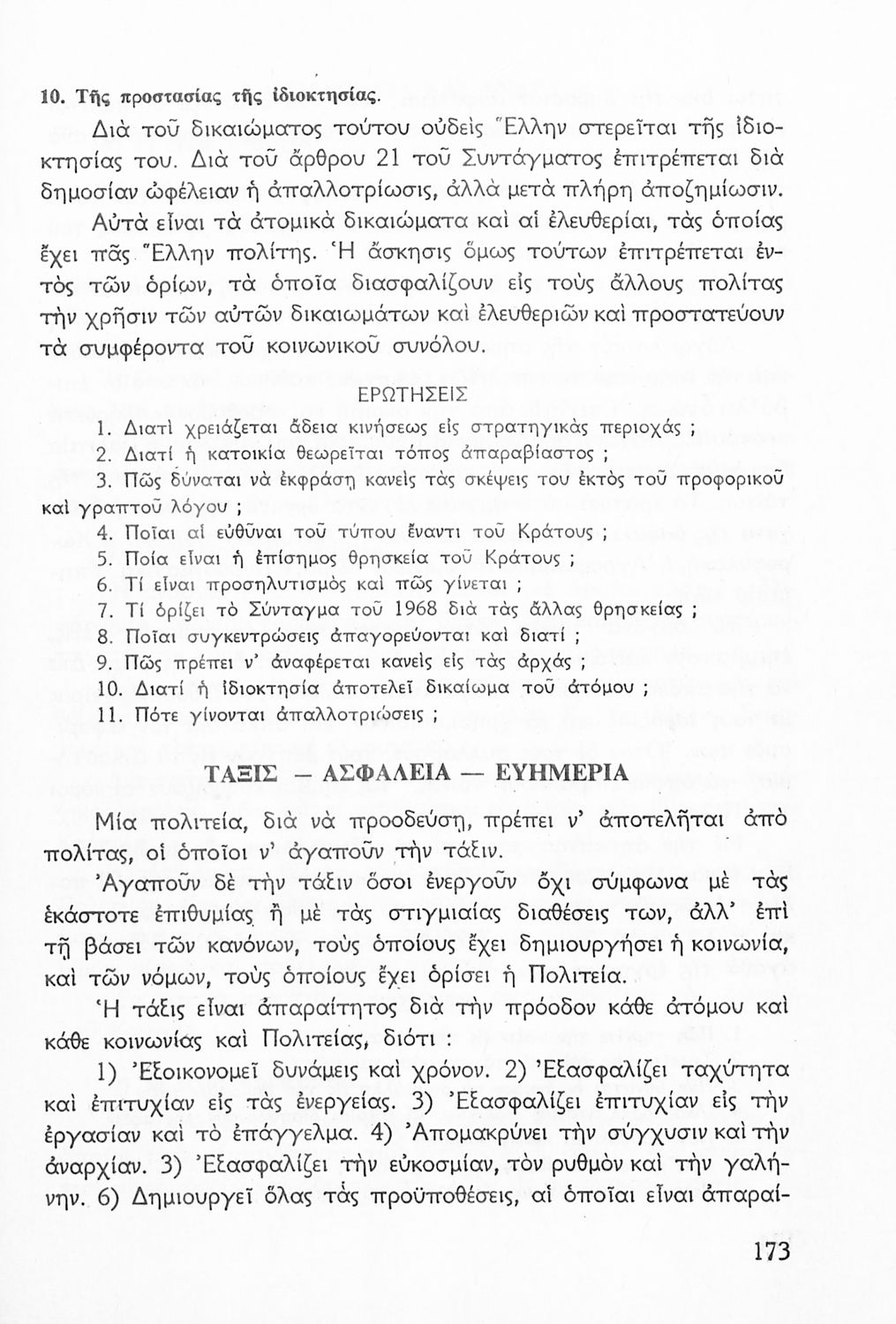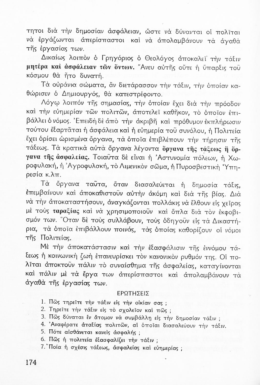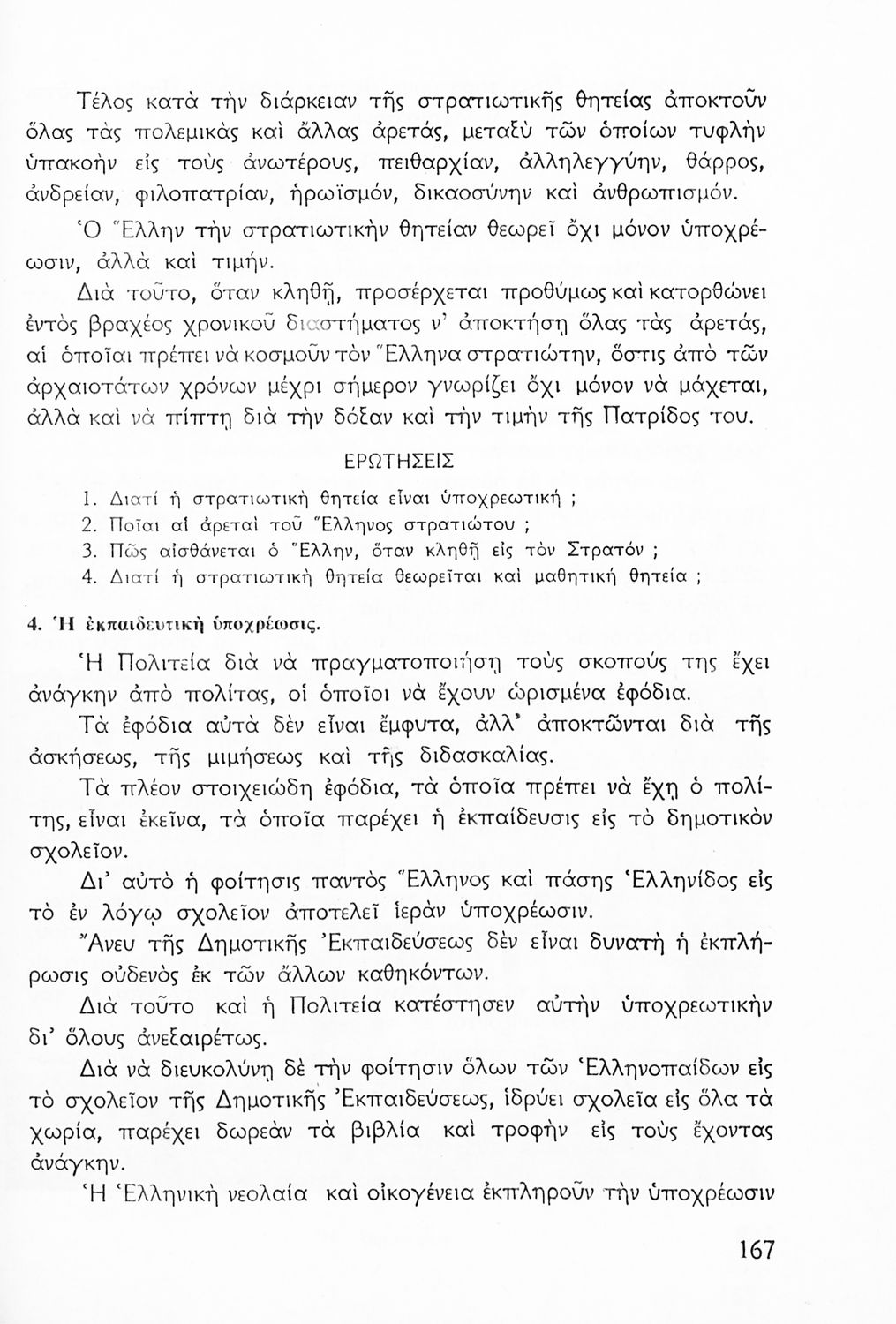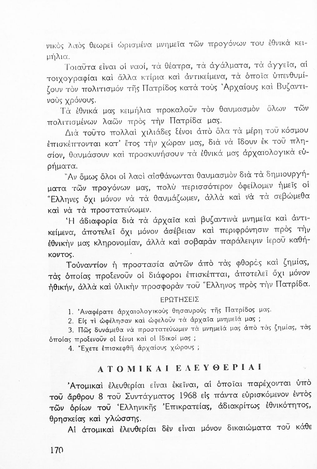 Σχολικό εγχειρίδιο Αγωγής του Πολίτη για τη ΣΤ΄ Δημοτικού που αναλύει τους εθνικούς και διεθνείς οικονομικούς, πολιτικούς και πολιτειακούς θεσμούς. Το βιβλίο εξαίρει τη δικτατορία των συνταγματαρχών και υιοθετεί τον εθνικιστικό και αντικομμουνιστικό της λόγο.
