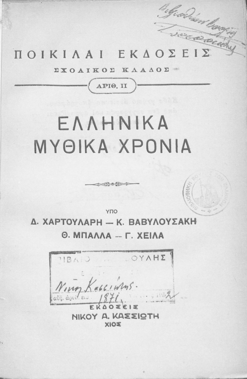Εκδότης: Ν. Α. Κασσιώτης Έτος έκδοσης: 1951 Τόπος έκδοσης: Χίος Έτος έγκρισης: 1951 |