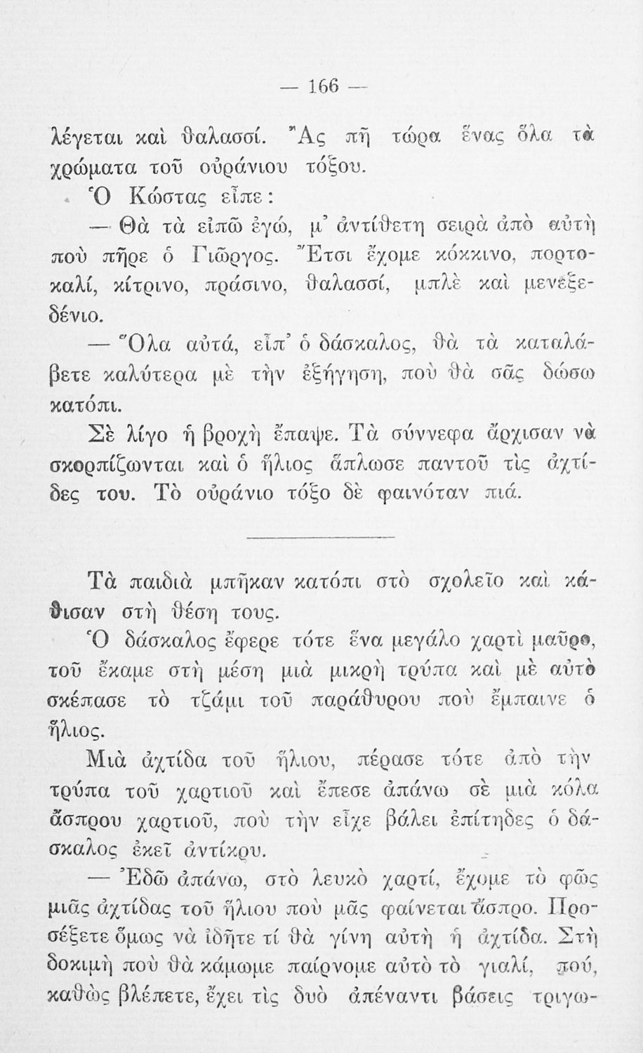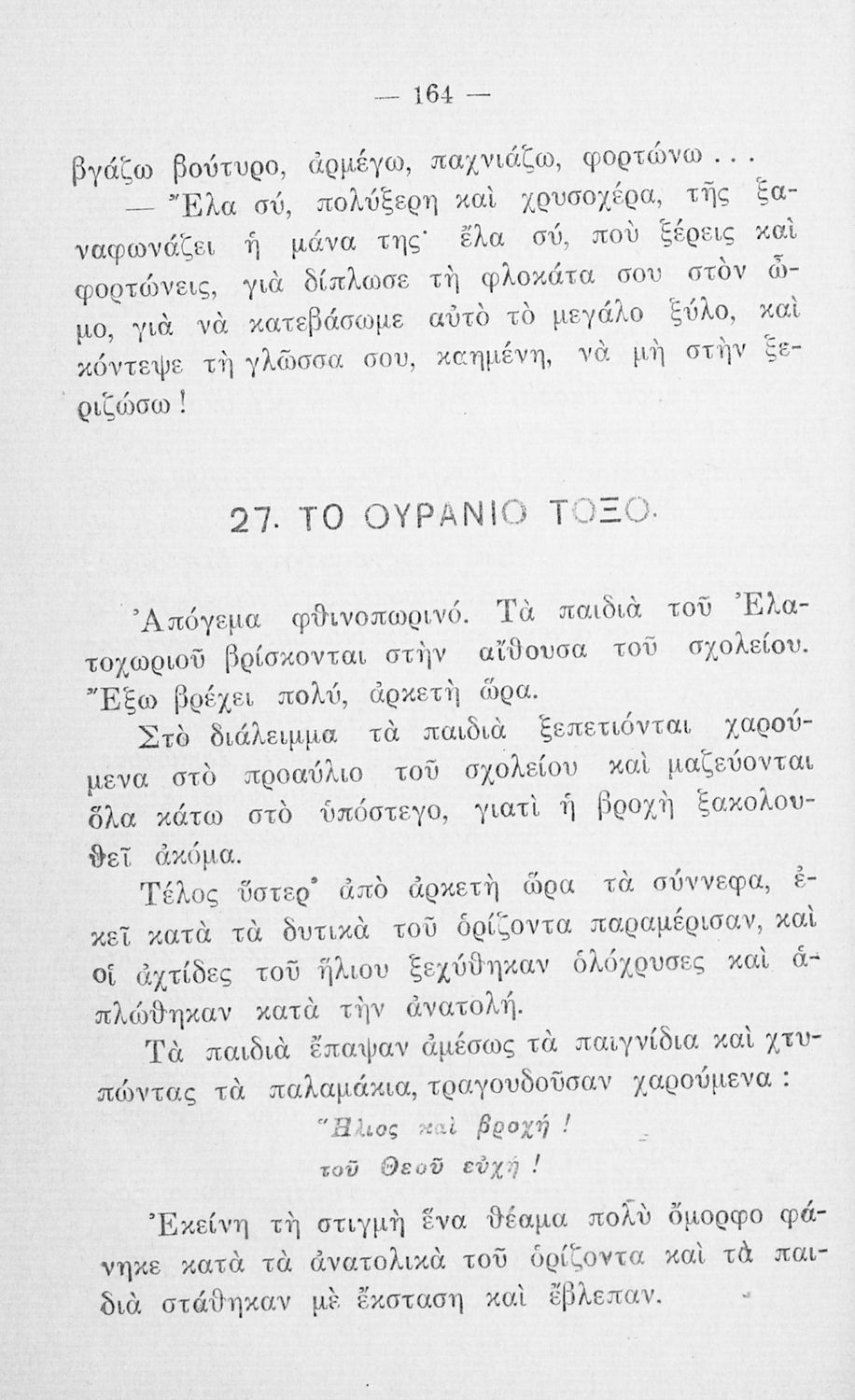 Αναγνωστικό ΣΤ΄ Δημοτικού για το μάθημα της Γλώσσας. Περιέχει πεζά και ποιήματα, με περιεχόμενο πατριωτικό και ηθικοπλαστικό. Η γλώσσα είναι δημοτική και το ύφος είναι απλό. Περιέχει εικόνες, οι οποίες οπτικοποιούν τα κείμενα.