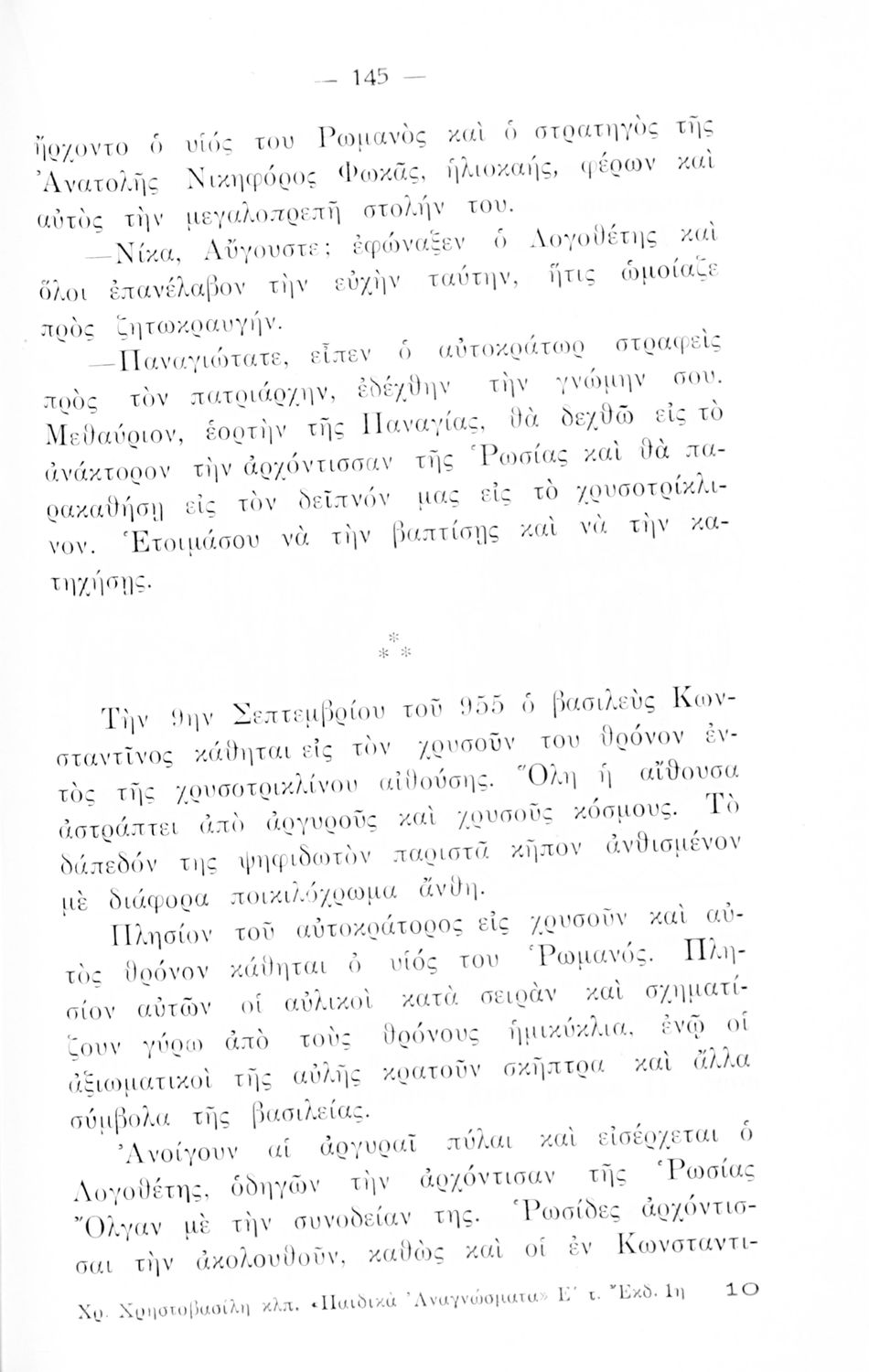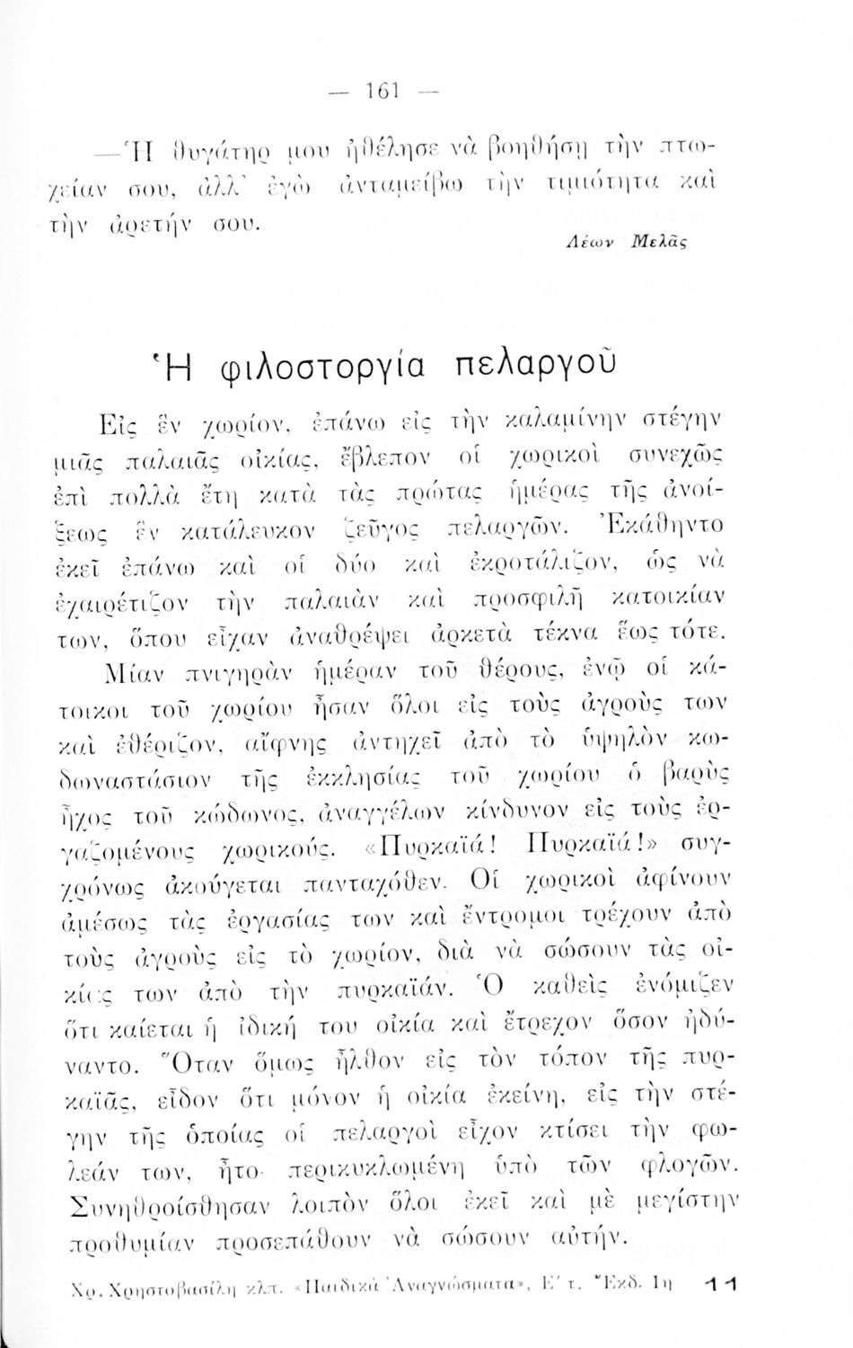 Αναγνωστικό Δ' Δημοτικού που περιέχει πεζά και κείμενα εμπνευσμένα από ιστορικά γεγονότα, τη θρησκευτική και κοινωνική ζωή και τη φύση. Ο συγγραφέας ήταν δάσκαλος.