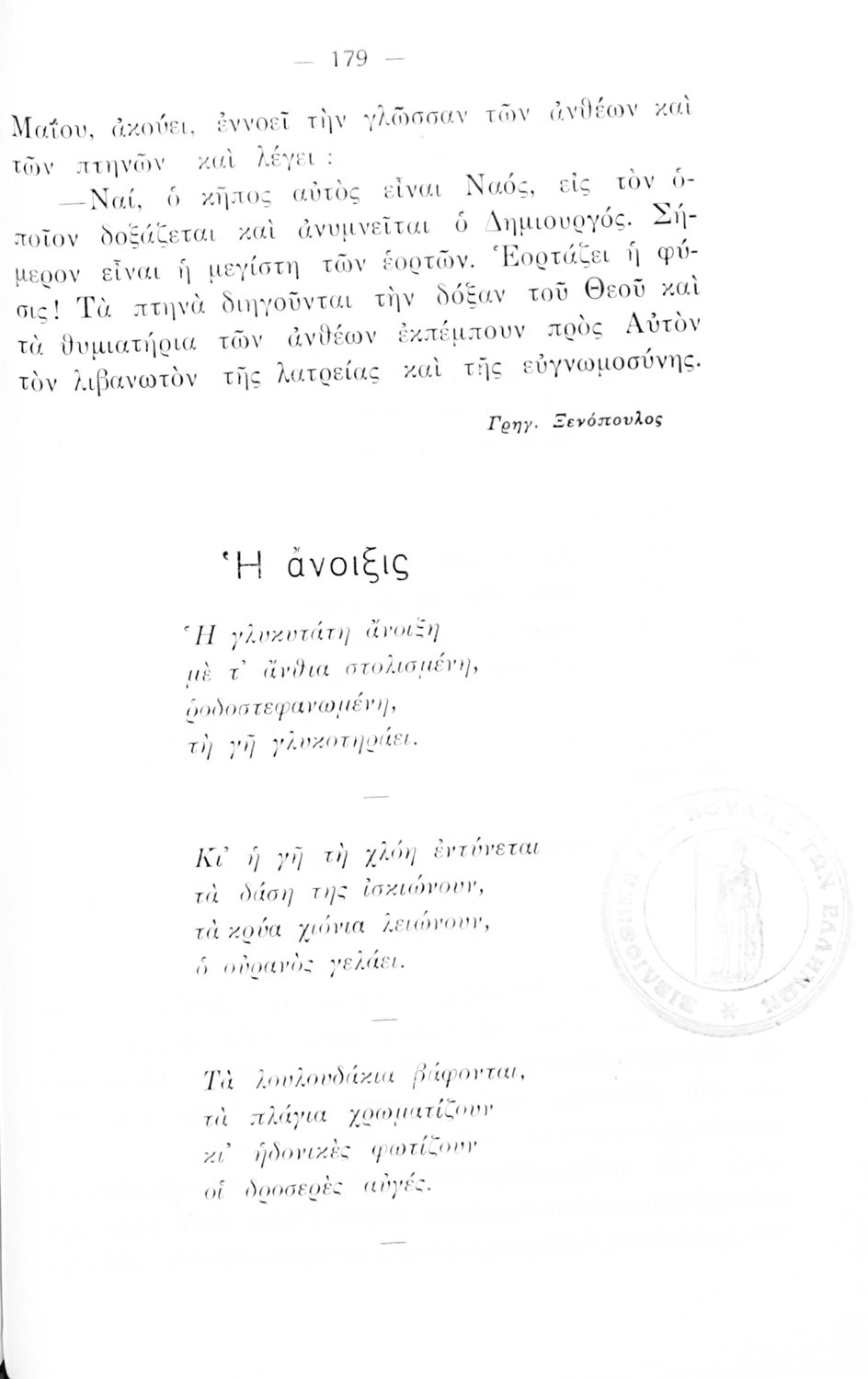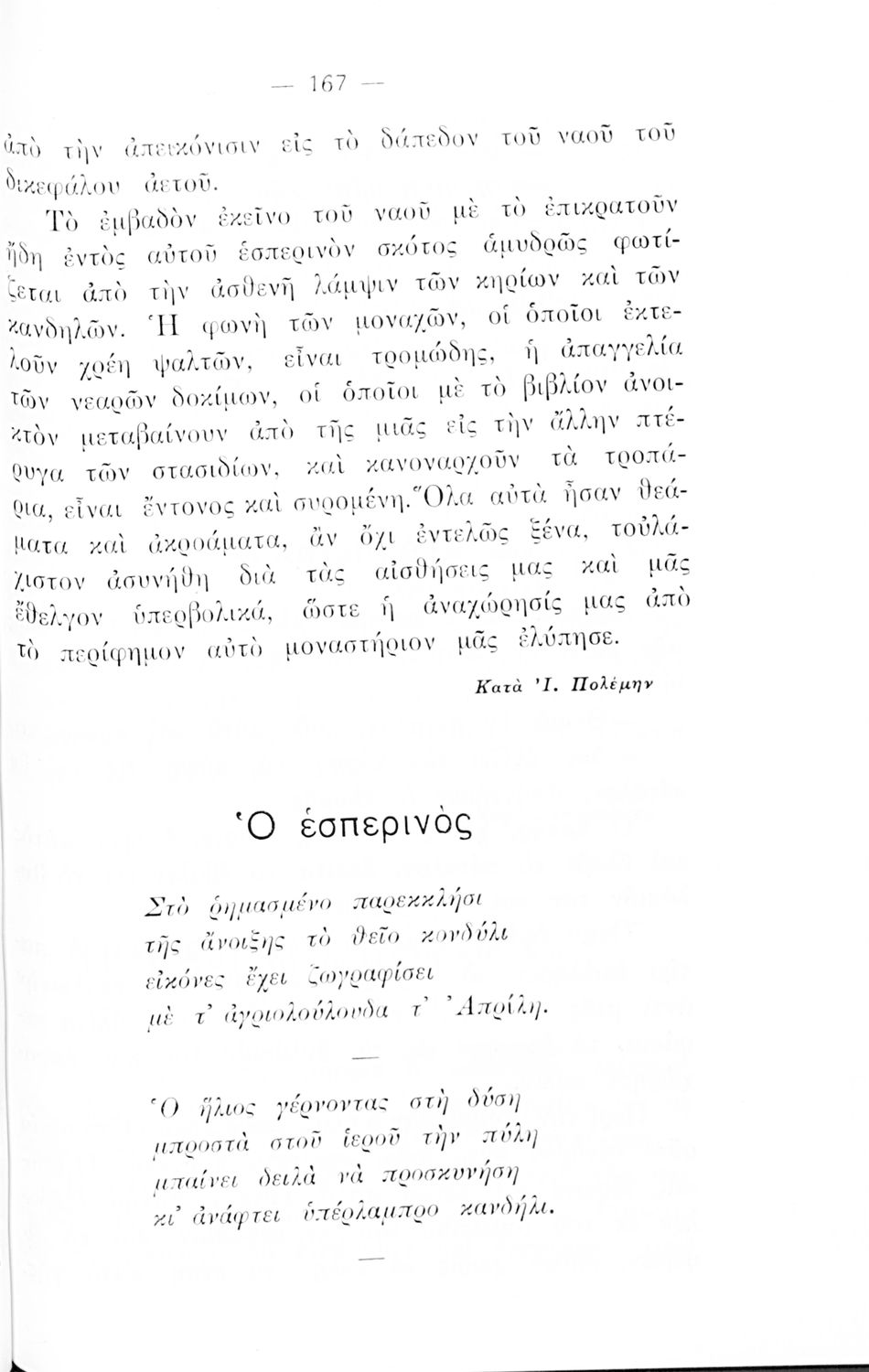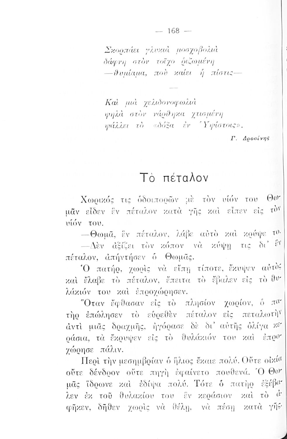 Αναγνωστικό Δ' Δημοτικού που περιέχει πεζά και κείμενα εμπνευσμένα από ιστορικά γεγονότα, τη θρησκευτική και κοινωνική ζωή και τη φύση. Ο συγγραφέας ήταν δάσκαλος.