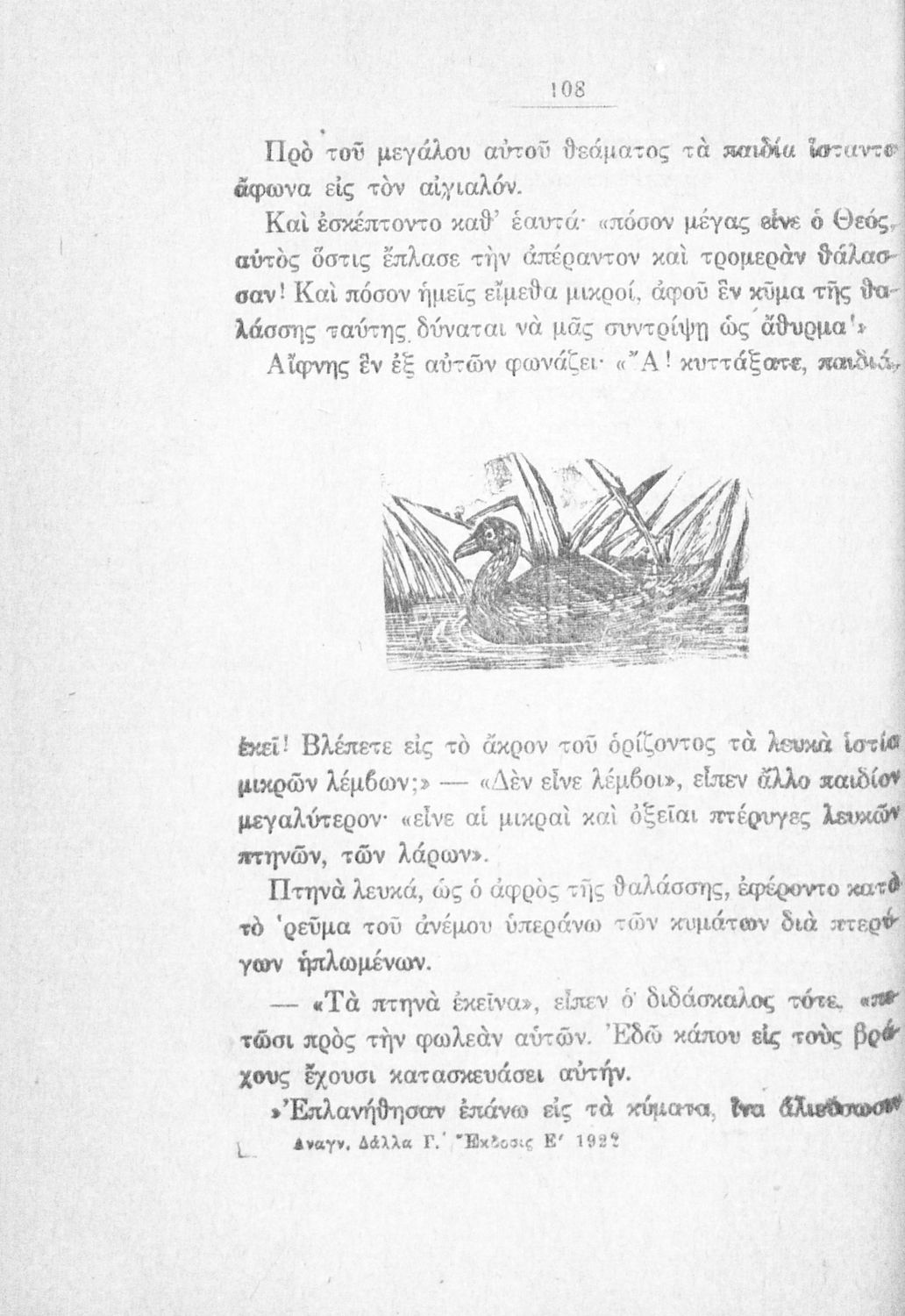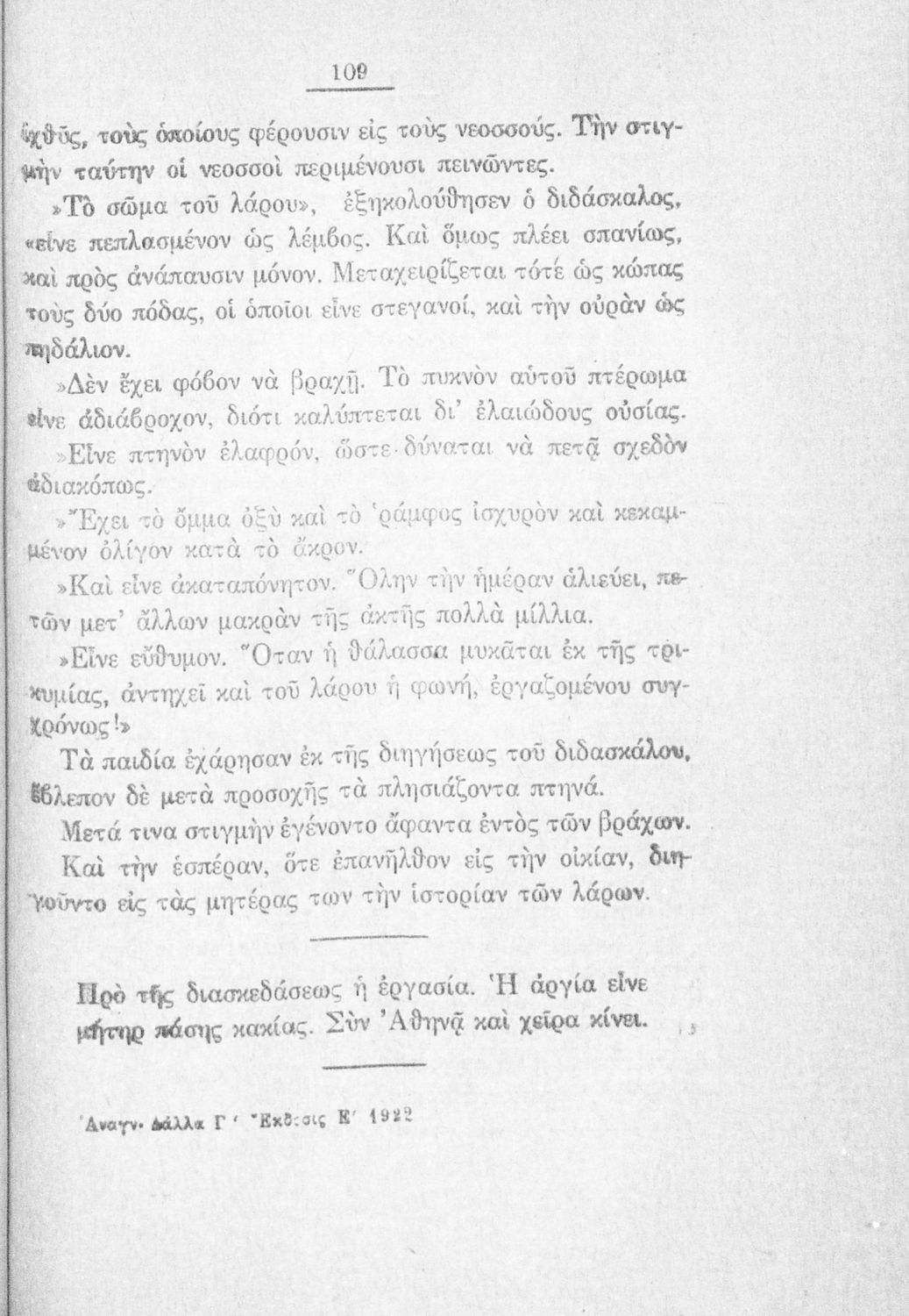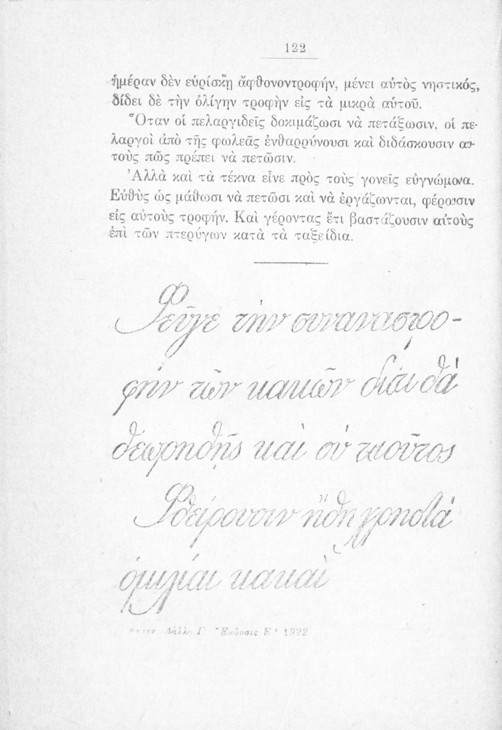 Αναγνωστικό του Δημοτικού. Περιέχει κείμενα της Γαλάτειας Καζαντζάκη. Στο τέλος του βιβλίου υπάρχουν καλλιγραφικά υποδείγματα από το Αναγνωσματάριο του Δημοσθένη Ανδρεάδη.