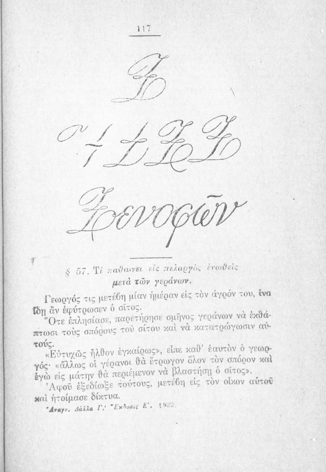 Σχολικό εγχειρίδιο Αρχαίων Ελληνικών Γ' Ελληνικού Σχολείου και Γ΄ Αστικού Σχολείου Θηλέων που περιλαμβάνει αποσπάσματα τα έργα του Ξενοφώντα Κύρου Ανάβαση και Ελληνικά και ερμηνευτικές και λεξιλογικές ...