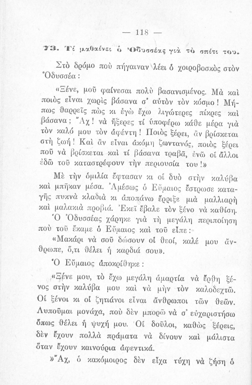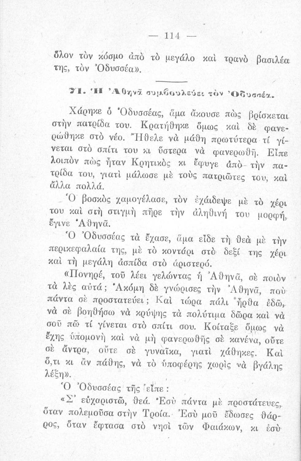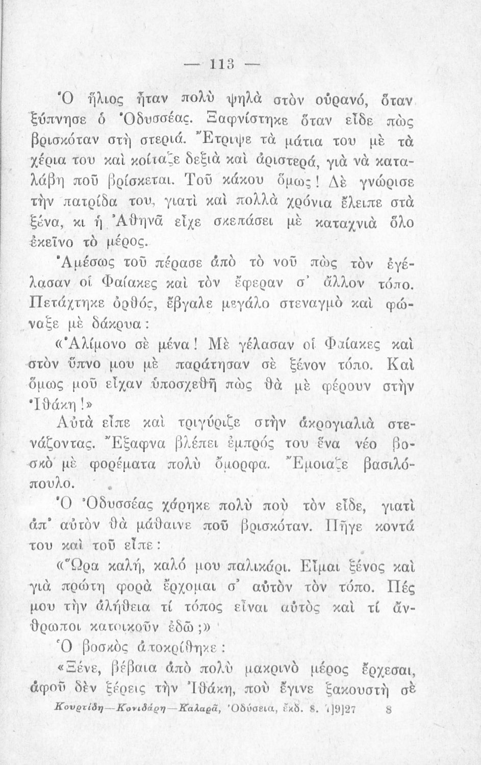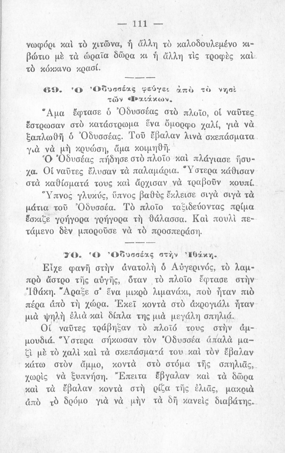 Βαθμίδα εκπαίδευσης: Πρωτοβάθμια Τάξη: Γ' Δημοτικού Μάθημα: Νέα Ελληνικά Γλώσσα: Απλή καθαρεύουσα Παρουσίαση περιεχομένου: Αναγνωστικό Γ' Δημοτικού που εξιστορεί τις περιπέτειες του Οδυσσέα. Περιέχει παράρτημα με ποιήματα εμπνευσμένα από τον εθνικό, θρησκευτικό και κοινωνικό βίο, τα επαγγέλματα και τις καθημερινές ασχολίες, την αγάπη για την φύση και το περιβάλλον. |