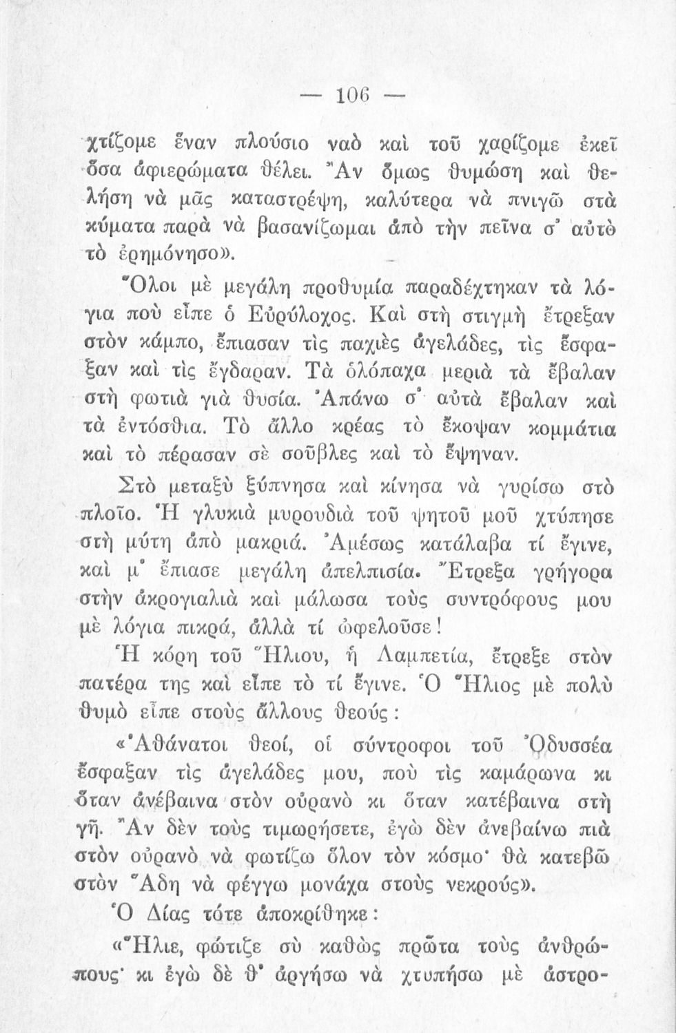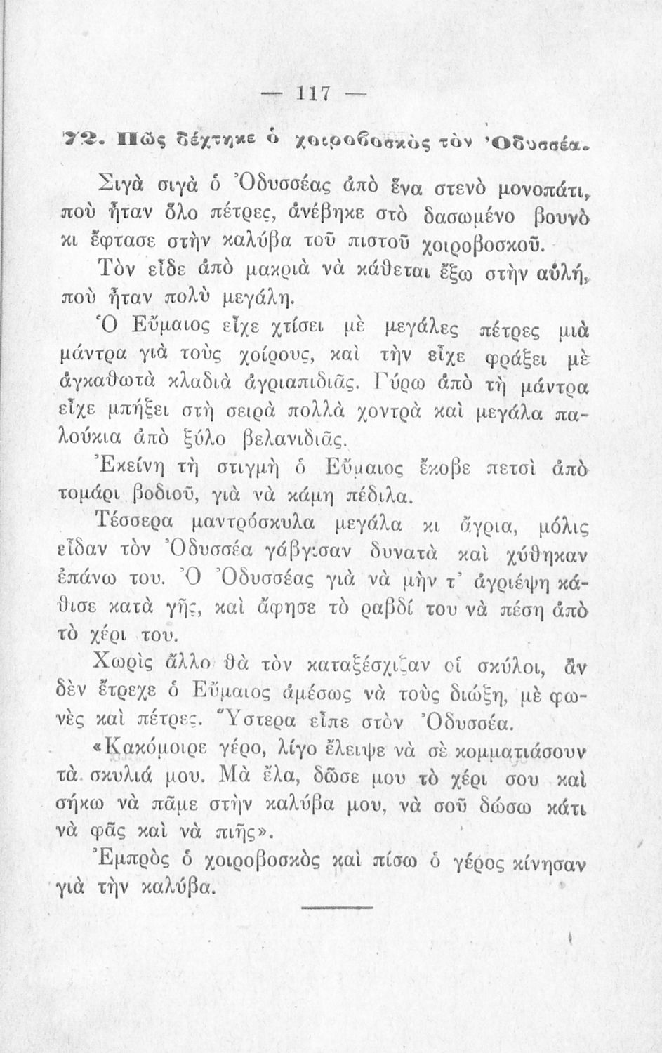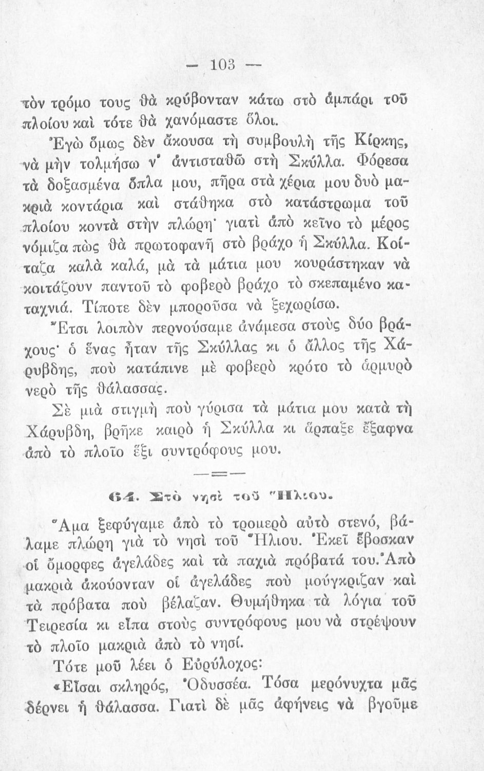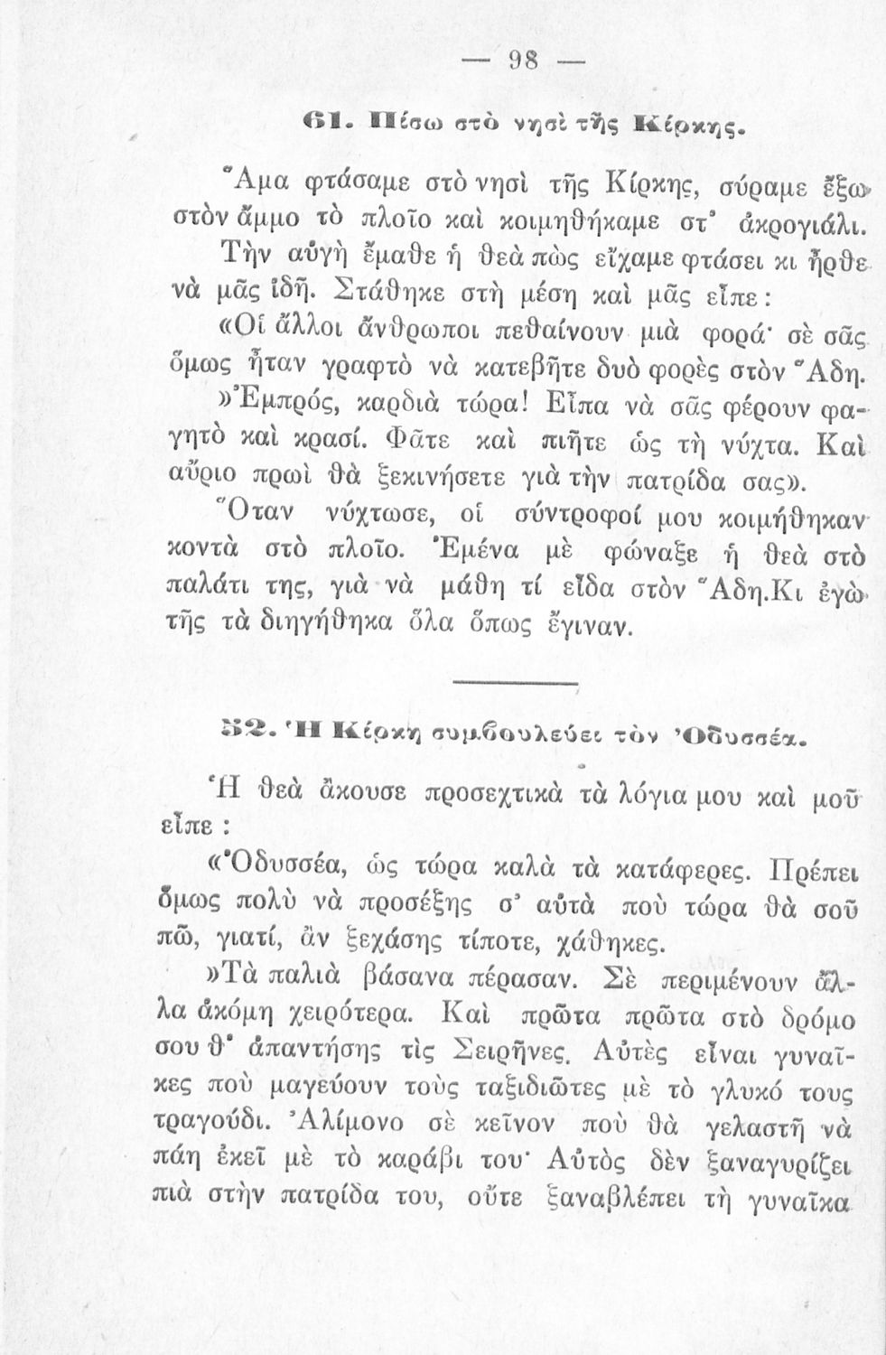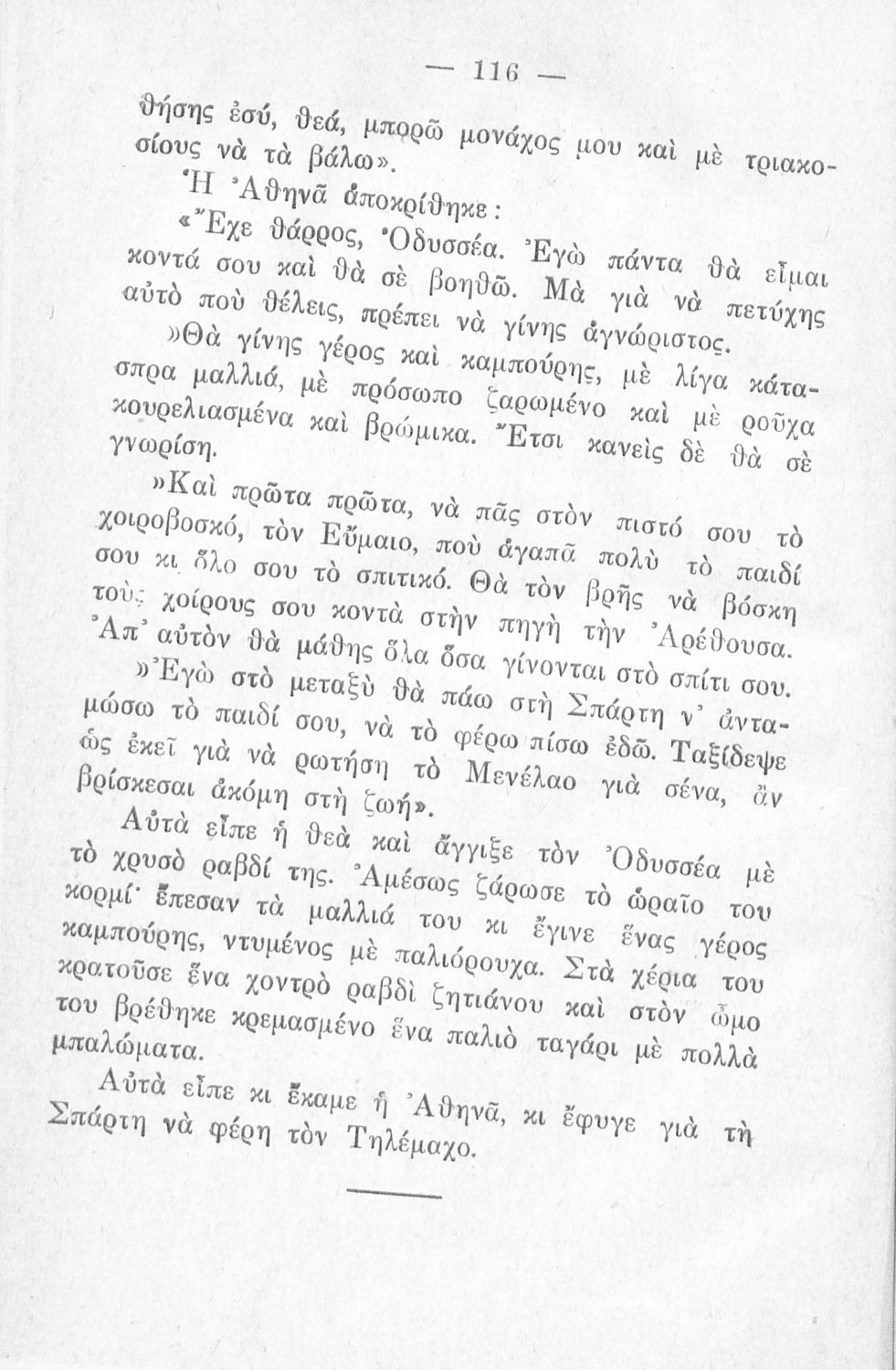 Βαθμίδα εκπαίδευσης: Πρωτοβάθμια Τάξη: Γ' Δημοτικού Μάθημα: Νέα Ελληνικά Γλώσσα: Απλή καθαρεύουσα Παρουσίαση περιεχομένου: Αναγνωστικό Γ' Δημοτικού που εξιστορεί τις περιπέτειες του Οδυσσέα. Περιέχει παράρτημα με ποιήματα εμπνευσμένα από τον εθνικό, θρησκευτικό και κοινωνικό βίο, τα επαγγέλματα και τις καθημερινές ασχολίες, την αγάπη για την φύση και το περιβάλλον. |