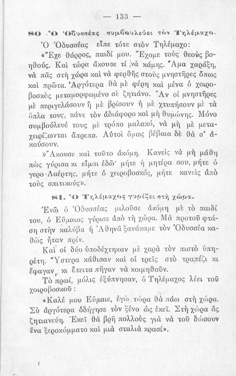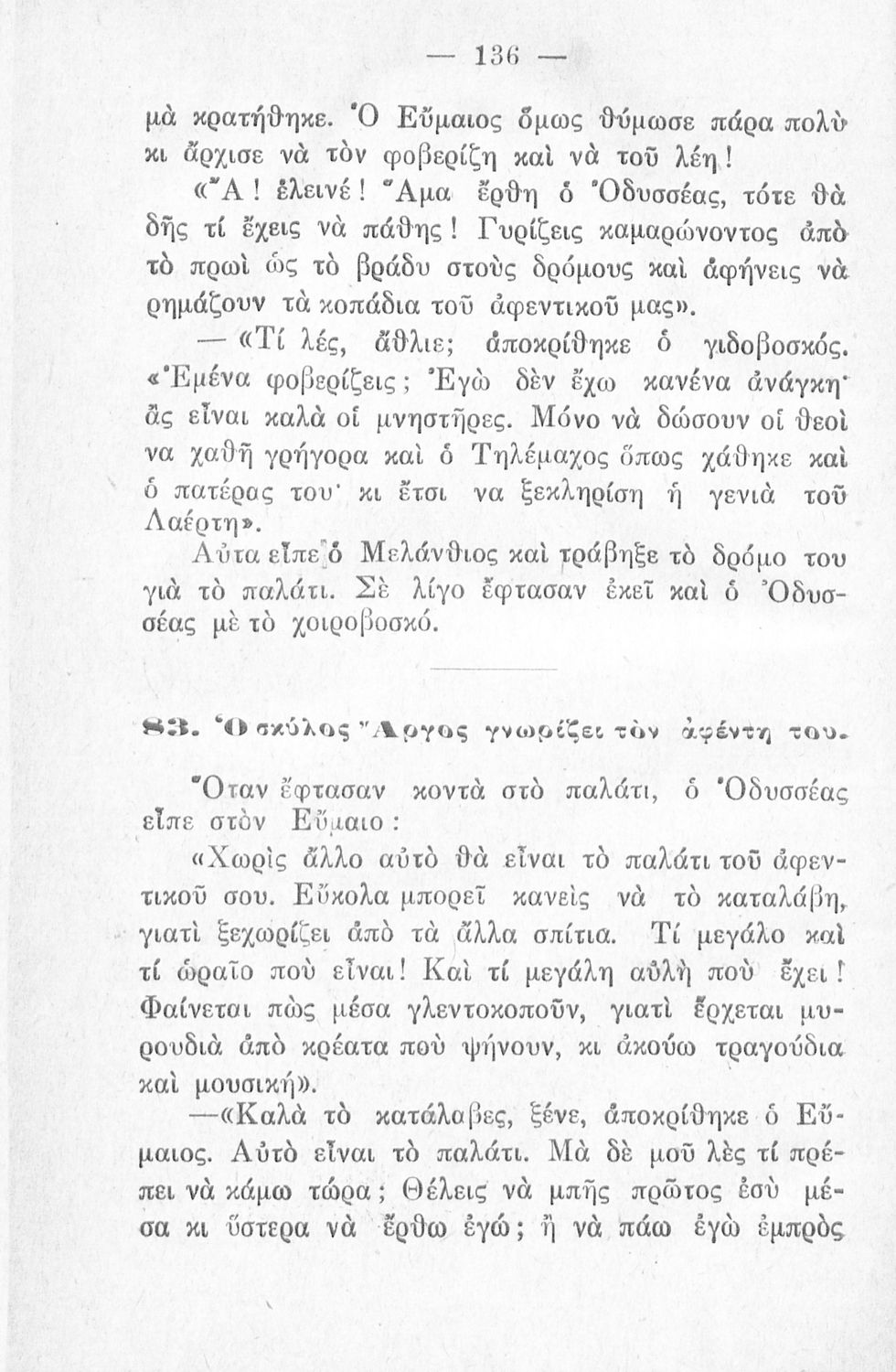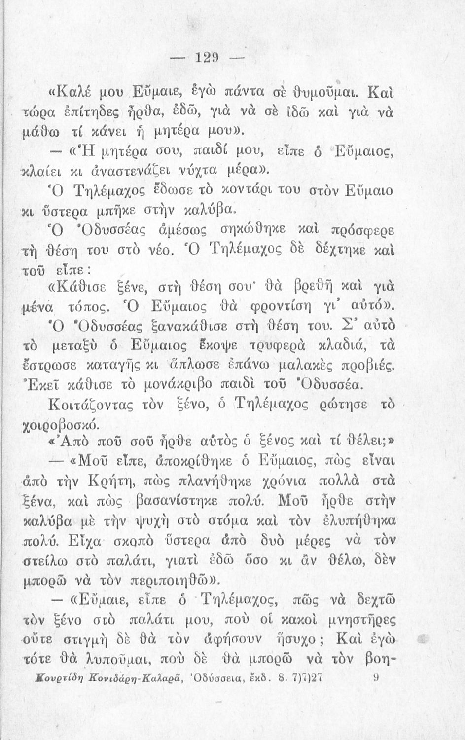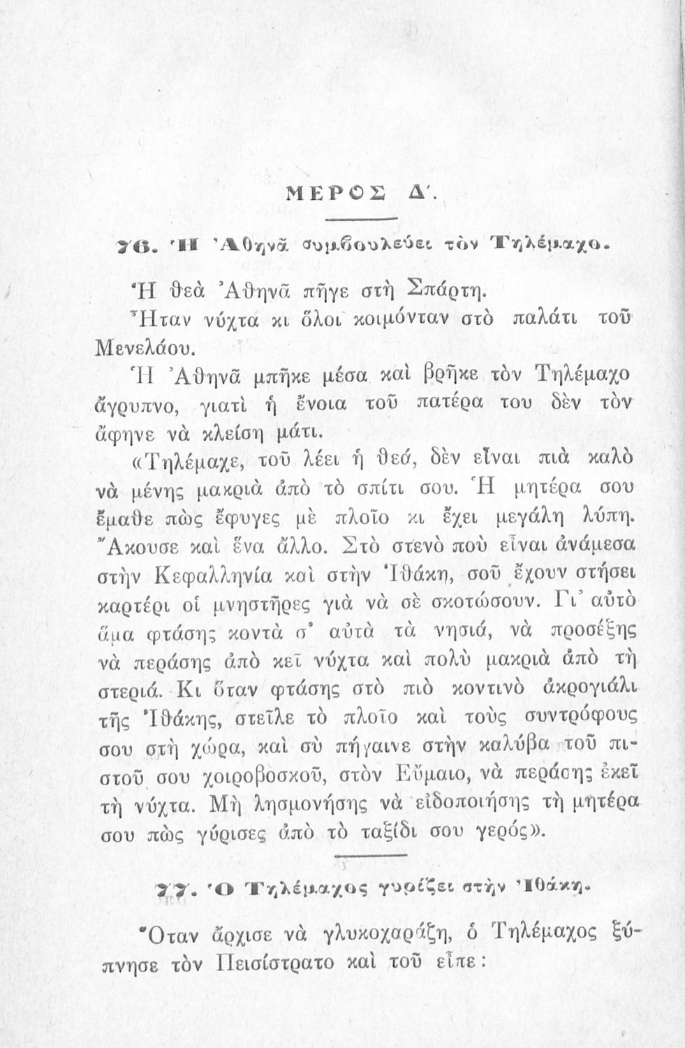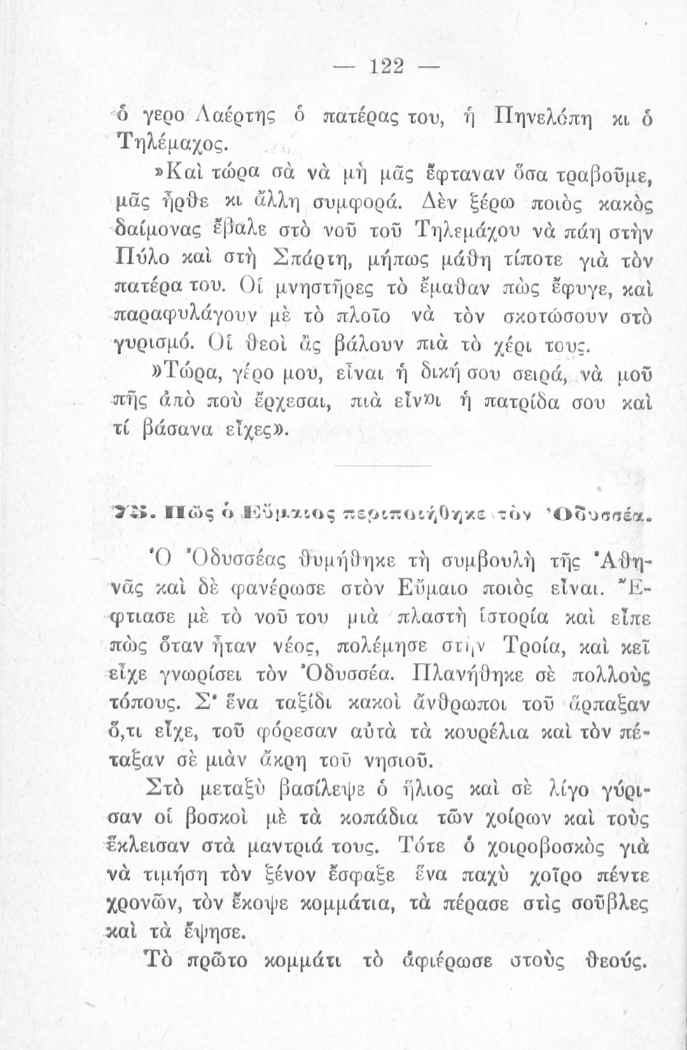 Βαθμίδα εκπαίδευσης: Πρωτοβάθμια Τάξη: Γ' Δημοτικού Μάθημα: Νέα Ελληνικά Γλώσσα: Απλή καθαρεύουσα Παρουσίαση περιεχομένου: Αναγνωστικό Γ' Δημοτικού που εξιστορεί τις περιπέτειες του Οδυσσέα. Περιέχει παράρτημα με ποιήματα εμπνευσμένα από τον εθνικό, θρησκευτικό και κοινωνικό βίο, τα επαγγέλματα και τις καθημερινές ασχολίες, την αγάπη για την φύση και το περιβάλλον. |
