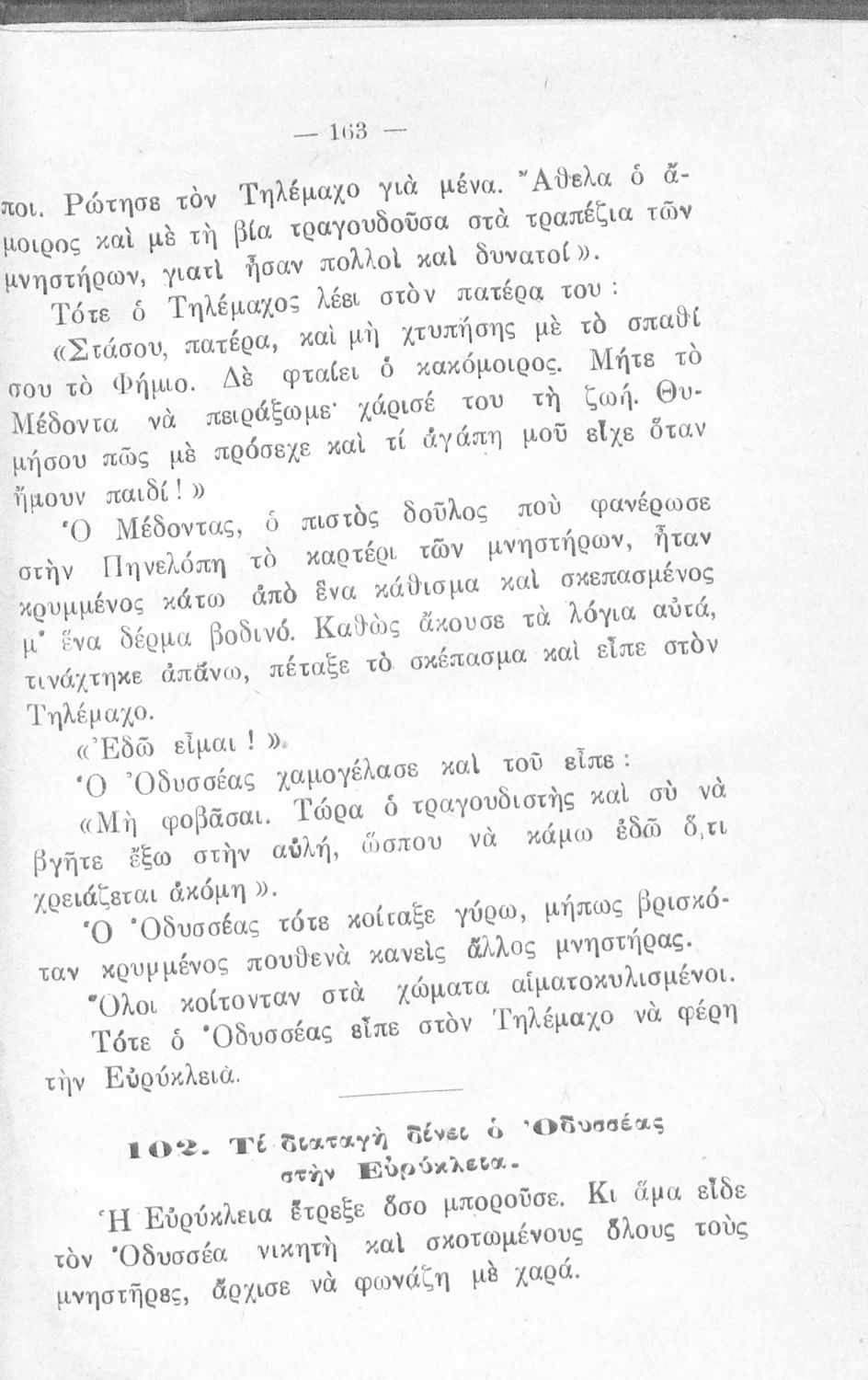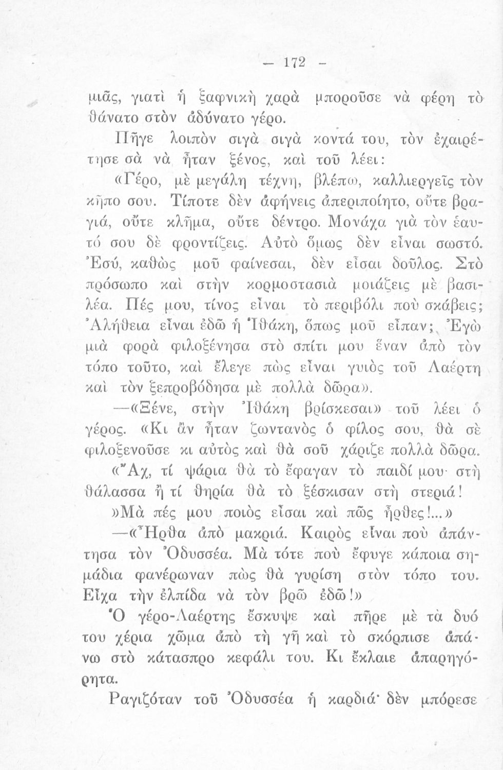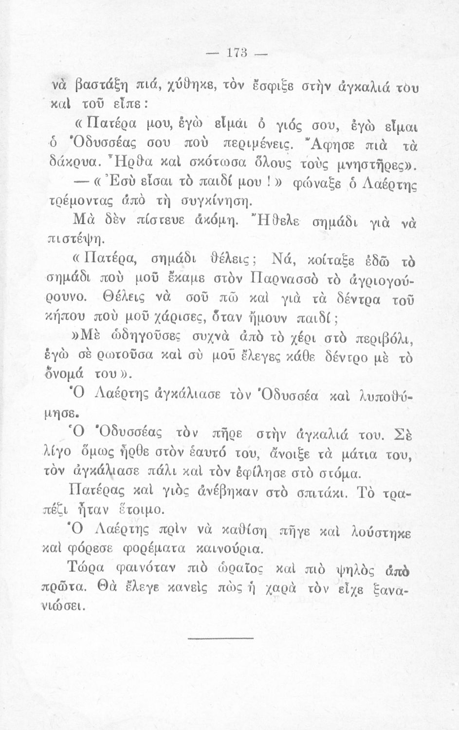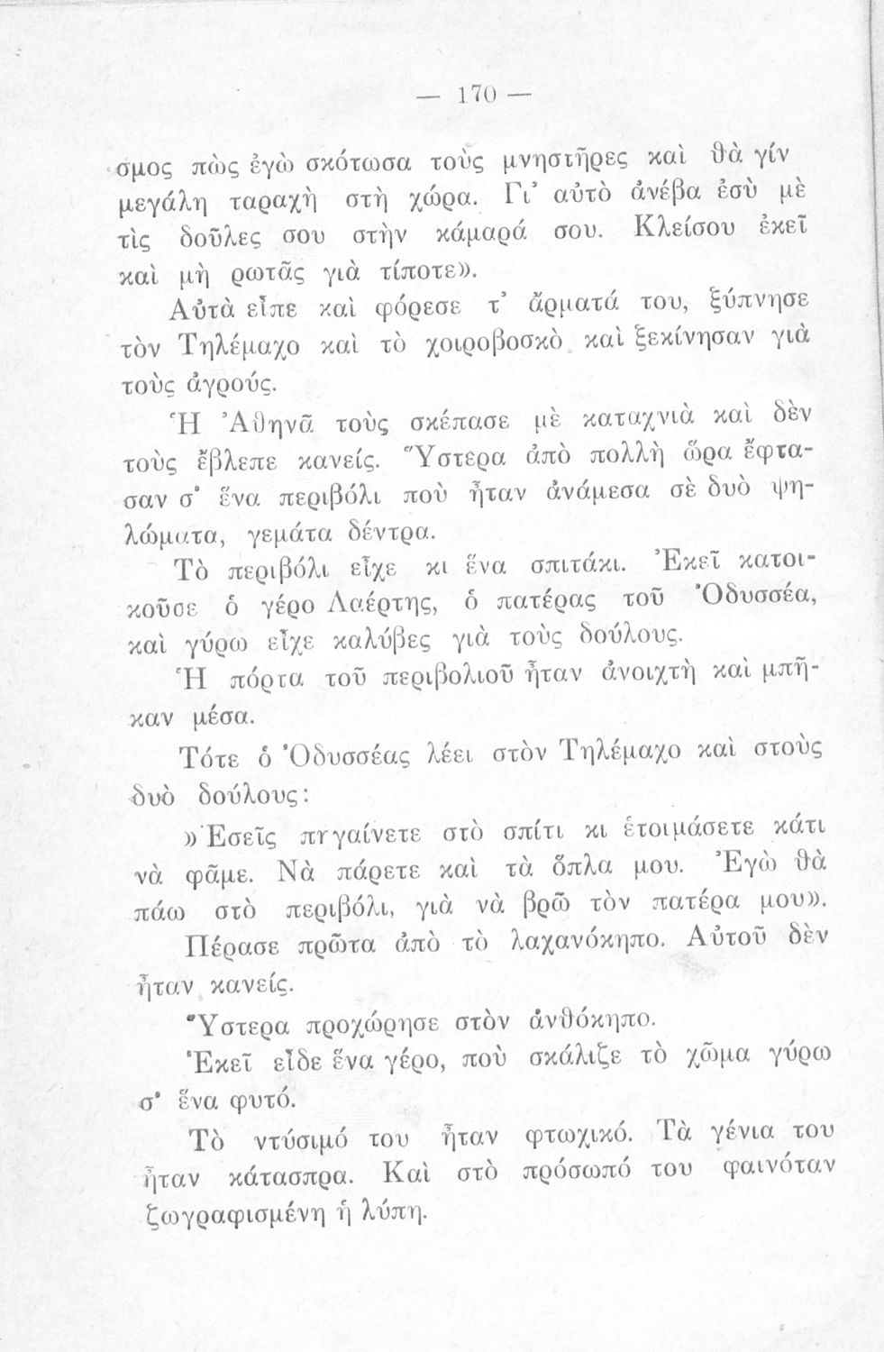 Βαθμίδα εκπαίδευσης: Πρωτοβάθμια Τάξη: Γ' Δημοτικού Μάθημα: Νέα Ελληνικά Γλώσσα: Απλή καθαρεύουσα Παρουσίαση περιεχομένου: Αναγνωστικό Γ' Δημοτικού που εξιστορεί τις περιπέτειες του Οδυσσέα. Περιέχει παράρτημα με ποιήματα εμπνευσμένα από τον εθνικό, θρησκευτικό και κοινωνικό βίο, τα επαγγέλματα και τις καθημερινές ασχολίες, την αγάπη για την φύση και το περιβάλλον. |
