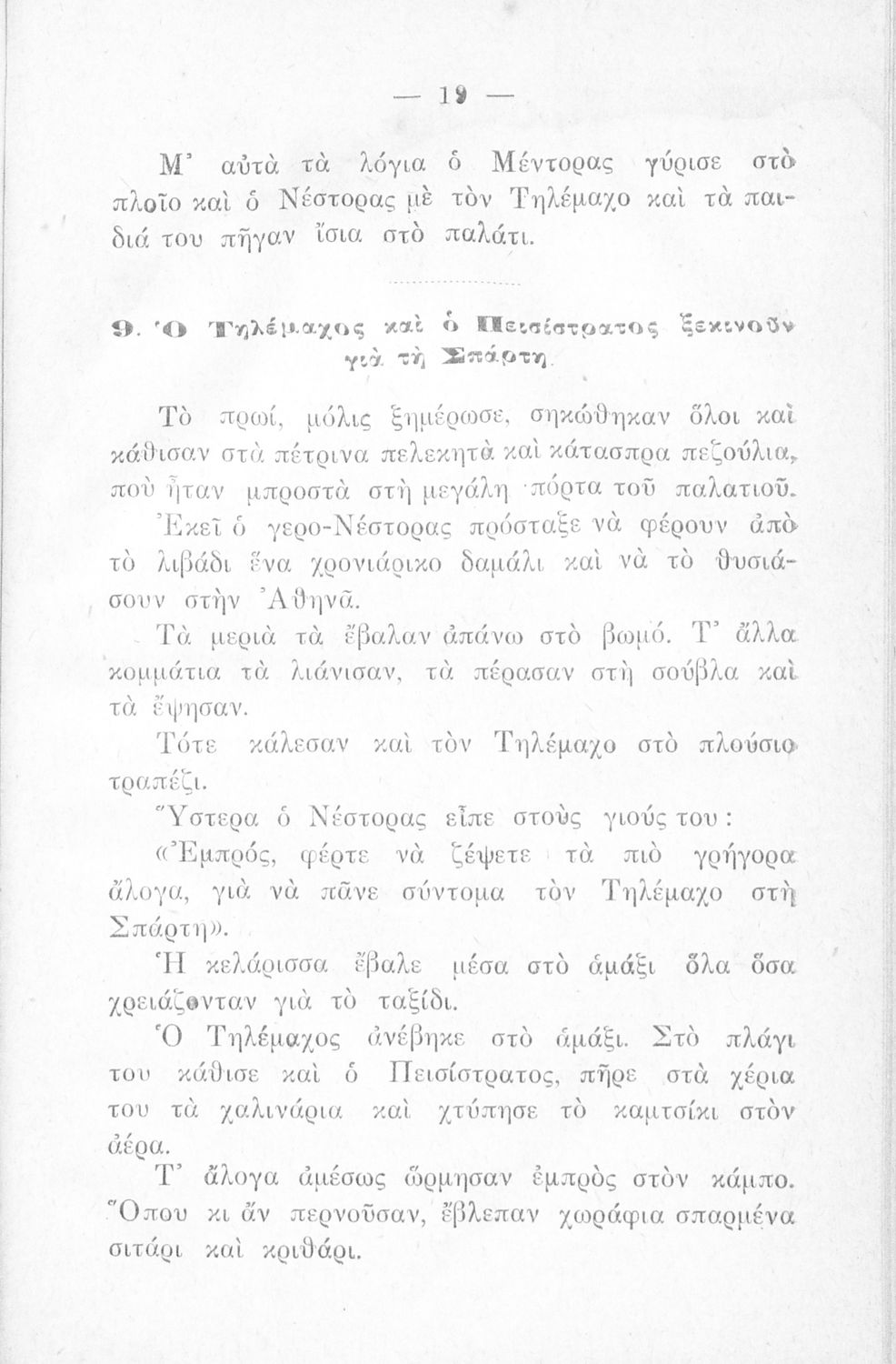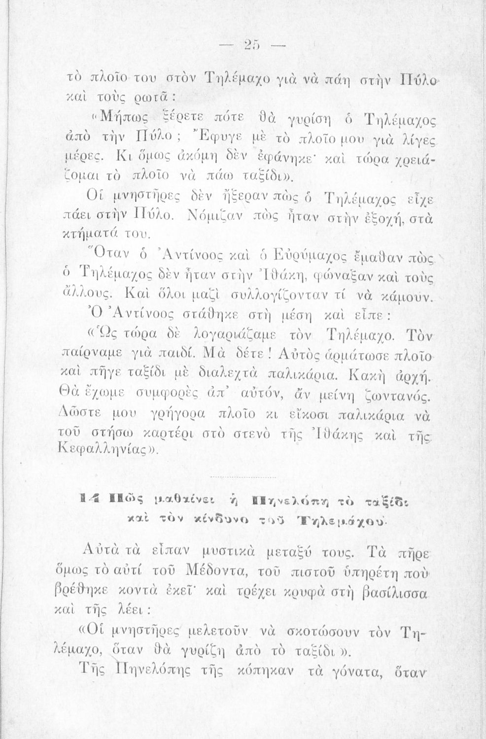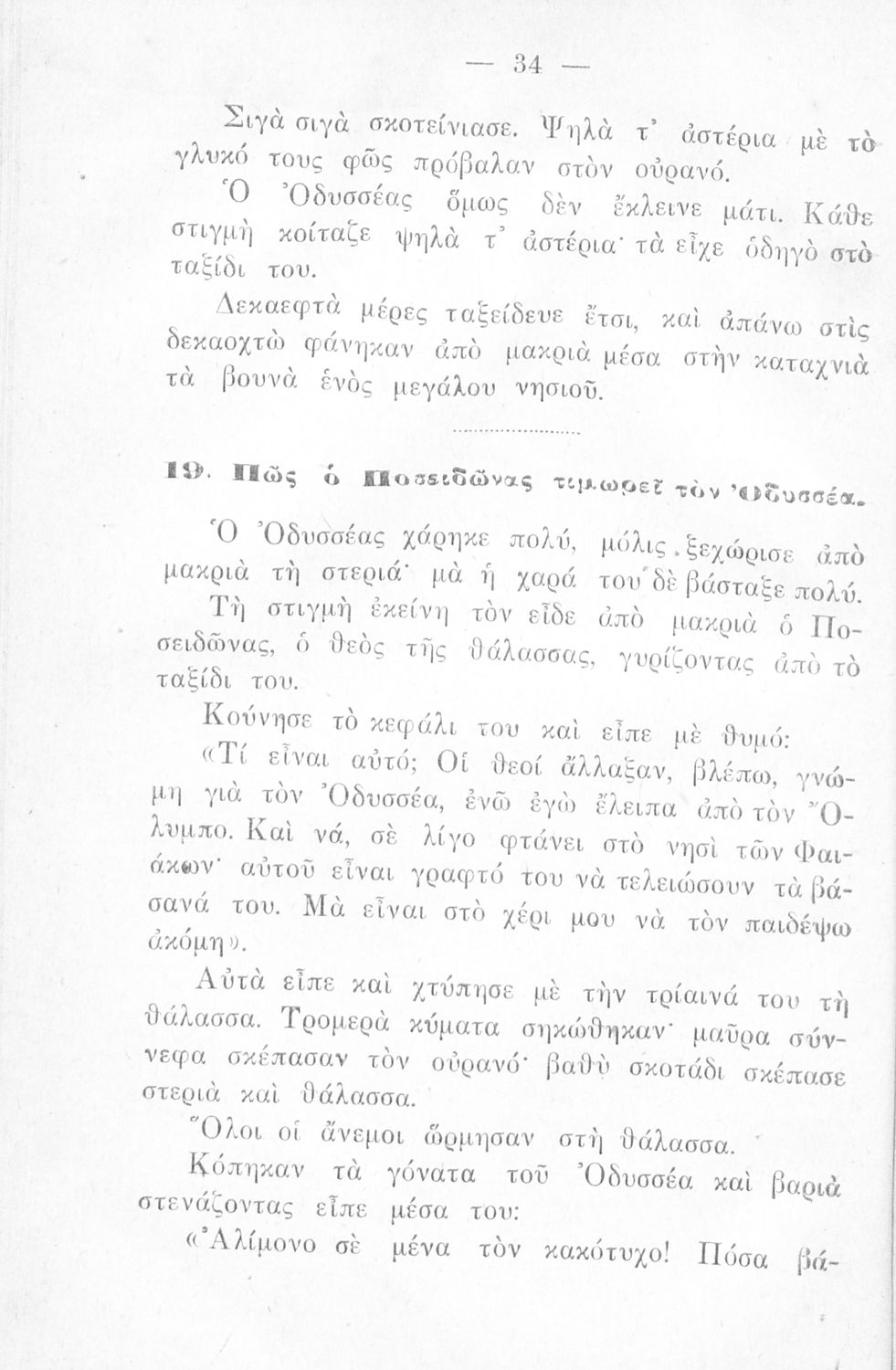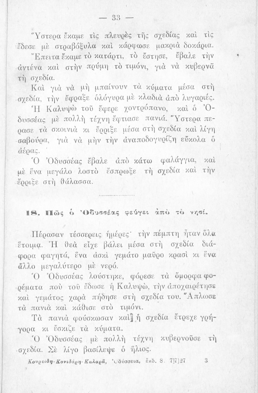 Βαθμίδα εκπαίδευσης: Πρωτοβάθμια Τάξη: Γ' Δημοτικού Μάθημα: Νέα Ελληνικά Γλώσσα: Απλή καθαρεύουσα Παρουσίαση περιεχομένου: Αναγνωστικό Γ' Δημοτικού που εξιστορεί τις περιπέτειες του Οδυσσέα. Περιέχει παράρτημα με ποιήματα εμπνευσμένα από τον εθνικό, θρησκευτικό και κοινωνικό βίο, τα επαγγέλματα και τις καθημερινές ασχολίες, την αγάπη για την φύση και το περιβάλλον. |