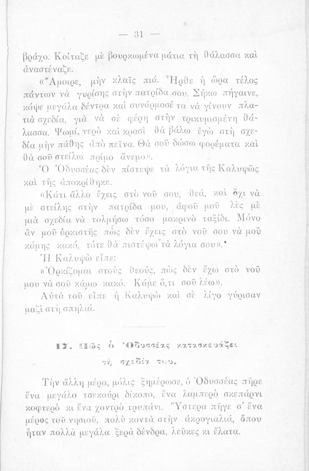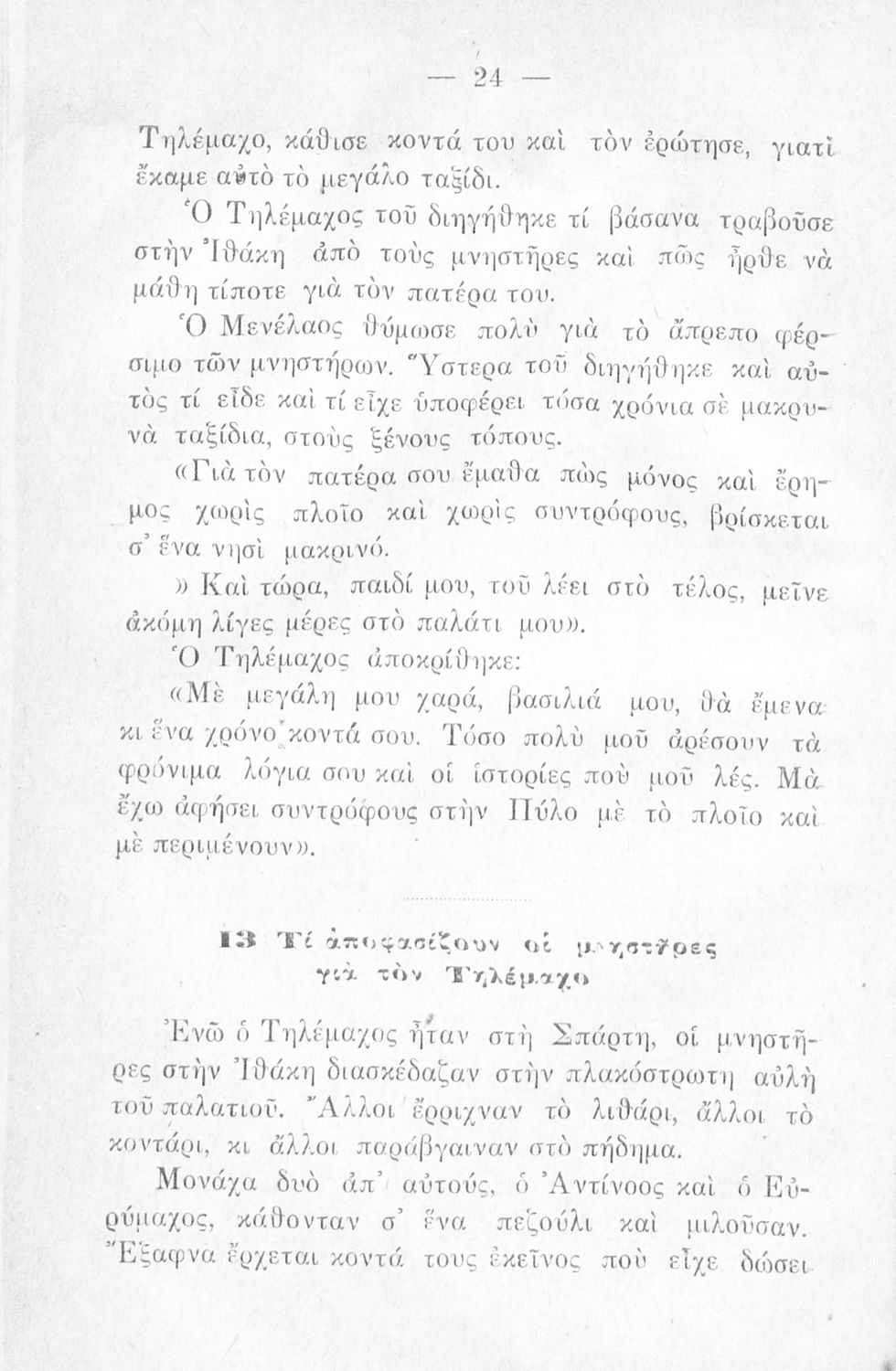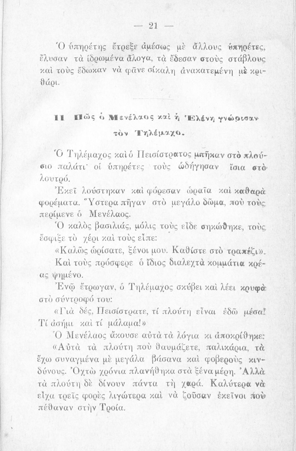 Βαθμίδα εκπαίδευσης: Πρωτοβάθμια Τάξη: Γ' Δημοτικού Μάθημα: Νέα Ελληνικά Γλώσσα: Απλή καθαρεύουσα Παρουσίαση περιεχομένου: Αναγνωστικό Γ' Δημοτικού που εξιστορεί τις περιπέτειες του Οδυσσέα. Περιέχει παράρτημα με ποιήματα εμπνευσμένα από τον εθνικό, θρησκευτικό και κοινωνικό βίο, τα επαγγέλματα και τις καθημερινές ασχολίες, την αγάπη για την φύση και το περιβάλλον. |