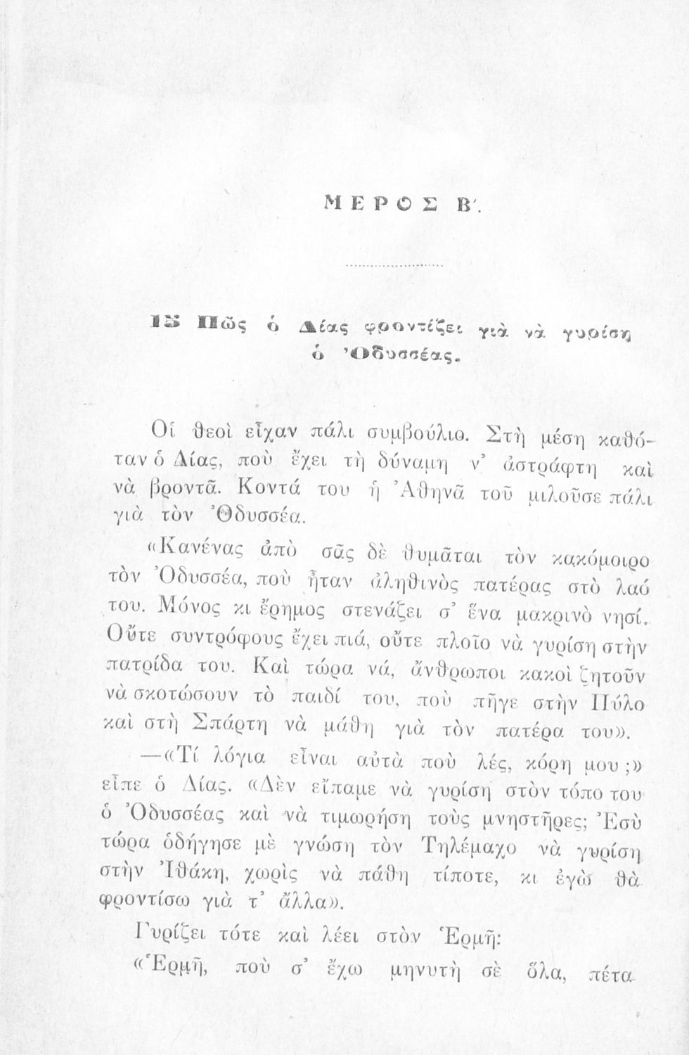 Αναγνωστικό Γ' Δημοτικού που εξιστορεί τις περιπέτειες του Οδυσσέα. Περιέχει παράρτημα με ποιήματα εμπνευσμένα από τον εθνικό, θρησκευτικό και κοινωνικό βίο, τα επαγγέλματα και τις καθημερινές ασχολίες, την αγάπη για την φύση και το περιβάλλον.