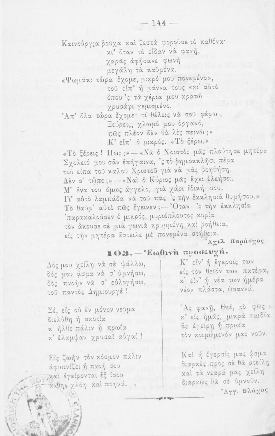 Αναγνωστικό Γ' Δημοτικού που περιέχει πεζά και ποιήματα ηθικοπλαστικού περιεχομένου εμπνευσμένα από τη θρησκευτική, εθνική, κοινωνική και ατομική ζωή, την ελληνική φύση, ιστορία και μυθολογία και την υγιεινή.