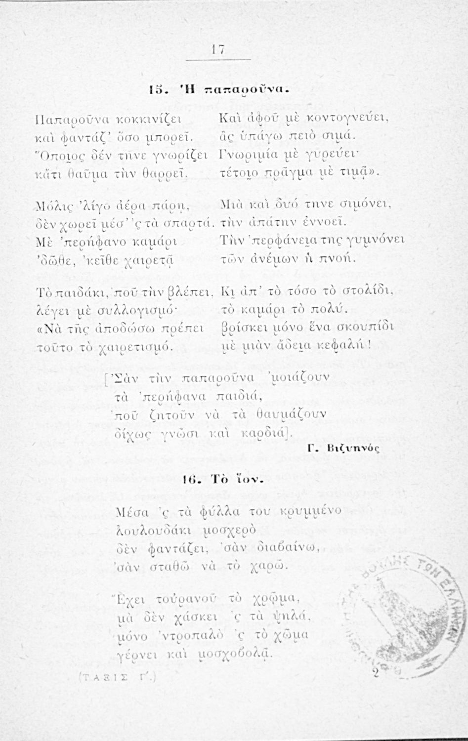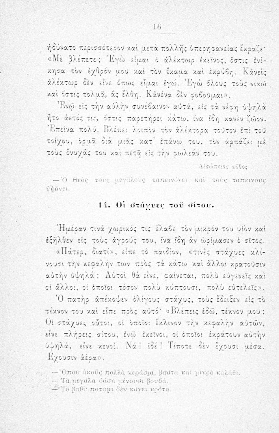 Αναγνωστικό Β' Δημοτικού που περιλαμβάνει πεζά και ποιήματα, ηθικοπλαστικού περιεχομένου, και προβάλει αξίες και αρετές όπως η τιμιότητα, η ευσπλαχνία, η γενναιότητα, η αγάπη, η φιλοπατρία, κι η ευγνωμοσύνη.