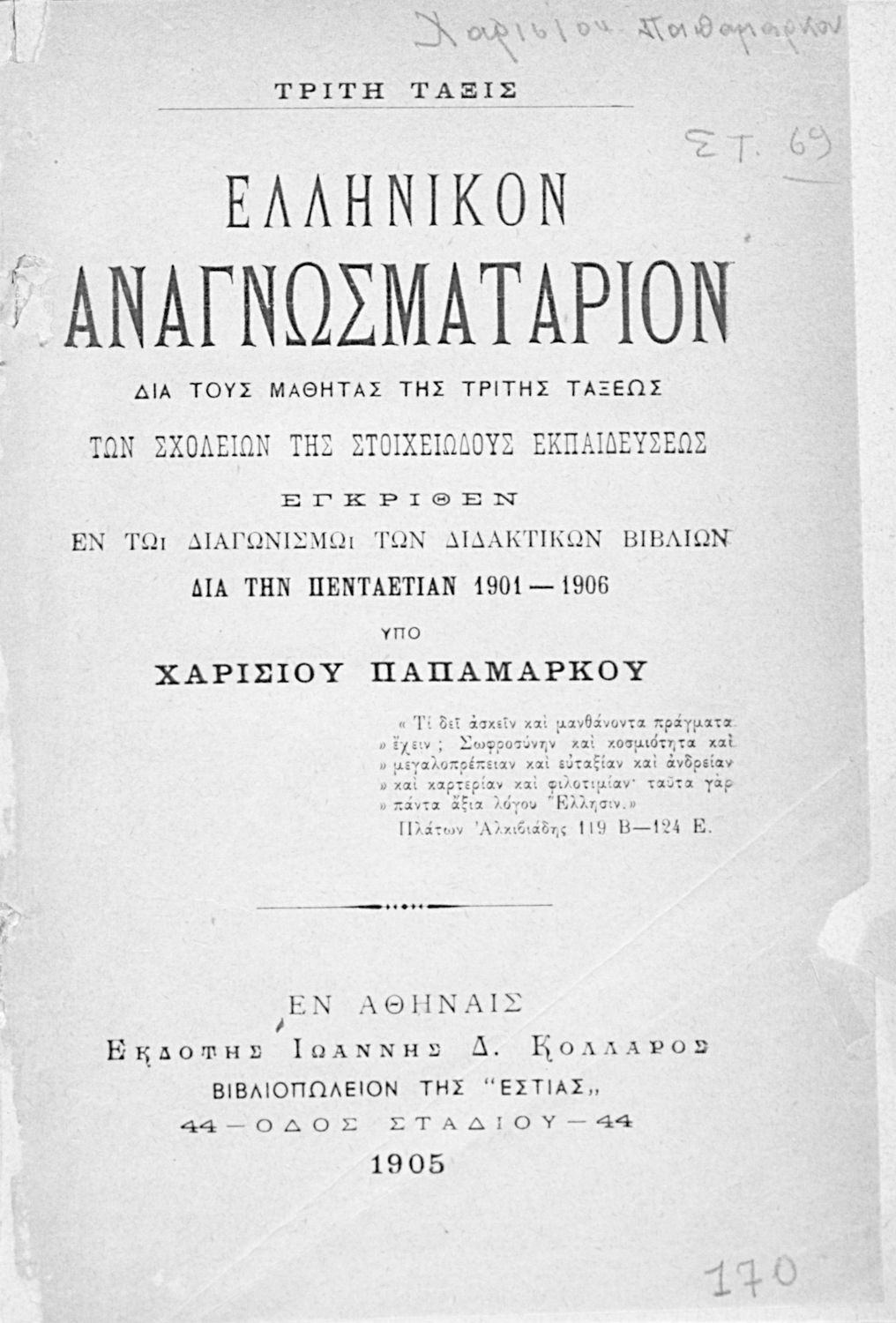 Ελληνικόν αλφαβητάριον δια τους μαθητάς της τρίτης τάξεως των σχολείων της Στοιχειώδους Εκπαιδεύσεως