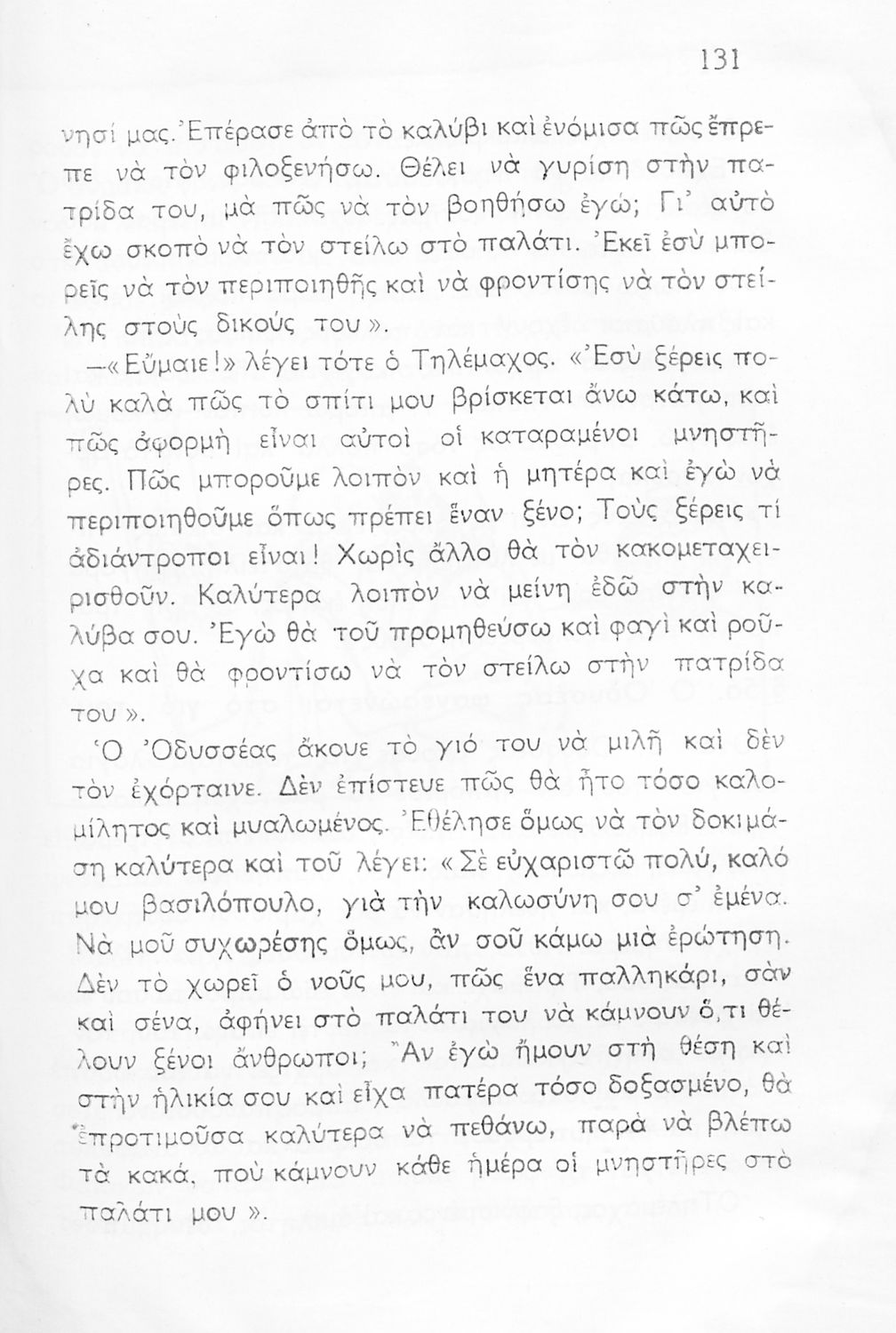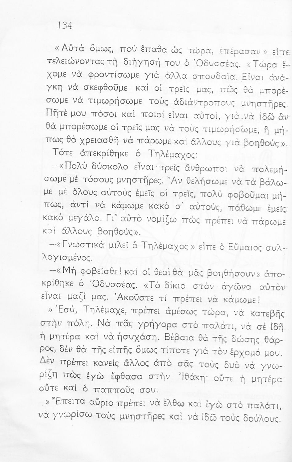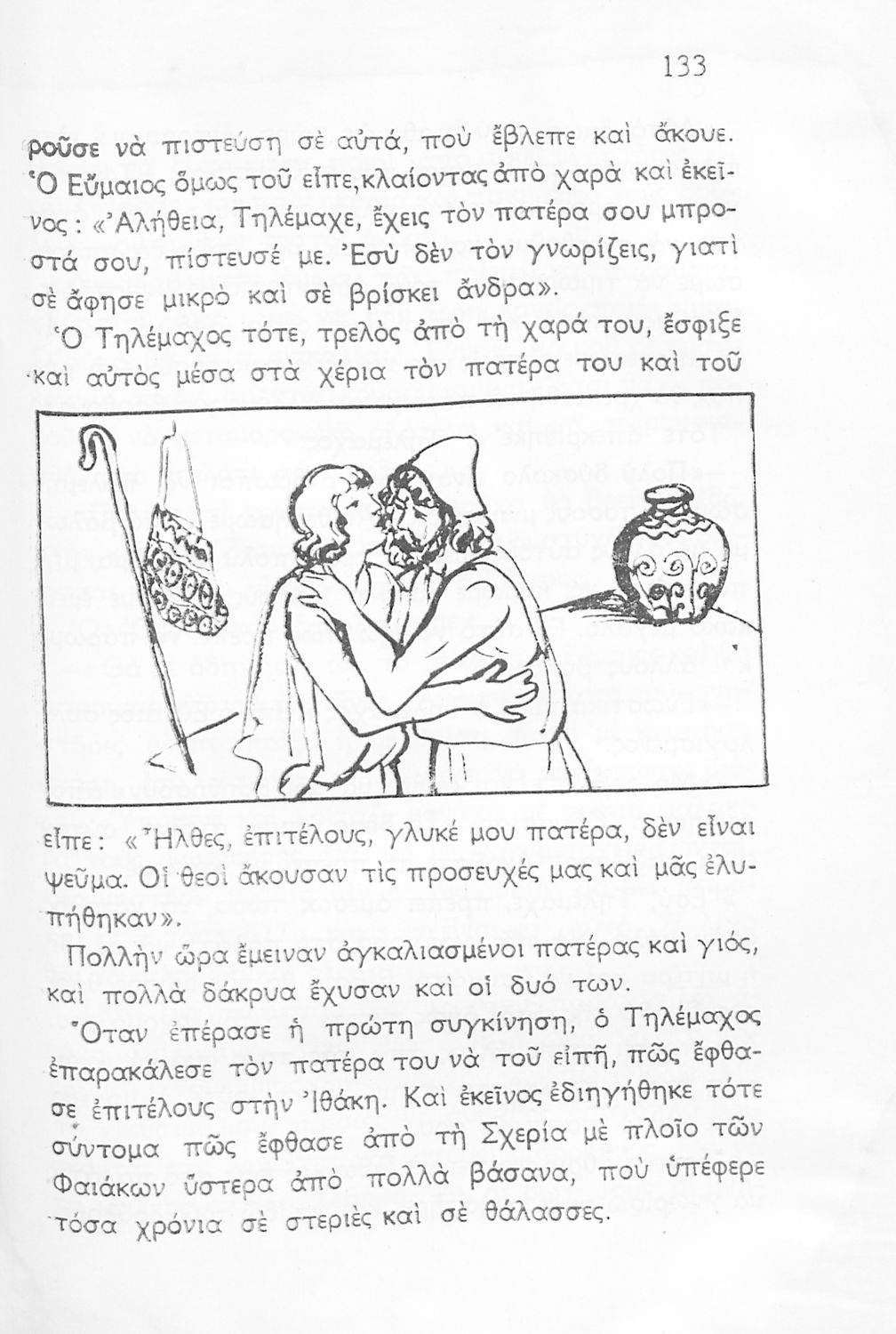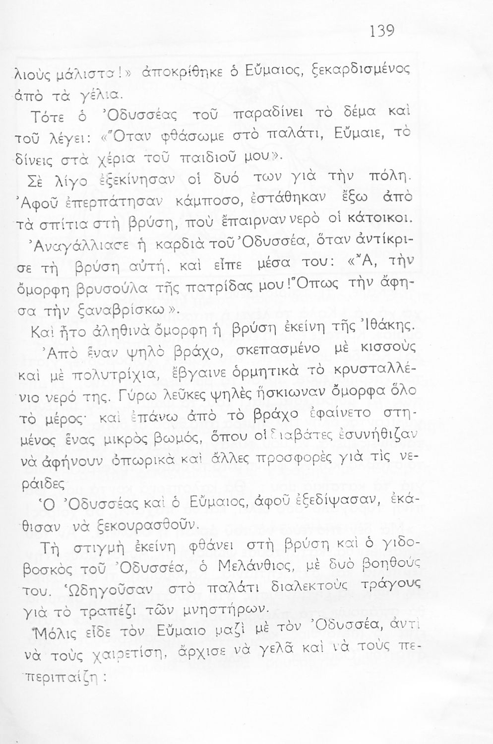 Βαθμίδα εκπαίδευσης: Πρωτοβάθμια Τάξη: Γ' Δημοτικού Μάθημα: Νέα Ελληνικά Γλώσσα: Δημοτική με στοιχεία καθαρεύουσας Παρουσίαση περιεχομένου: Αναγνωστικό Γ ' Δημοτικού το οποίο παρουσιάζει το ταξίδι του Οδυσσέα προς την Ιθάκη. Στο τέλος το βιβλίο περιλαμβάνει σειρά από δημοτικά ποιήματα τα οποία εκπέμπουν μηνύματα γυρισμού και ξενιτιάς. |