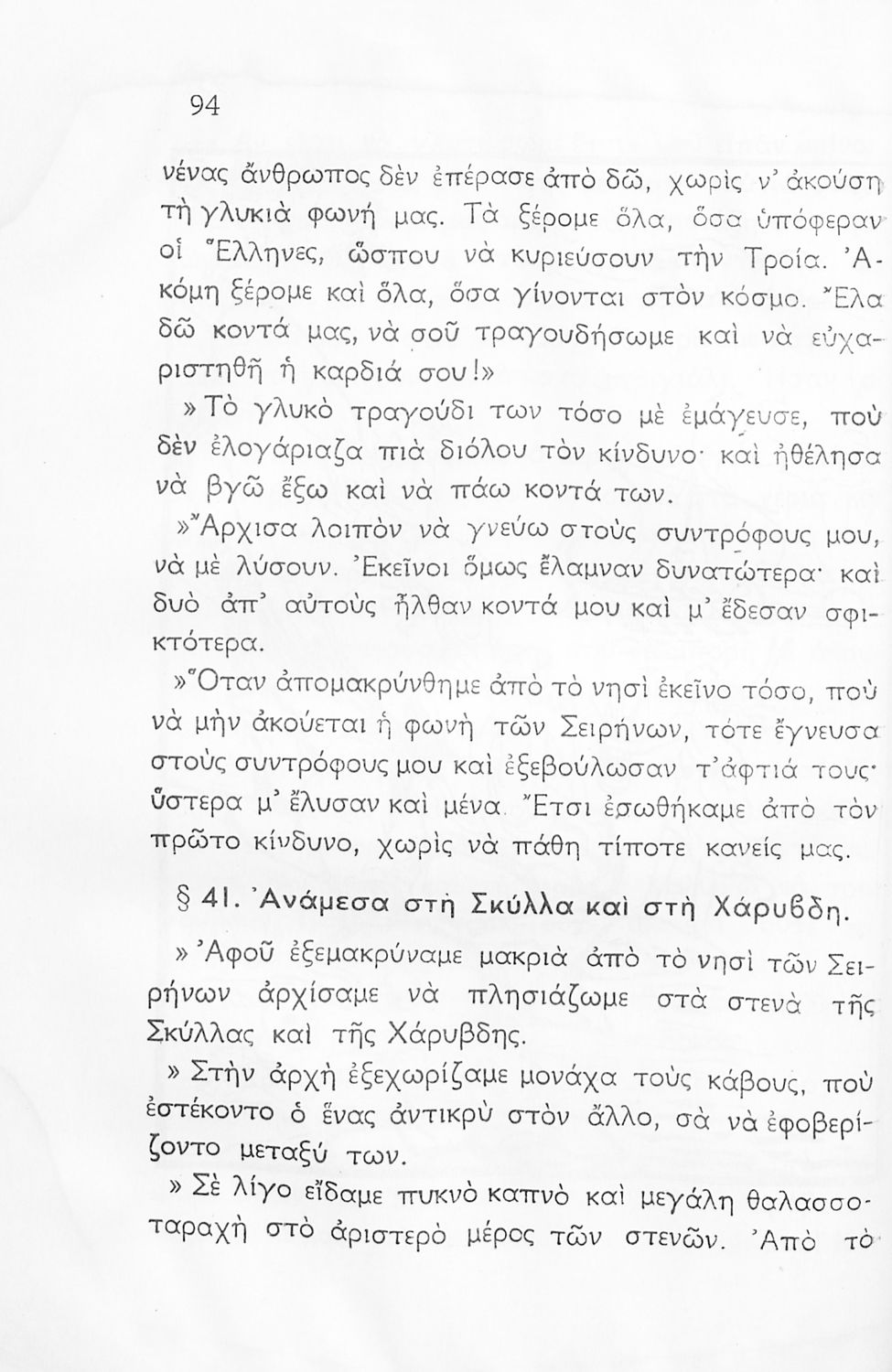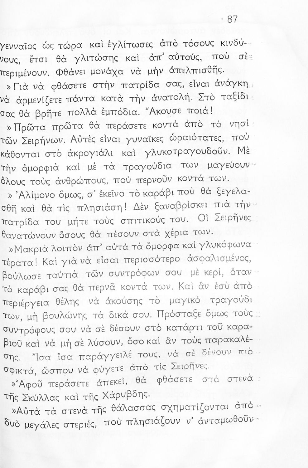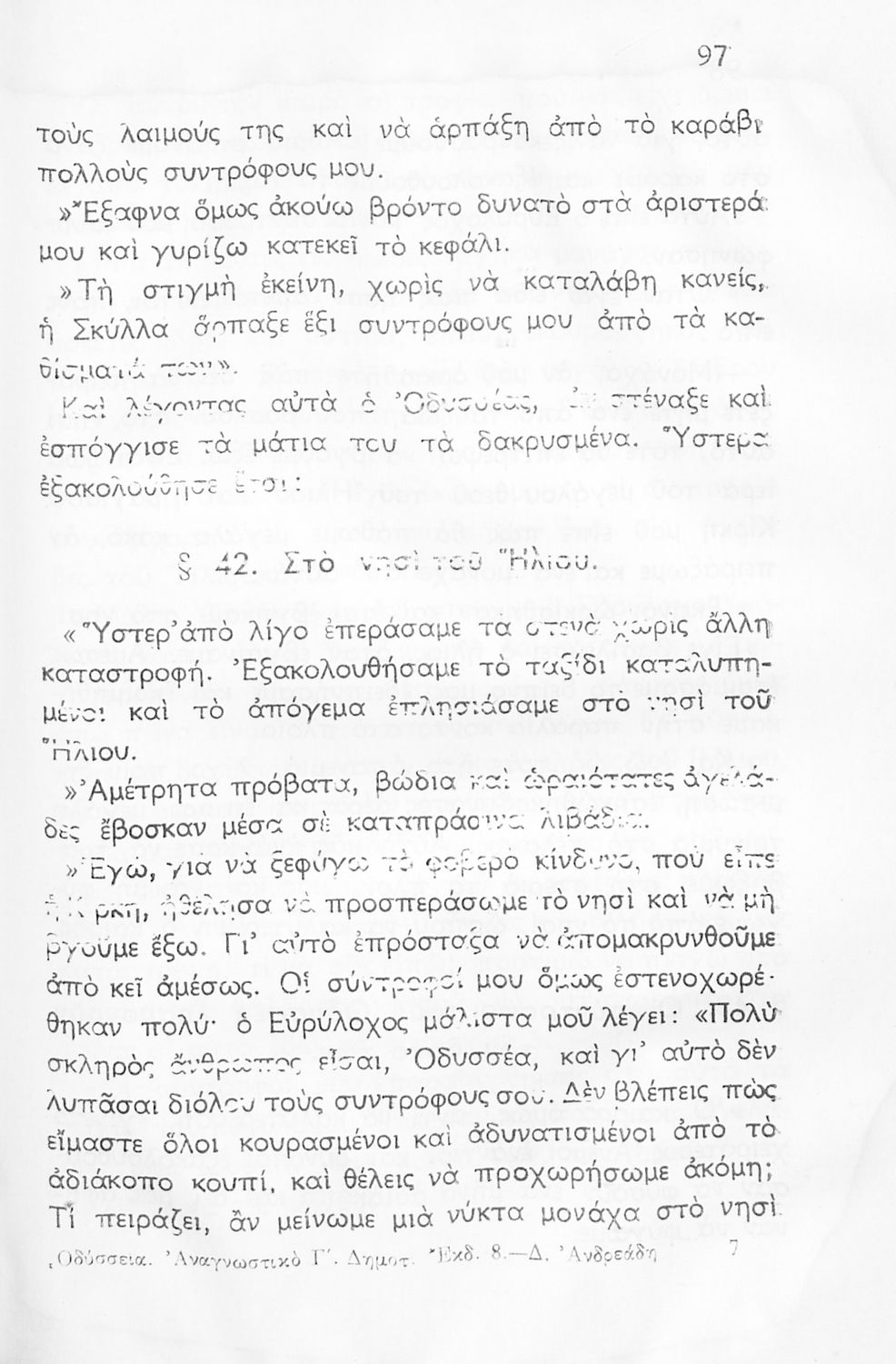 Βαθμίδα εκπαίδευσης: Πρωτοβάθμια Τάξη: Γ' Δημοτικού Μάθημα: Νέα Ελληνικά Γλώσσα: Δημοτική με στοιχεία καθαρεύουσας Παρουσίαση περιεχομένου: Αναγνωστικό Γ ' Δημοτικού το οποίο παρουσιάζει το ταξίδι του Οδυσσέα προς την Ιθάκη. Στο τέλος το βιβλίο περιλαμβάνει σειρά από δημοτικά ποιήματα τα οποία εκπέμπουν μηνύματα γυρισμού και ξενιτιάς. |