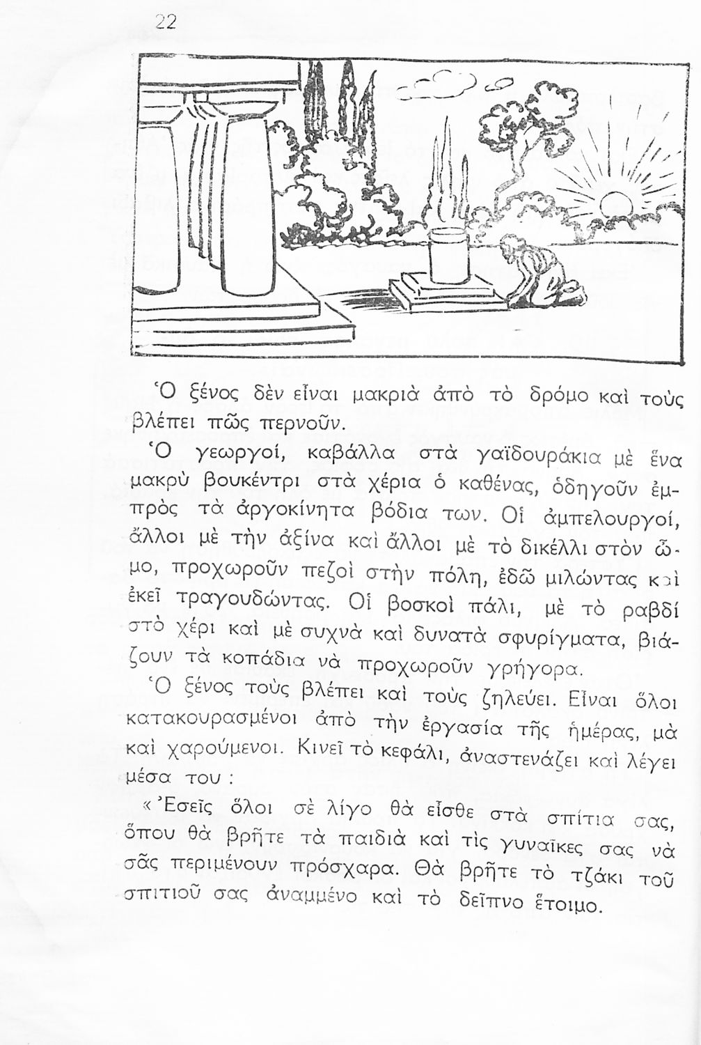Αναγνωστικό Γ΄ Δημοτικού που περιλαμβάνει ποιήματα και πεζά με θέματα όπως η καλή και κακή συναναστροφή, η φρόνηση, η οκνηρία, η φιλανθρωπία και η πίστη στο Θεό