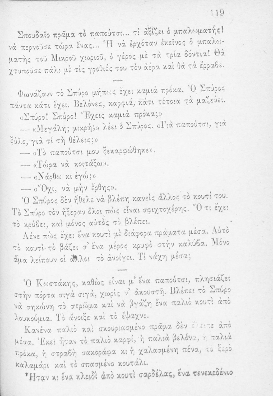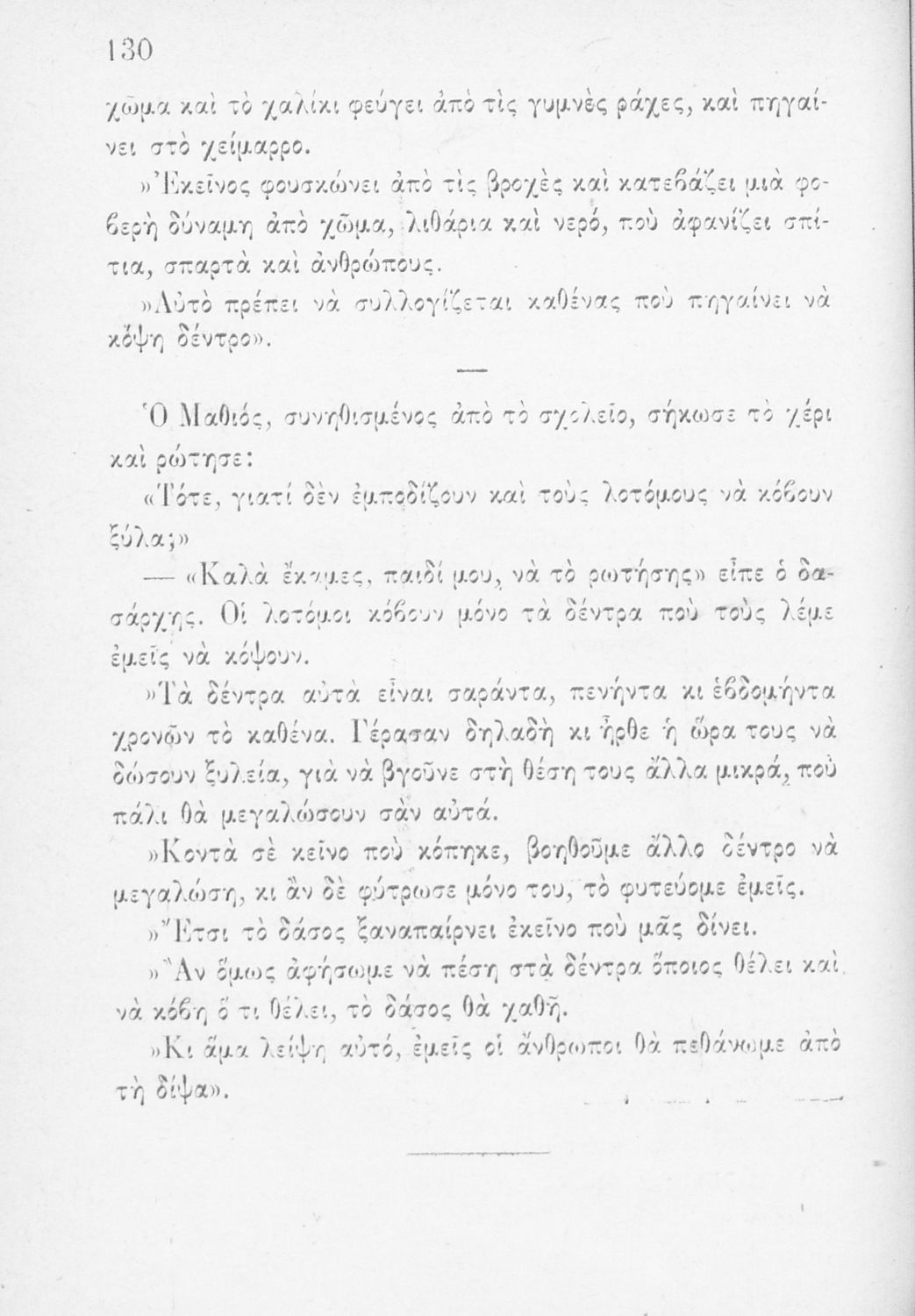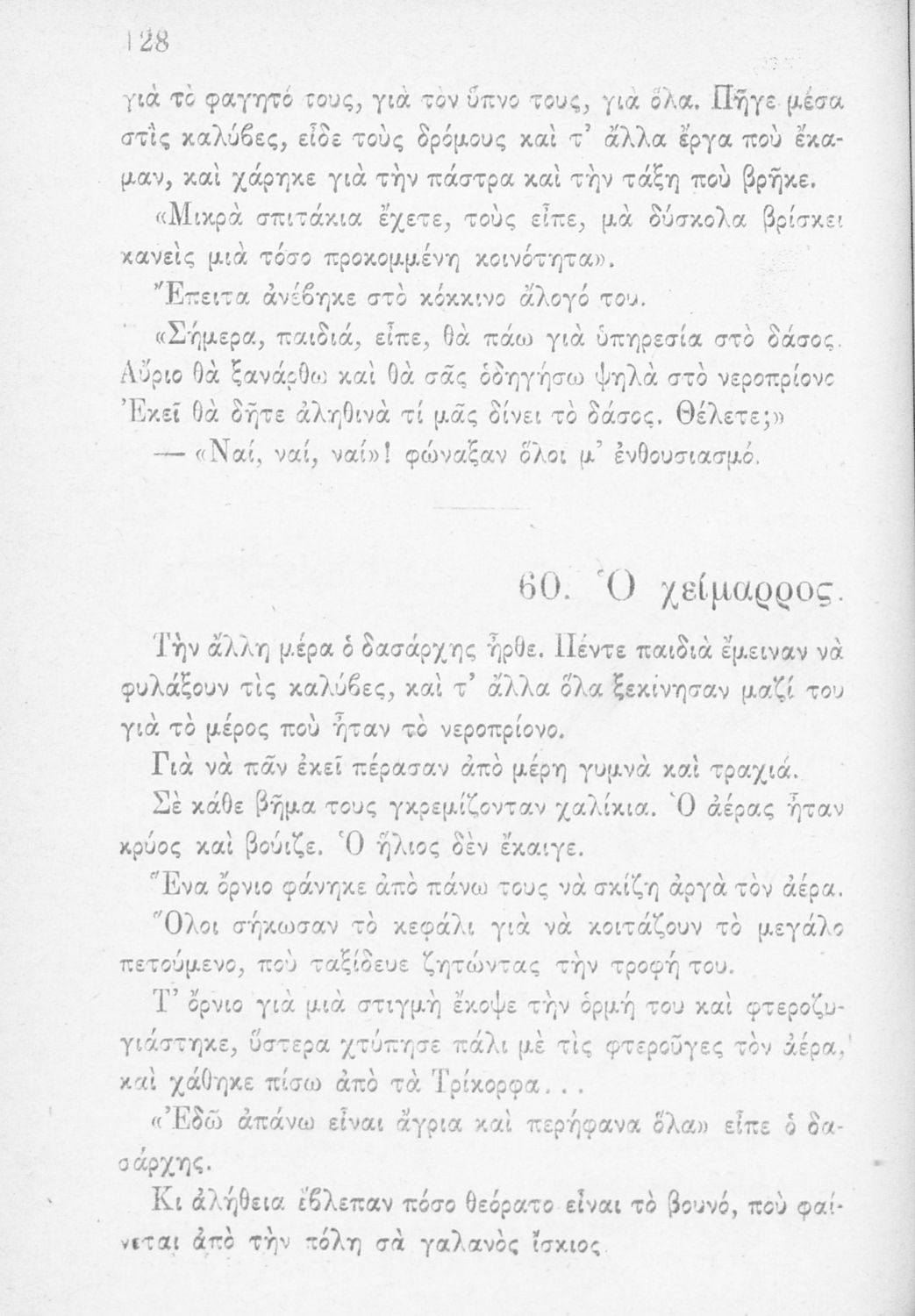 Το εγχειρίδιο ήταν αναγνωστικό για την Γ΄ Δημοτικού. Περιλαμβάνει μια αφηγηματική ιστορία, η οποία εμπεριέχει ηθικά διδάγματα για την ηθικοπλαστική καλλιέργεια των μαθητών. Η γλώσσα είναι δημοτική και το ύφος απλό. Στο παράρτημα περιλαμβάνει ποιήματα και τραγούδια.