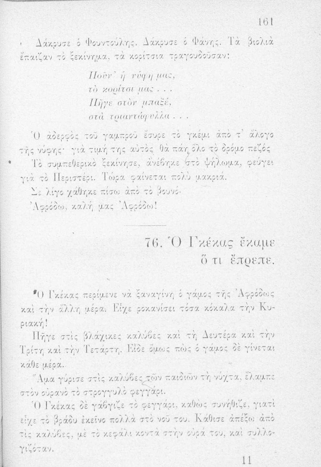 Παρουσίαση περιεχομένου: Το εγχειρίδιο ήταν αναγνωστικό για την Γ΄ Δημοτικού. Περιλαμβάνει μια αφηγηματική ιστορία, η οποία εμπεριέχει ηθικά διδάγματα για την ηθικοπλαστική καλλιέργεια των μαθητών. Η γλώσσα είναι δημοτική και το ύφος απλό. Στο παράρτημα περιλαμβάνει ποιήματα και τραγούδια.
