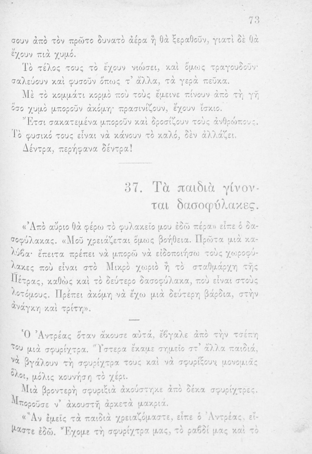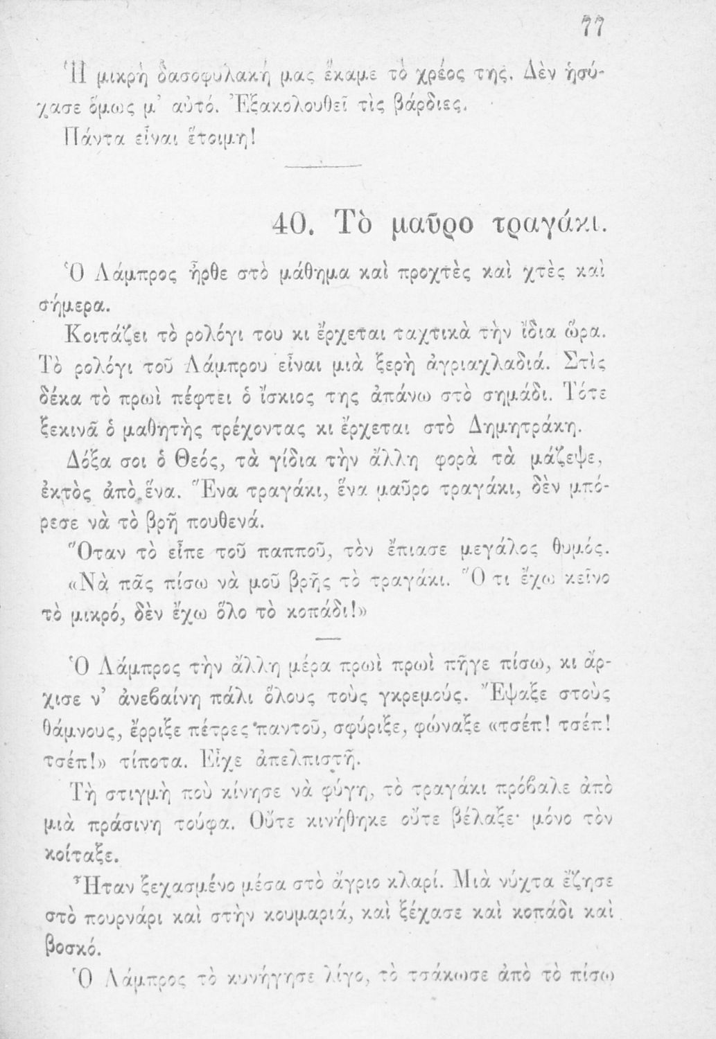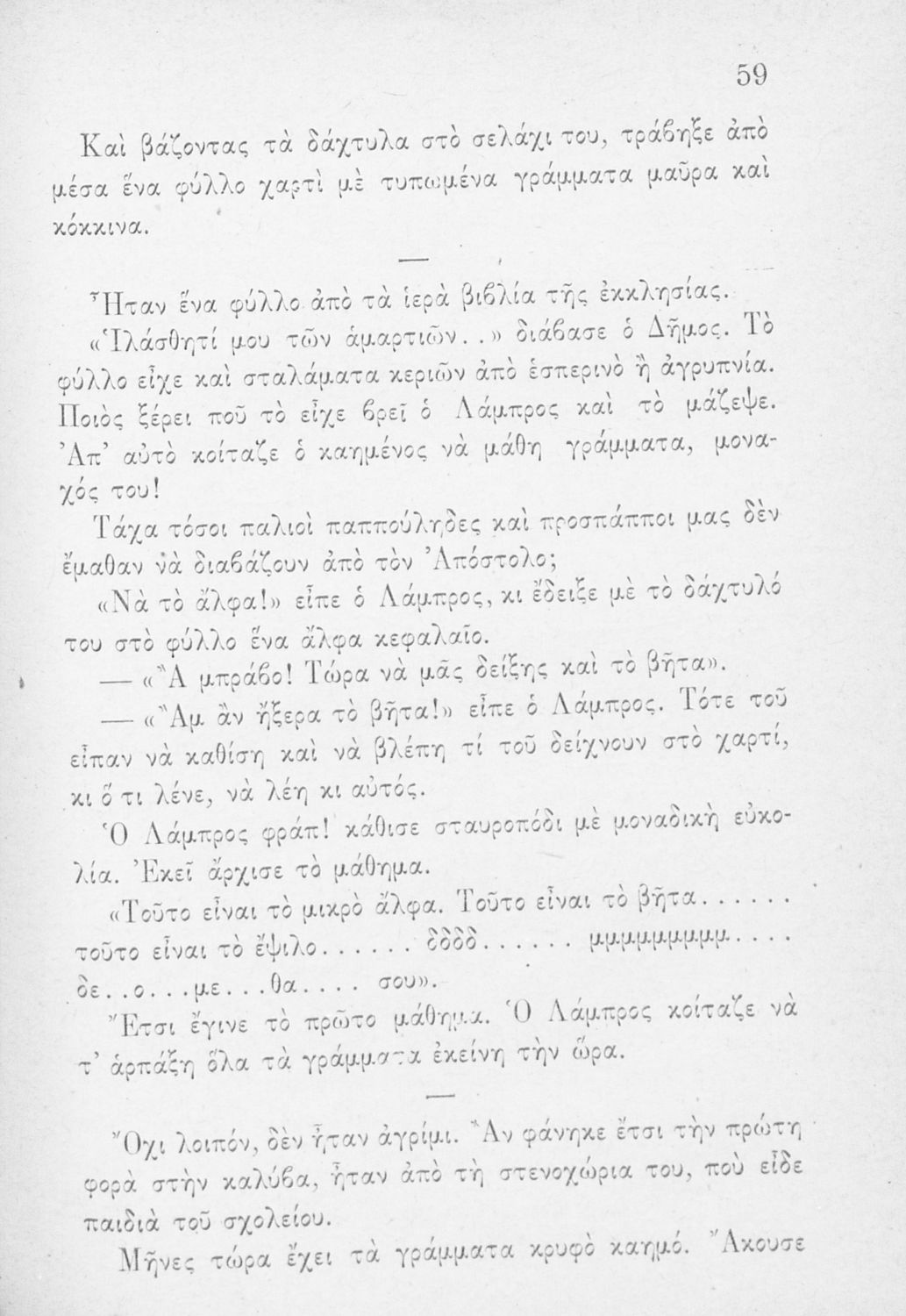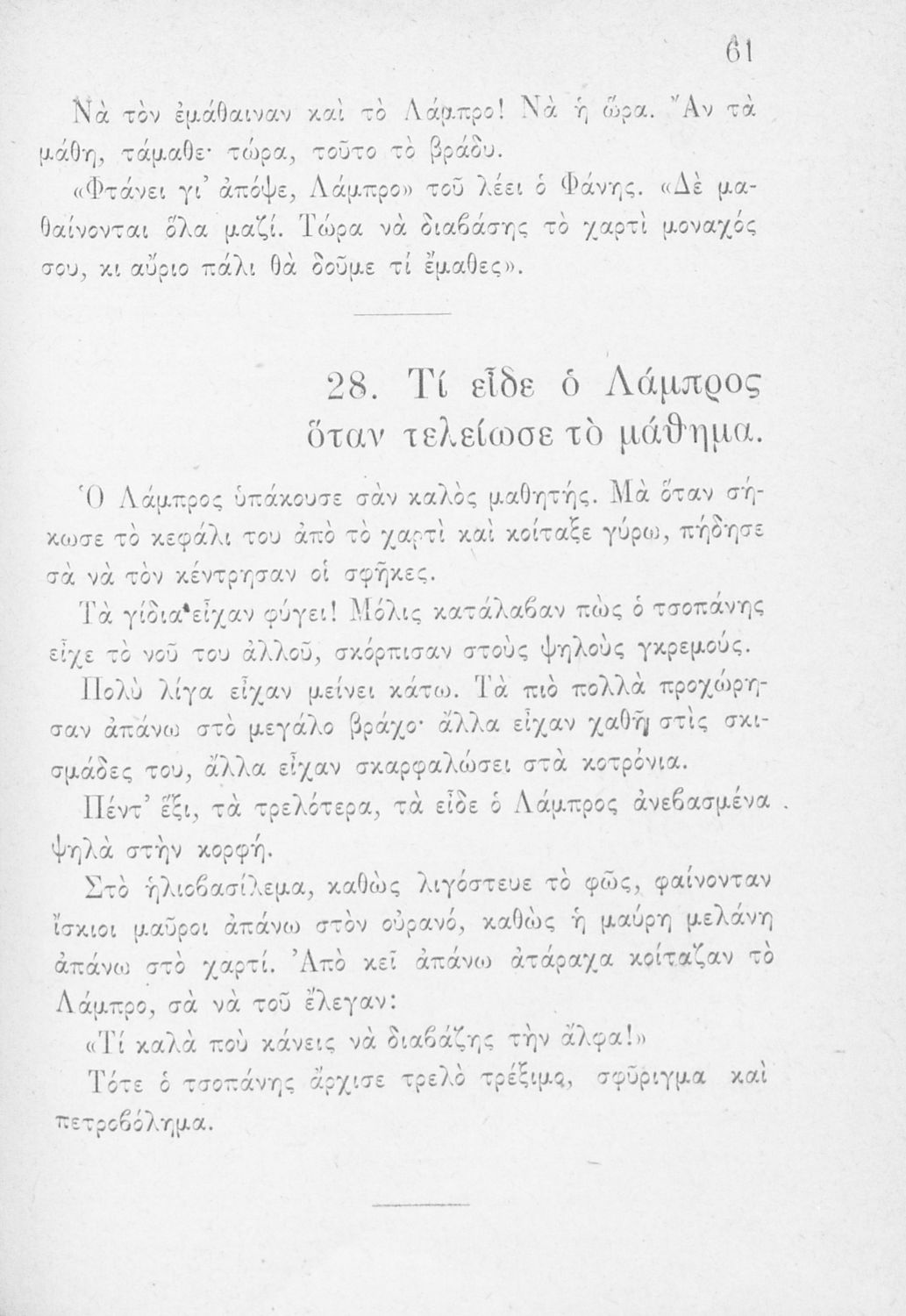 Το εγχειρίδιο ήταν αναγνωστικό για την Γ΄ Δημοτικού. Περιλαμβάνει μια αφηγηματική ιστορία, η οποία εμπεριέχει ηθικά διδάγματα για την ηθικοπλαστική καλλιέργεια των μαθητών. Η γλώσσα είναι δημοτική και το ύφος απλό. Στο παράρτημα περιλαμβάνει ποιήματα και τραγούδια.
