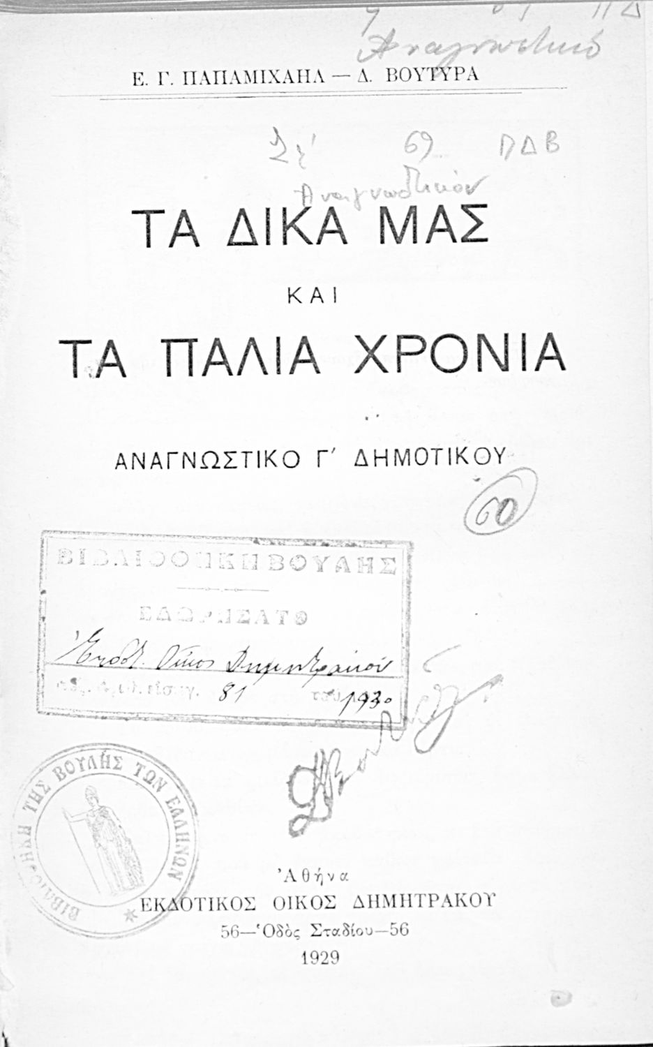 Εκδότης: Δημητράκος Έτος έκδοσης: 1929 Τόπος έκδοσης: Αθήνα Υπουργική απόφαση / Σύμβαση: 44451/10-9-1929 Έτος έγκρισης: 1929 |