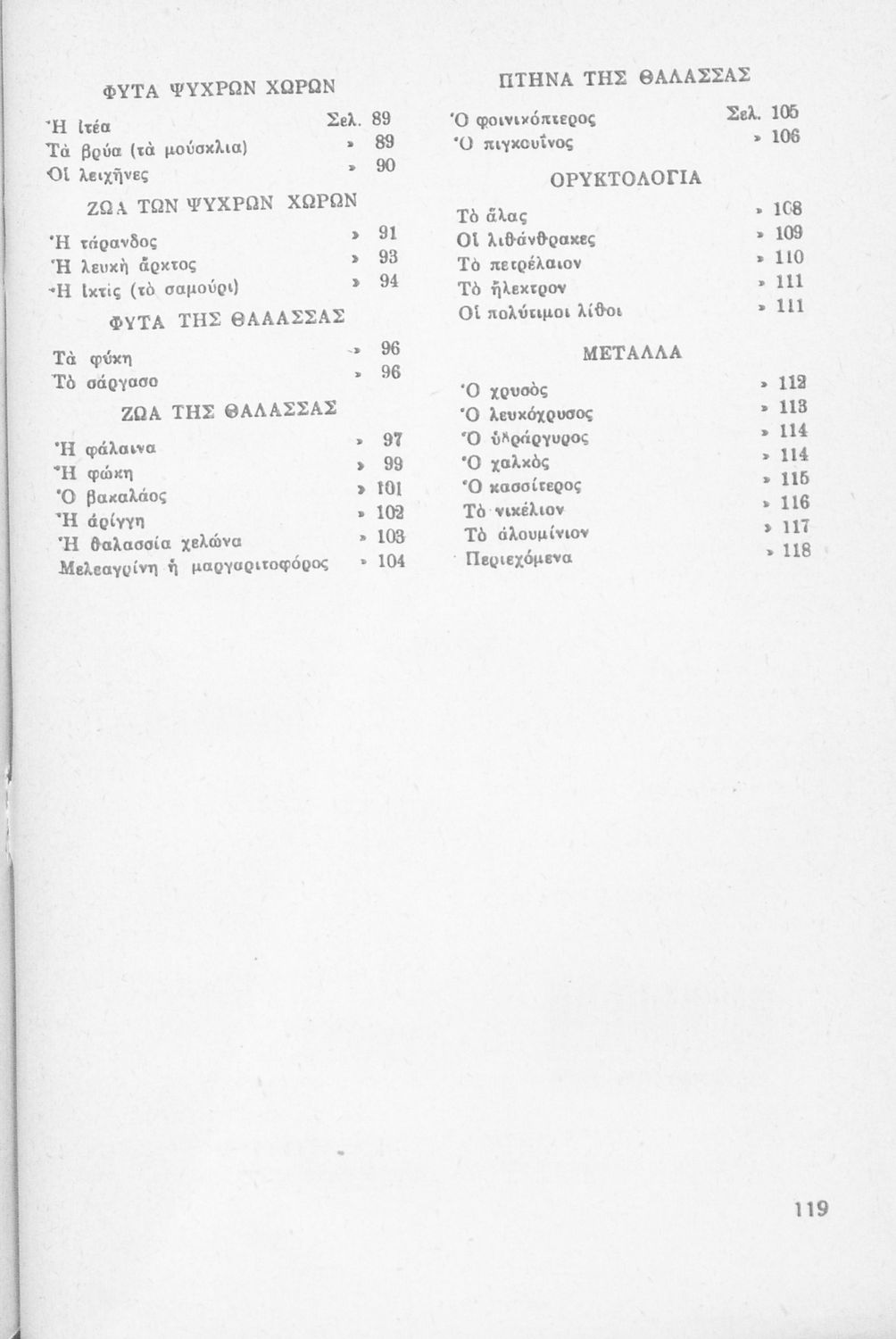 Σχολικό εγχειρίδιο της Ε' Τάξις Δημοτικού για το μάθημα της Φυσικής Ιστορίας. Περιέχει τα χαρακτηριστικά και τα γνωρίσματα των φυτών και των ζώων των θερμών,εύκρατων και ψυχρών χωρών. Επίσης, αναφέρεται στον θαλάσσιο πλούτο και την ορυκτολογία και τα μέταλλα.