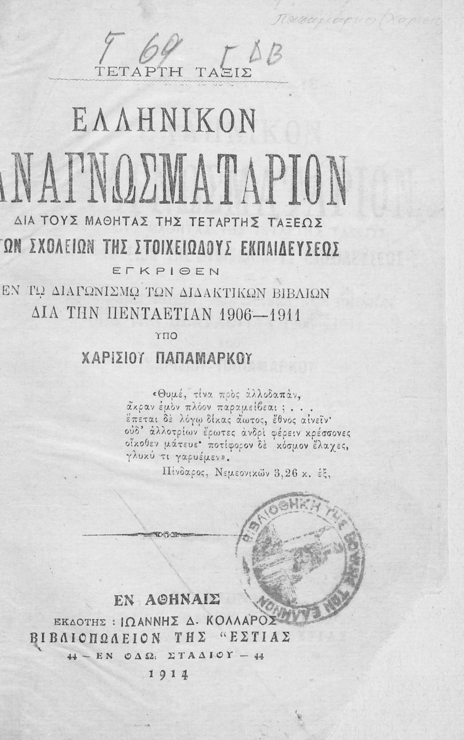 Εκδότης: Ιωάννης Δ. Κολλάρος, Βιβλιοπωλείο της "Εστίας" Έτος έκδοσης: 1914 Τόπος έκδοσης: Αθήνα Υπουργική απόφαση / Σύμβαση: 7361/15-5-1906 Έτος έγκρισης: 1906 |