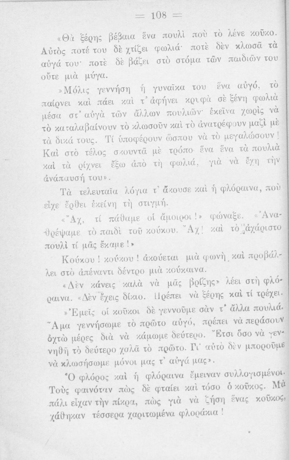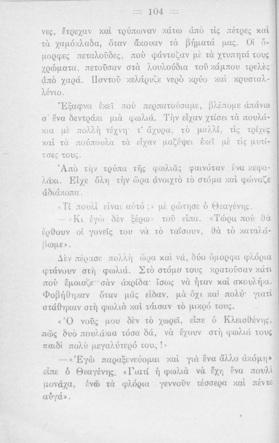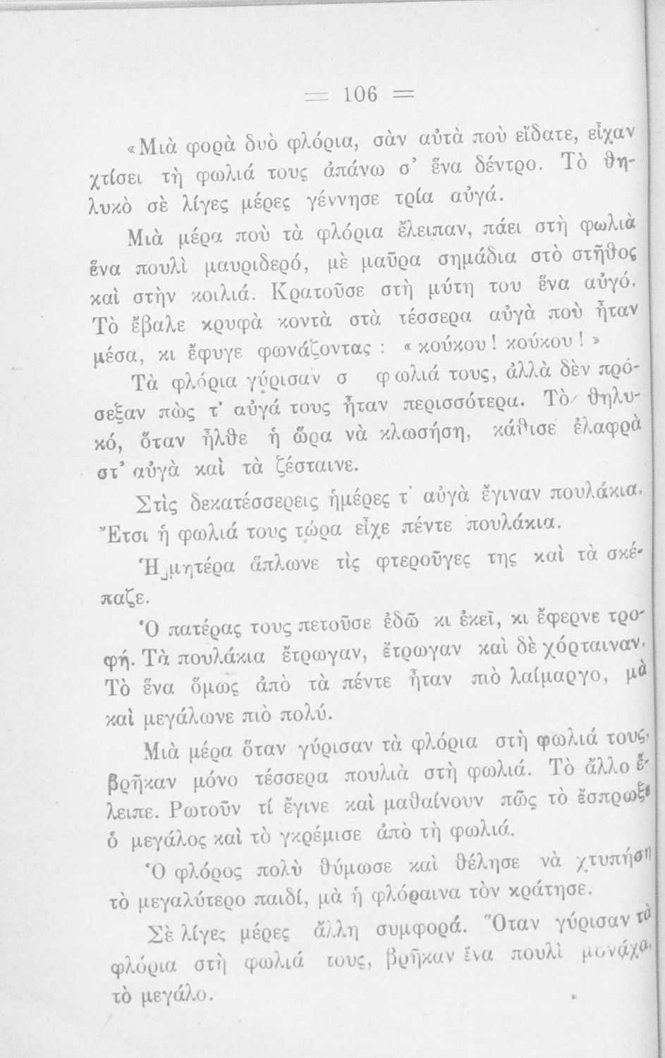 Αναγνωστικό Δ' Δημοτικού για το μάθημα της Γλώσσας. Περιέχει πεζά και ποιήματα, με περιεχόμενο πατριωτικό και ηθικοπλαστικό. Η γλώσσα είναι δημοτική και το ύφος είναι απλό. Περιέχει εικόνες, οι οποίες οπτικοποιούν τα κείμενα. Στο τέλος έχει παρτιτούρες.