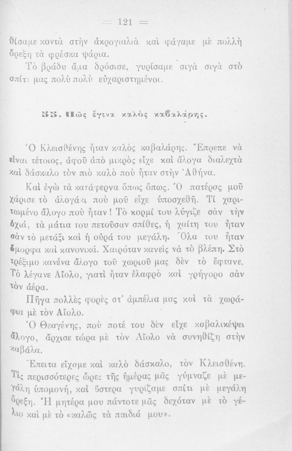 LDR 01319 2200205 4500 035 ## _a03-20561300 040 ## _aΒιβλιοθήκη της Βουλής των Ελλήνων 041 ## _ael 100 ## _aΑ. Κουρτίδης _aΓ. Κονιδάρης 110 ## _a20561300 245 0# _aΣτα παλαιά χρόνια. Αναγνωστικό Δ΄ Δημοτικού 250 ## _a6η Έκδοση 260 ## _aΑθήνα _bΙωάννης Δ. Κολλάρος και ΣΙΑ, Βιβλιοπωλείο της "Εστίας" _c1926 300 ## _a256 _bΣκίτσα, εικόνες (ασπρόμαυρα) 520 ## _aΑναγνωστικό Δ' Δημοτικού για το μάθημα της Γλώσσας. Περιέχει πεζά και ποιήματα, με περιεχόμενο πατριωτικό και ηθικοπλαστικό. Η γλώσσα είναι δημοτική και το ύφος είναι απλό. Περιέχει εικόνες, οι οποίες οπτικοποιούν τα κείμενα. Στο τέλος έχει παρτιτούρες. 521 ## _aΔ' Δημοτικού 522 ## _aΕλλάδα 546 ## _aΔημοτική 563 ## _aΣκληρό Εξώφυλλο 650 #4 _aΑναγνωστικό _aΓλώσσα _aΙστορίες _aΚείμενα _aΠαιδιά _aΠεζά