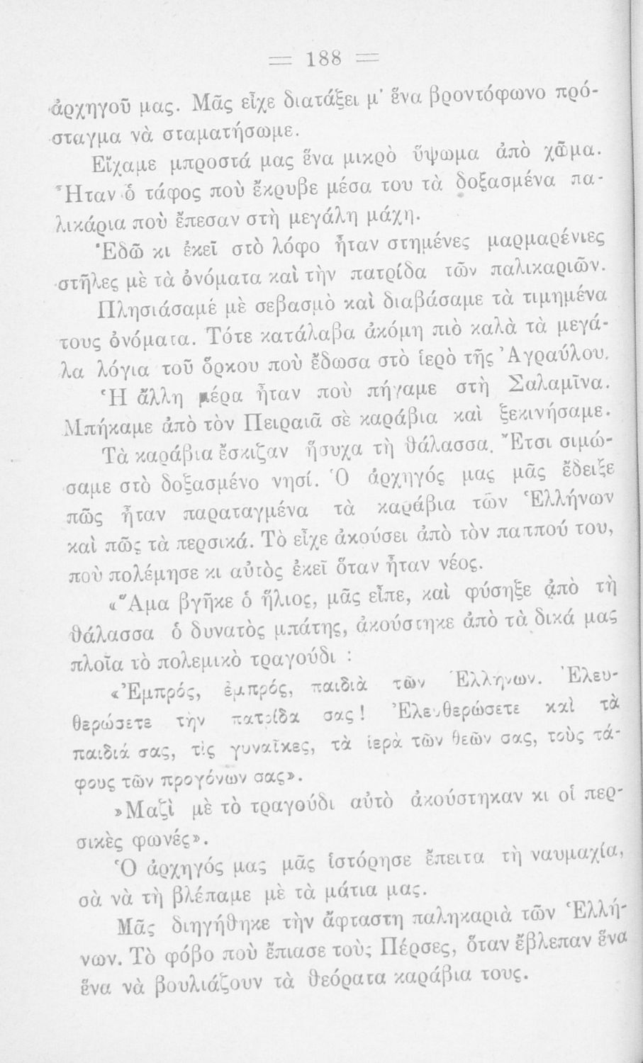 Αναγνωστικό Δ' Δημοτικού για το μάθημα της Γλώσσας. Περιέχει πεζά και ποιήματα, με περιεχόμενο πατριωτικό και ηθικοπλαστικό. Η γλώσσα είναι δημοτική και το ύφος είναι απλό. Περιέχει εικόνες, οι οποίες οπτικοποιούν τα κείμενα. Στο τέλος έχει παρτιτούρες.