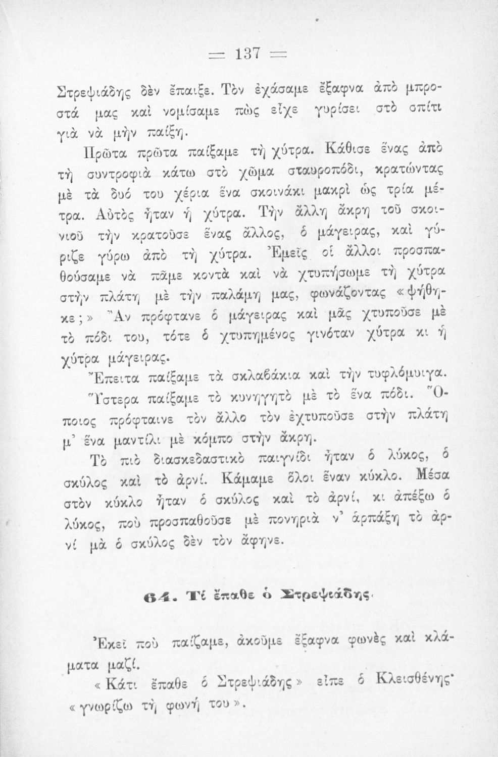 LDR 01315 2200205 4500 035 ## _a03-20561301 040 ## _aΒιβλιοθήκη της Βουλής των Ελλήνων 041 ## _ael 100 ## _aΑ. Κουρτίδης _aΓ. Κονιδάρης 110 ## _a20561301 245 0# _aΣτα παλαιά χρόνια. Αναγνωστικό Δ΄ Δημοτικού 250 ## _a5η Έκδοση 260 ## _aΑθήνα _bΙωάννης Δ. Κολλάρος και ΣΙΑ, Βιβλιοπωλείο της "Εστίας" _c1925 300 ## _a256 _bΣκίτσα, εικόνες (ασπρόμαυρα) 520 ## _aΑναγνωστικό Δ' Δημοτικού για το μαθήματα της Γλώσσας. Περιλαμβάνει πεζά και ποιήματα με περιεχόμενο από την οικογενειακή και κοινωνική ζωή. Τα ποιήματα έχουν εθνικό και πατριωτικό περιεχόμενο. Στο τέλος του βιβλίου υπάρχουν παρτιτούρες τραγουδιών. 521 ## _aΔ' Δημοτικού 522 ## _aΕλλάδα 546 ## _aΔημοτική 563 ## _aΣκληρό Εξώφυλλο 650 #4 _aΓλώσσα _aΔιηγήματα _aΠατρίδα _aΠεζά _aΠοιήματα _aΤραγούδια