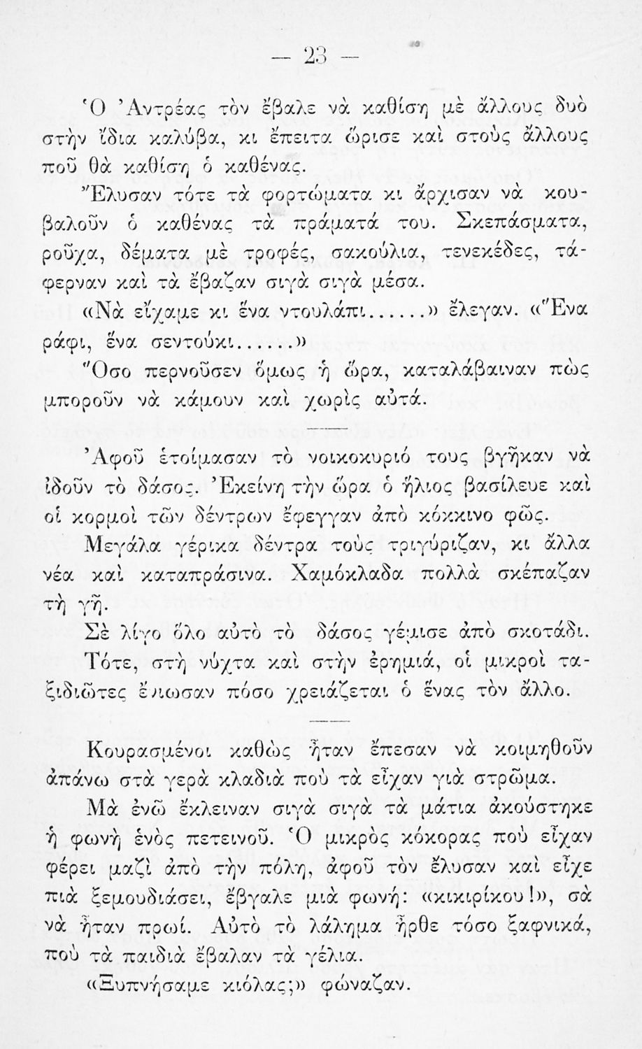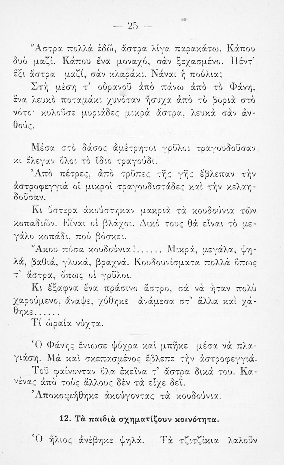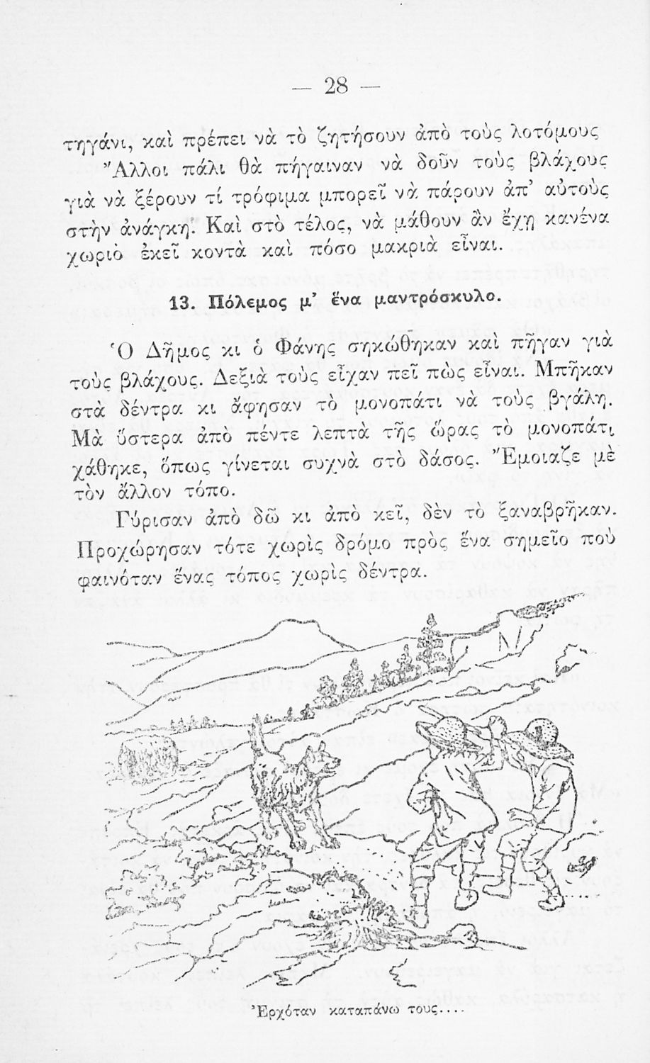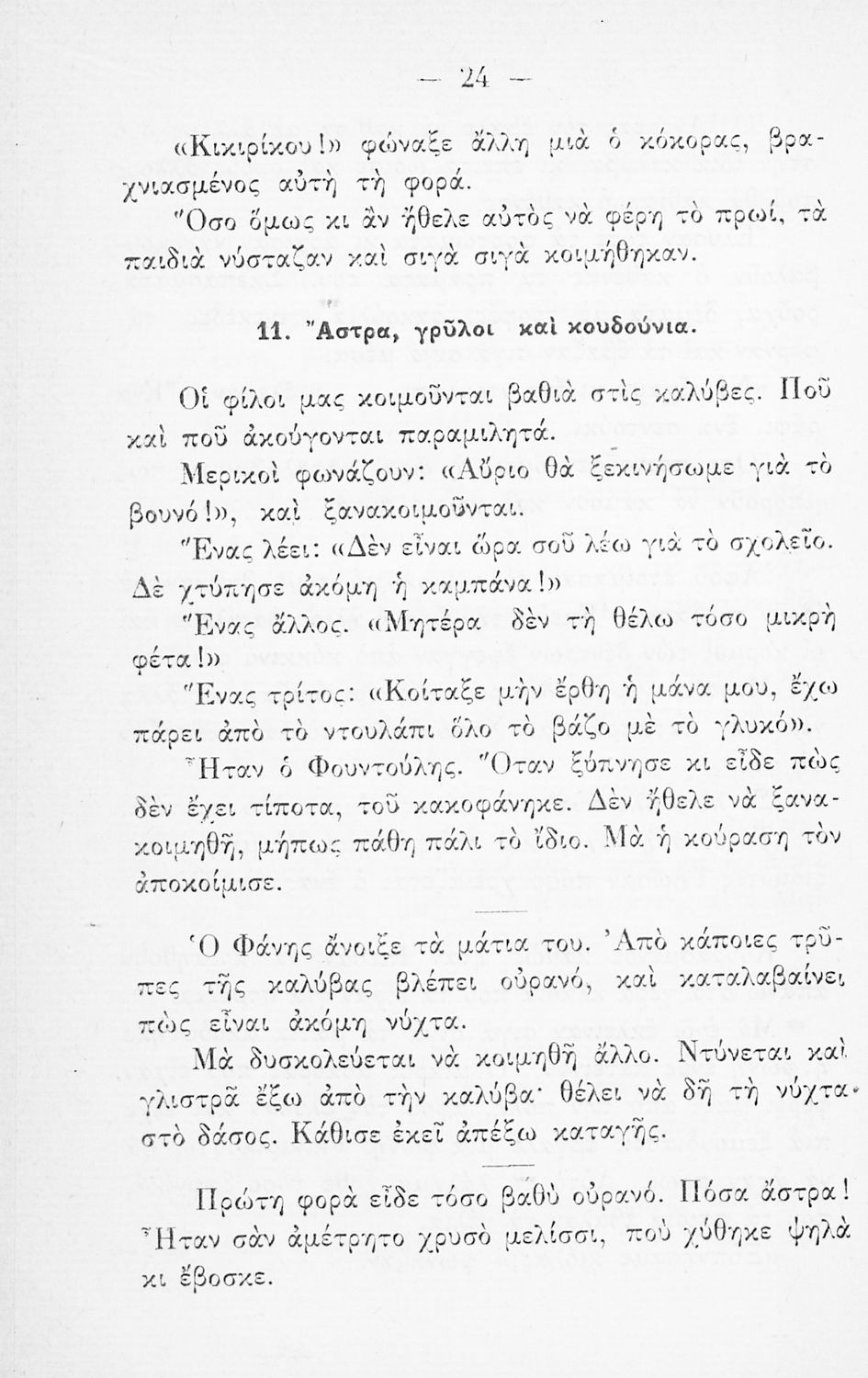 Αναγνωστικό για την Γ΄ Δημοτικού. Περιλαμβάνει μια αφηγηματική ιστορία, η οποία εμπεριέχει ηθικά διδάγματα για την ηθικοπλαστική καλλιέργεια των μαθητών. Η γλώσσα είναι δημοτική και το ύφος απλό. Στο παράρτημα περιλαμβάνει ποιήματα και τραγούδια.