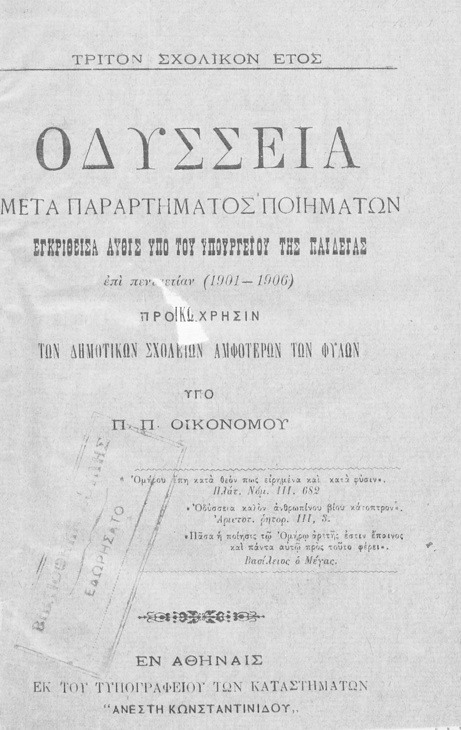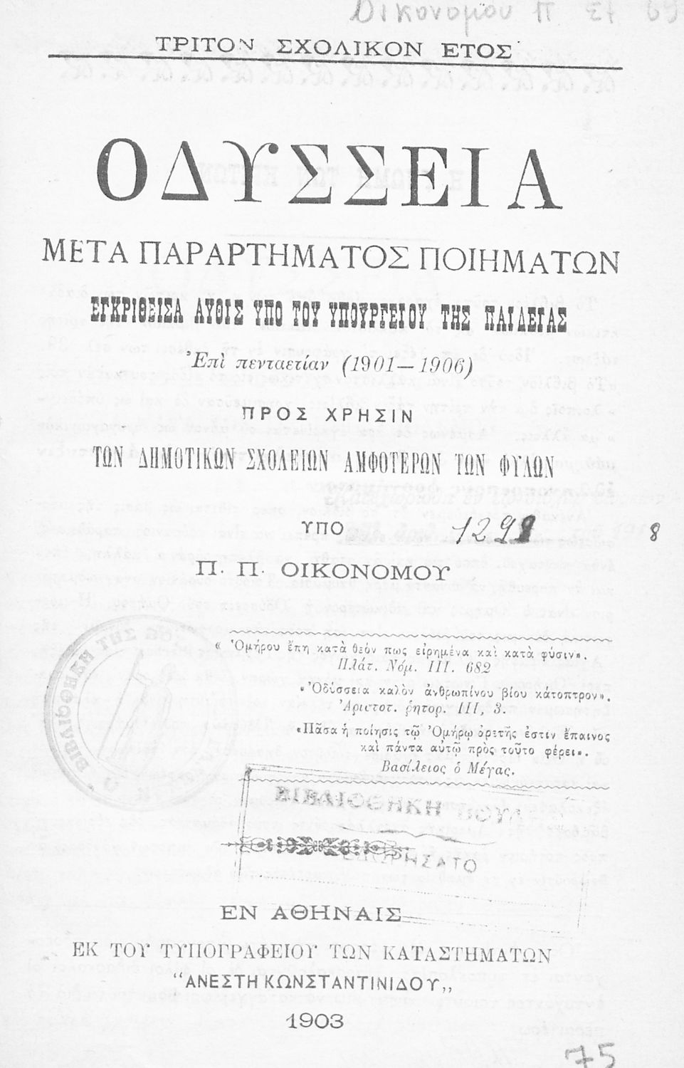 Κωδικός αναγνώρισης: 03-20561307 Τίτλος: Οδύσσεια μετά παραρτήματος ποιημάτων. Προς χρήσιν των Δημοτικών Σχολείων αμφότερων φύλων Συγγραφέας: Π. Π Οικονόμος Μέγεθος και υπόστρωμα: Μαθητικό βοήθημα, σκληρό εξώφυλλο, 145 σελίδες. Σκίτσα, εικόνες (ασπρόμαυρα). |
