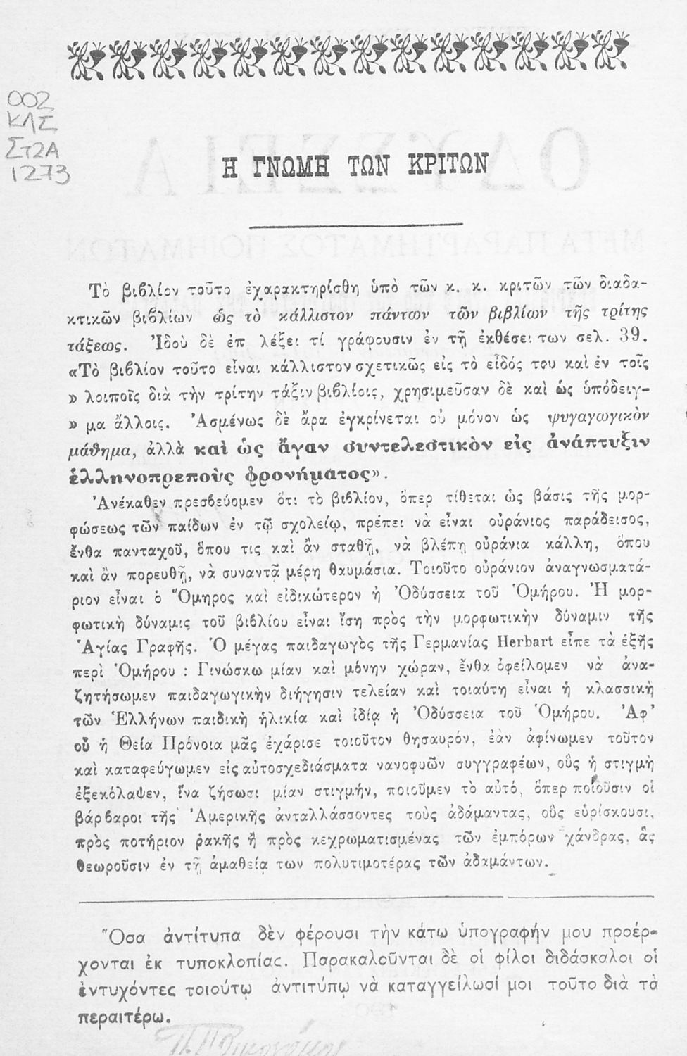 Έτος έκδοσης: 1903 Τόπος έκδοσης: Αθήνα Υπουργική απόφαση / Σύμβαση: 7704/19-5-1901 Έτος έγκρισης: 1901 |