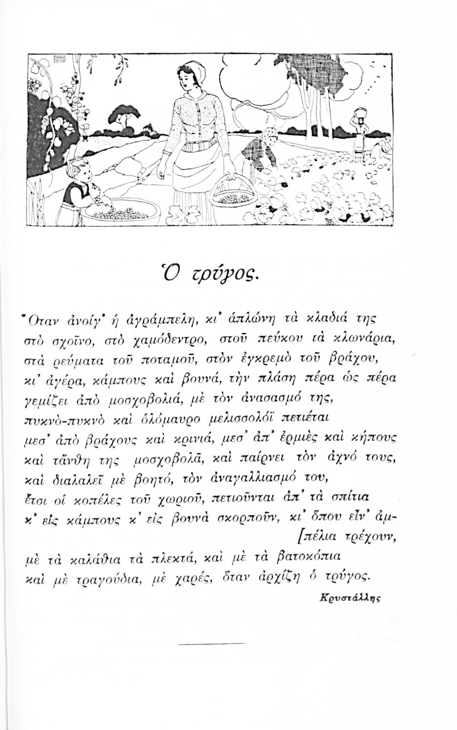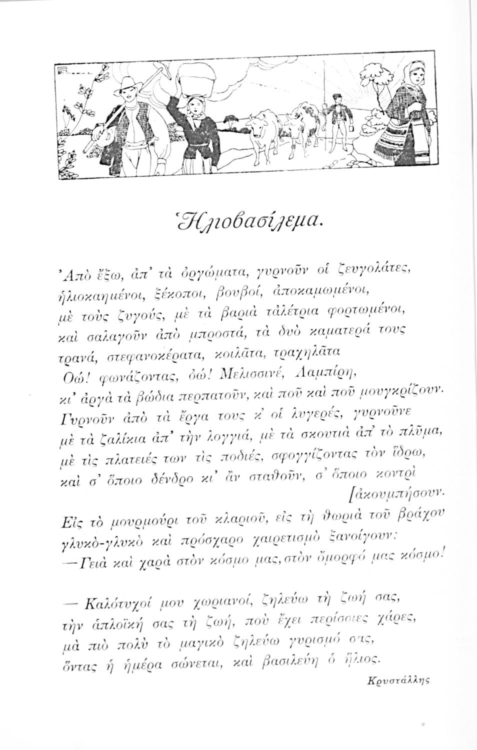Αναγνωστικό Γ' Δημοτικού που είναι χωρισμένο σύμφωνα με τις εποχές του χρόνου και περιλαμβάνει ποιήματα και πεζά εμπνευσμένα από τη ζωή στην ύπαιθρο, την εθνική, οικογενειακή και κοινωνική ζωή, τη θρησκευτική ...